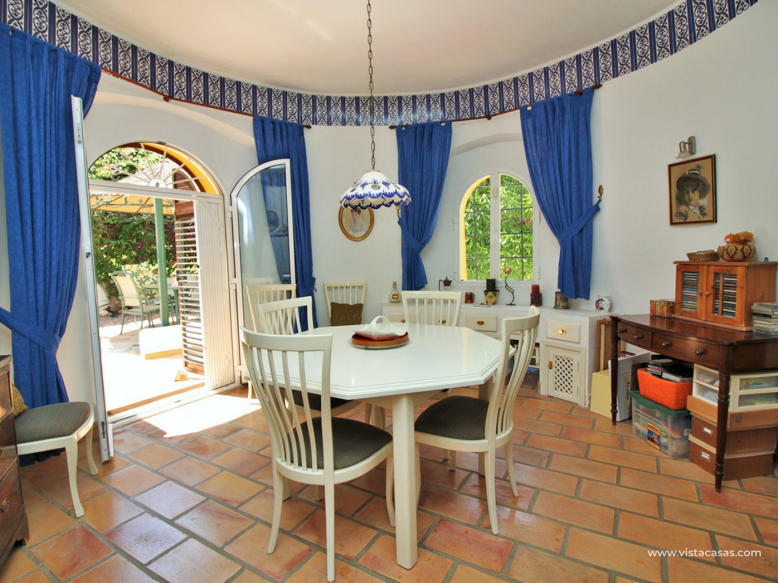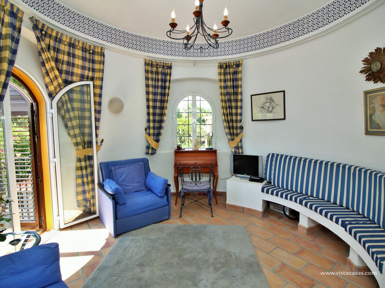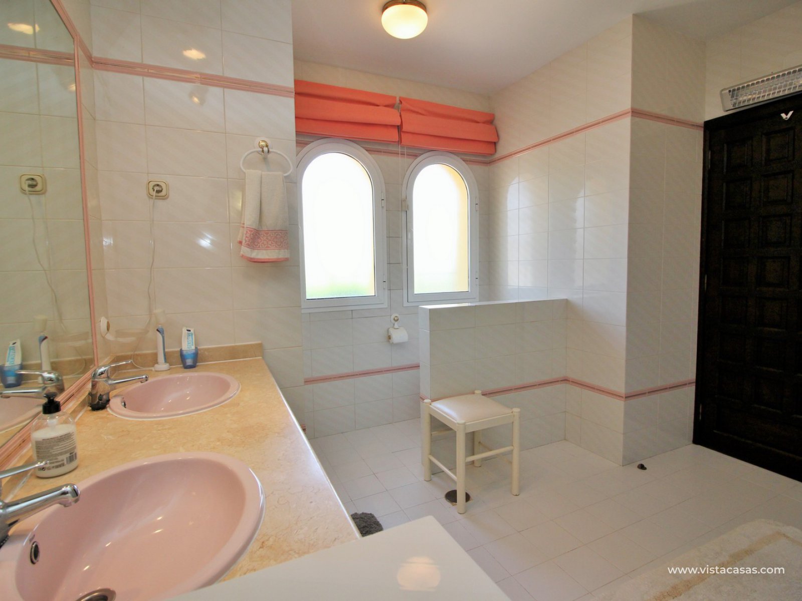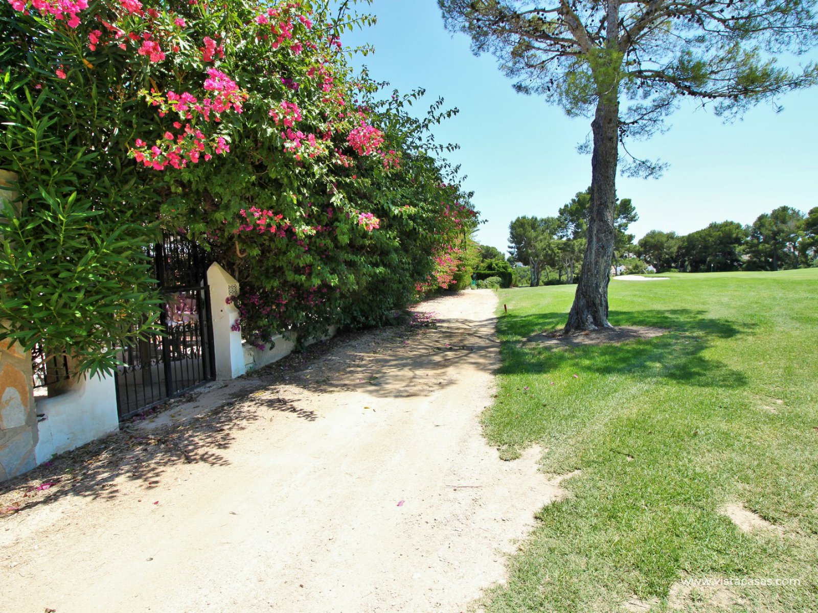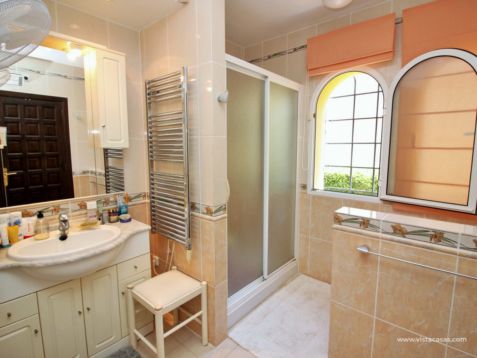 Beautiful first-line golf Mediterranean style villa directly facing the Villamartin golf course with access to the golf course from the garden. You enter the property into a large entrance hall which leads into the open lounge area with fireplace and a lovely circular dining room. There is a separate kitchen with high ceilings and a good size utility room. There are 3 bedrooms which are all located on the ground floor, with 2 of them benefitting from en-suite bathrooms, and direct access to the pool and garden area. The master bedroom also has a walk-in wardrobe. Upstairs there is a round shaped tower room with a Juliet balcony, and a roof solarium offering stunning views of the Villamartin golf course. This tower room could serve as a 4th bedroom if desired. The villa has a large garden that wraps around the entire property and offers a private pool, covered porch area with built-in BBQ, 2 seating areas with gazebo, and gated off-road parking with garage. There is a gate located at the rear of the garden with a covered parking area for a golf buggy that leads directly onto the Villamartin golf course.