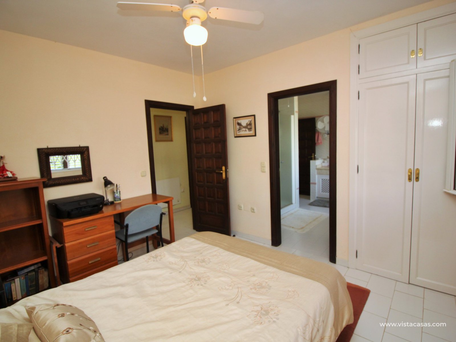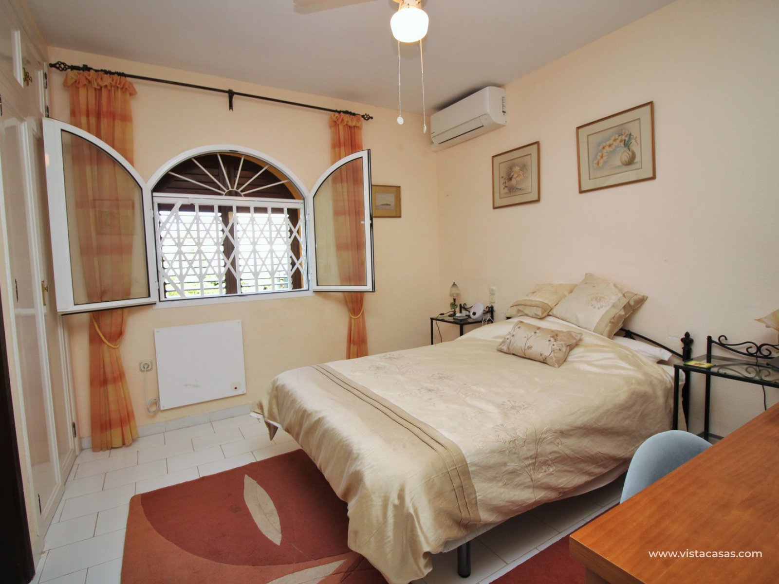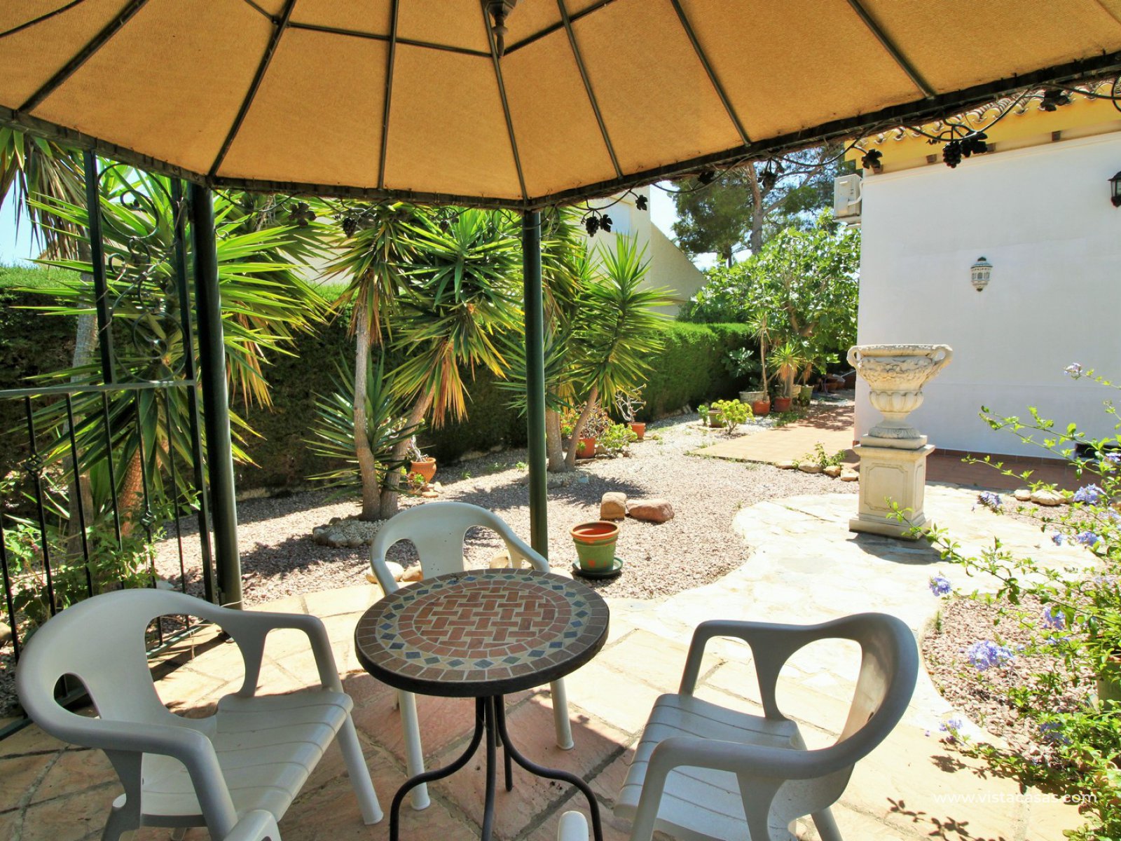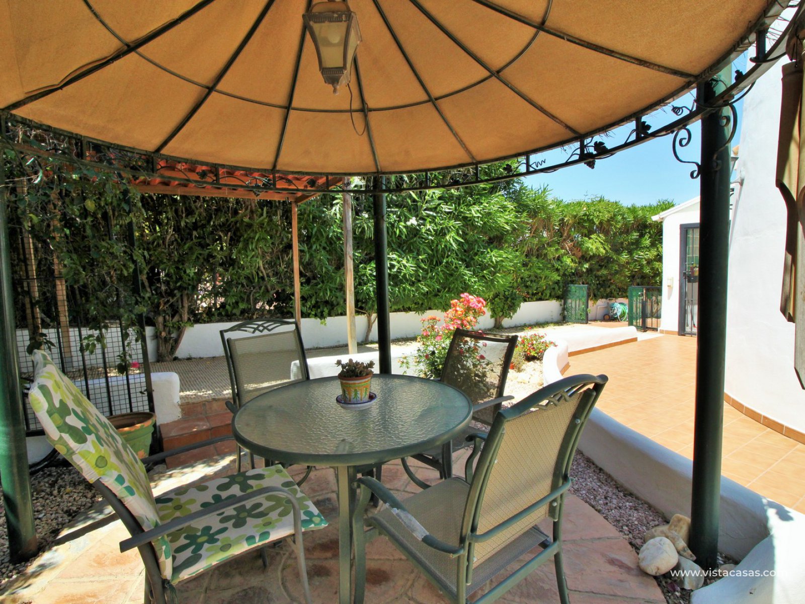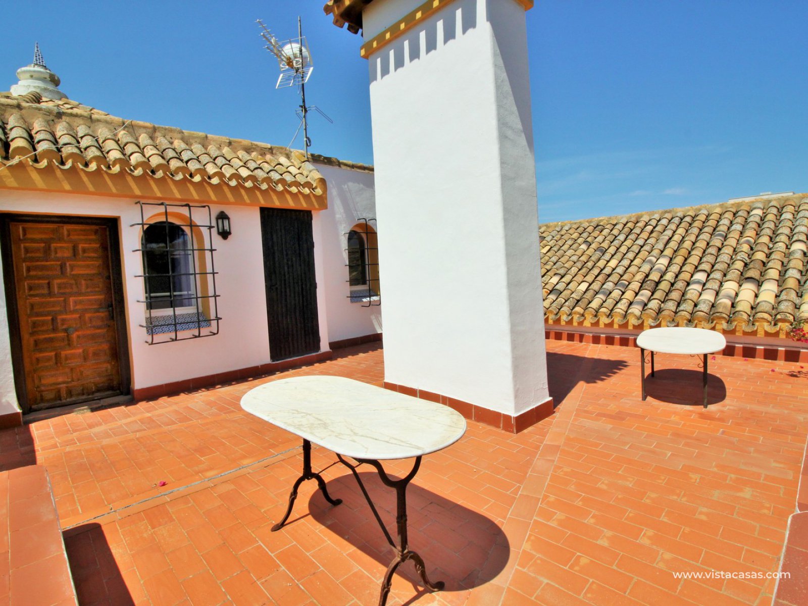 Beautiful first-line golf Mediterranean style villa directly facing the Villamartin golf course with access to the golf course from the garden. You enter the property into a large entrance hall which leads into the open lounge area with fireplace and a lovely circular dining room. There is a separate kitchen with high ceilings and a good size utility room. There are 3 bedrooms which are all located on the ground floor, with 2 of them benefitting from en-suite bathrooms, and direct access to the pool and garden area. The master bedroom also has a walk-in wardrobe. Upstairs there is a round shaped tower room with a Juliet balcony, and a roof solarium offering stunning views of the Villamartin golf course. This tower room could serve as a 4th bedroom if desired. The villa has a large garden that wraps around the entire property and offers a private pool, covered porch area with built-in BBQ, 2 seating areas with gazebo, and gated off-road parking with garage. There is a gate located at the rear of the garden with a covered parking area for a golf buggy that leads directly onto the Villamartin golf course.