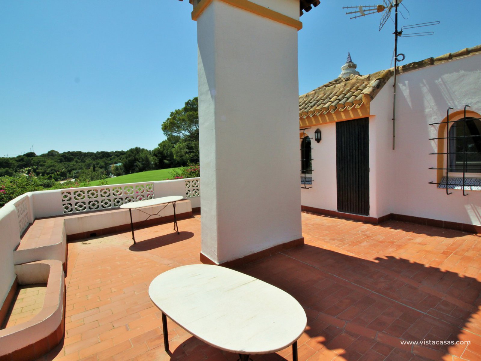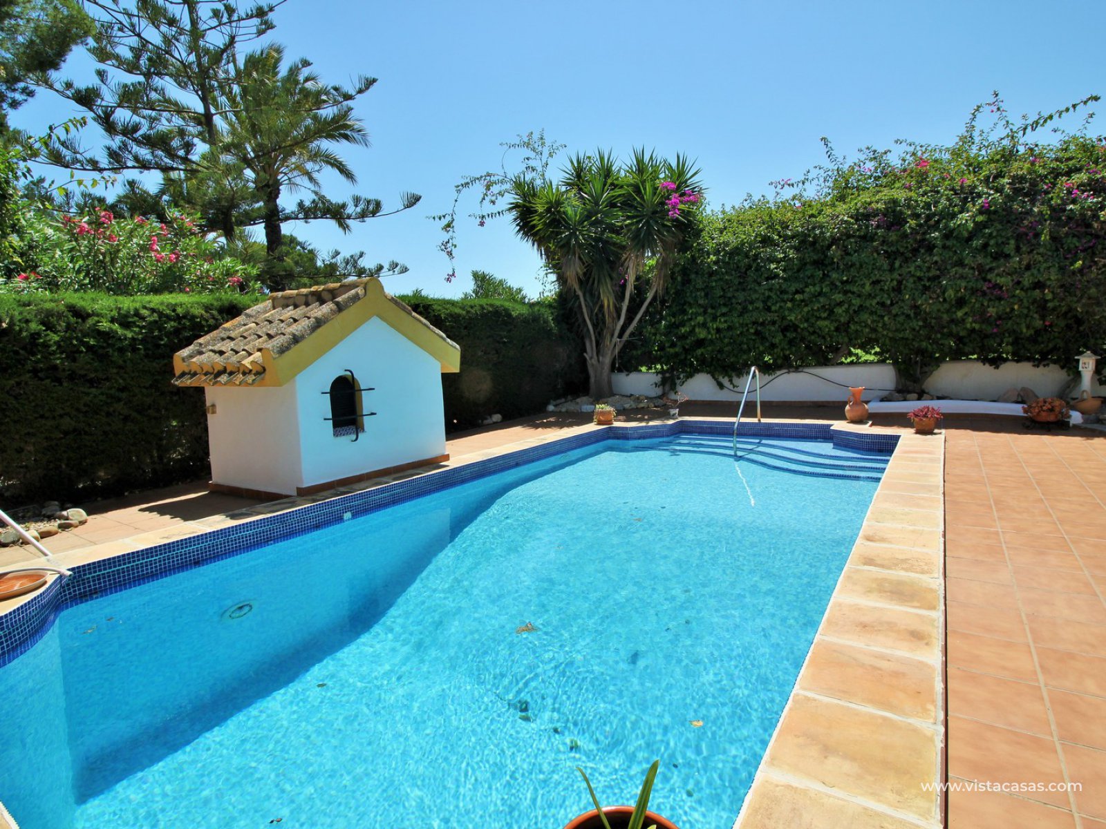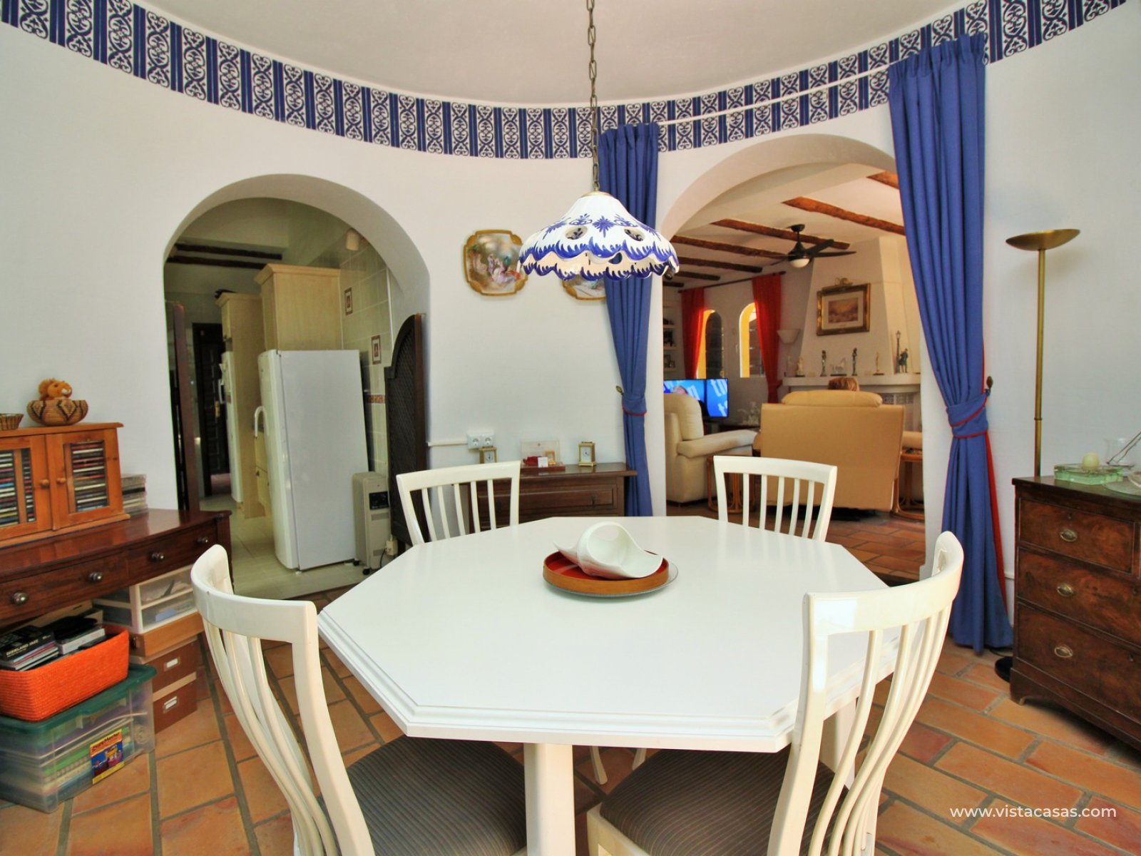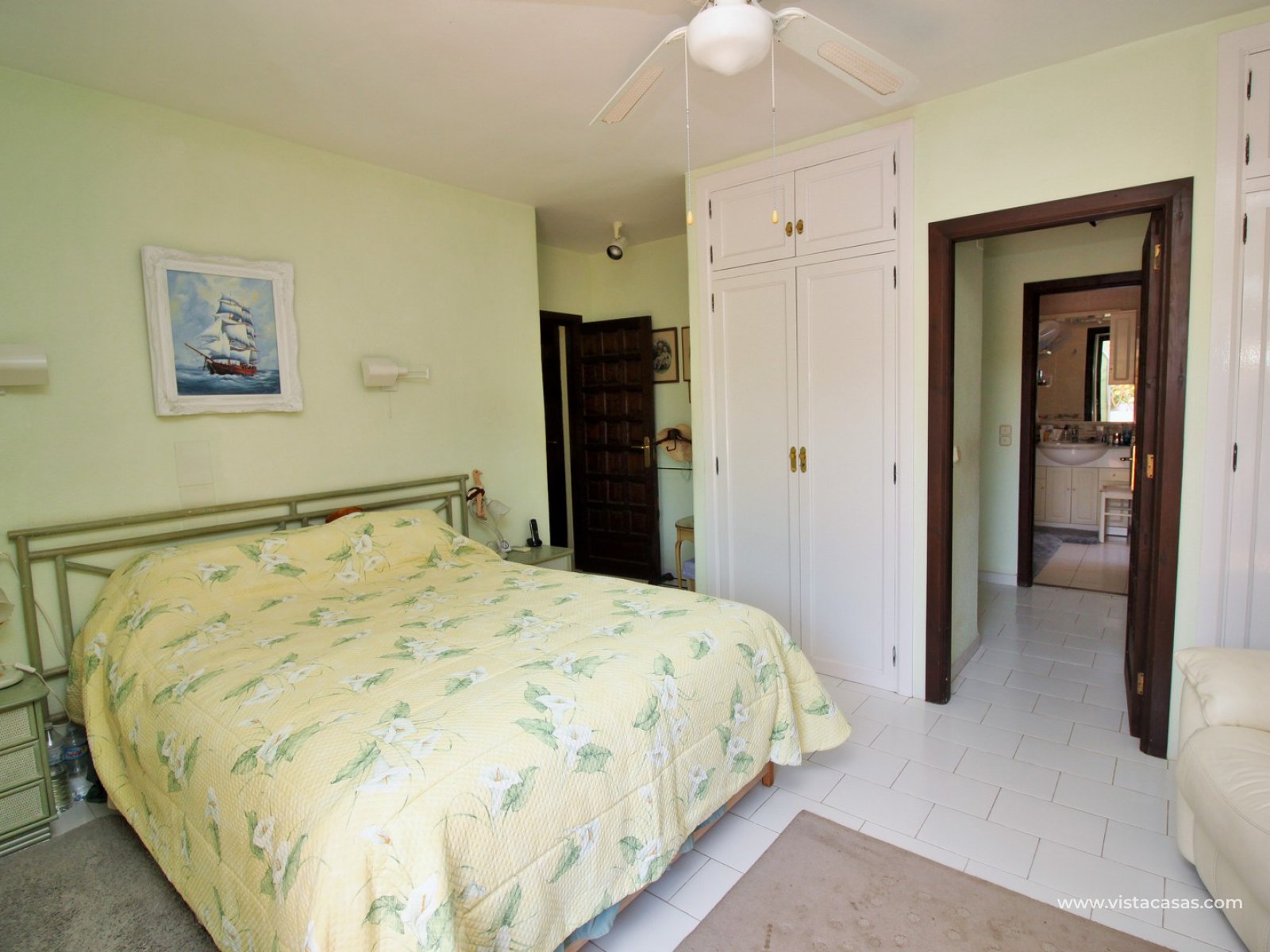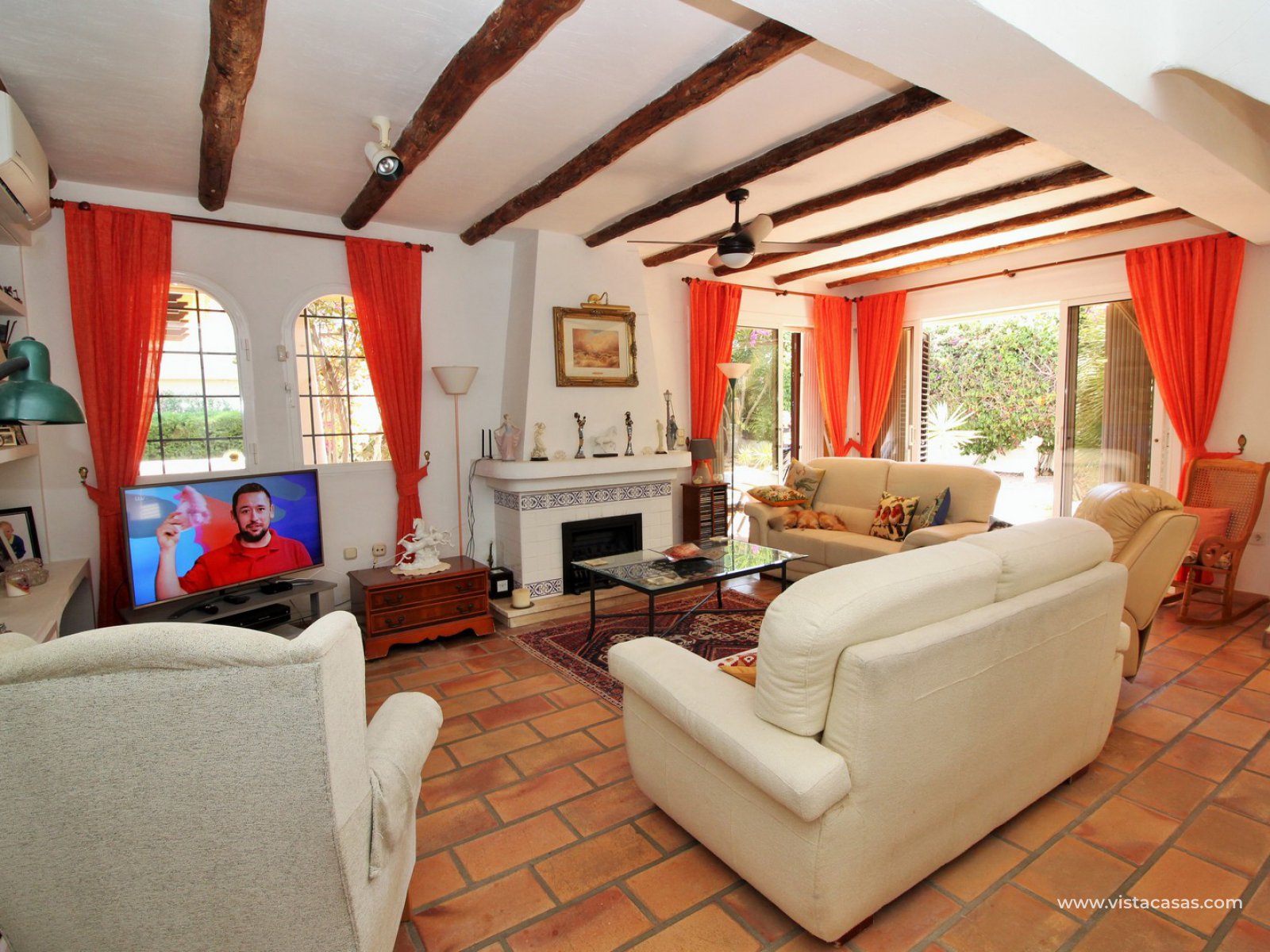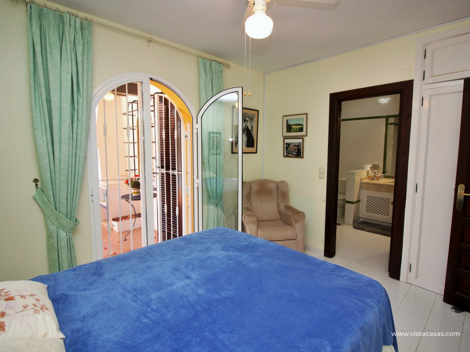 Beautiful first-line golf Mediterranean style villa directly facing the Villamartin golf course with access to the golf course from the garden. You enter the property into a large entrance hall which leads into the open lounge area with fireplace and a lovely circular dining room. There is a separate kitchen with high ceilings and a good size utility room. There are 3 bedrooms which are all located on the ground floor, with 2 of them benefitting from en-suite bathrooms, and direct access to the pool and garden area. The master bedroom also has a walk-in wardrobe. Upstairs there is a round shaped tower room with a Juliet balcony, and a roof solarium offering stunning views of the Villamartin golf course. This tower room could serve as a 4th bedroom if desired. The villa has a large garden that wraps around the entire property and offers a private pool, covered porch area with built-in BBQ, 2 seating areas with gazebo, and gated off-road parking with garage. There is a gate located at the rear of the garden with a covered parking area for a golf buggy that leads directly onto the Villamartin golf course.