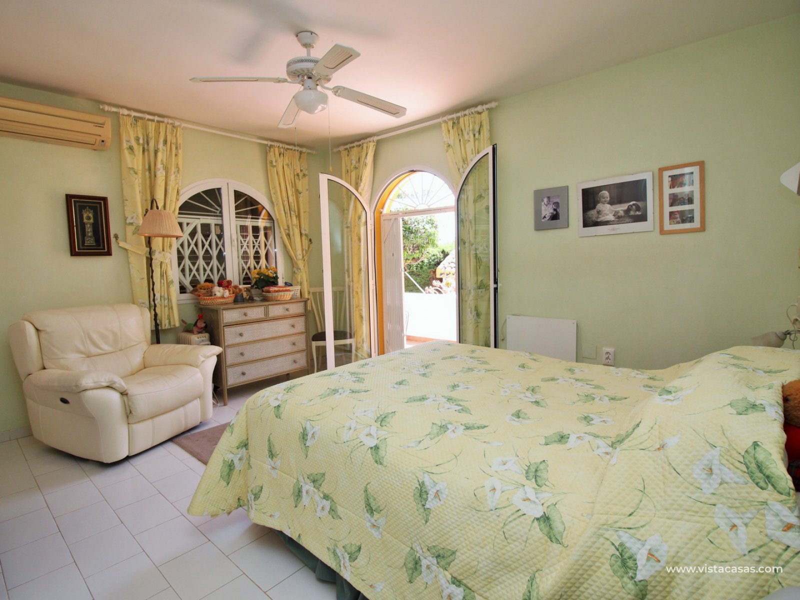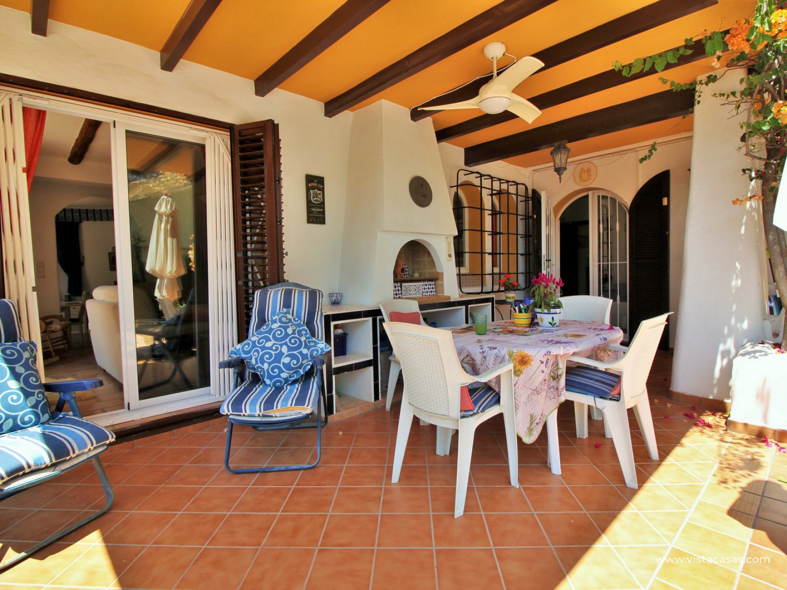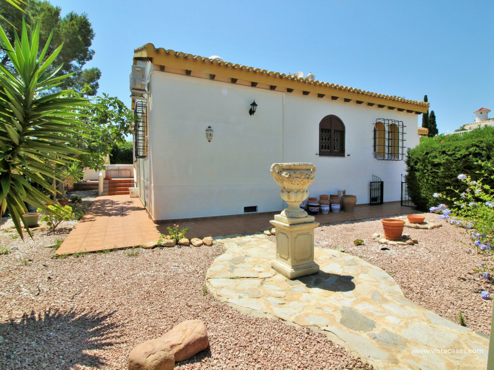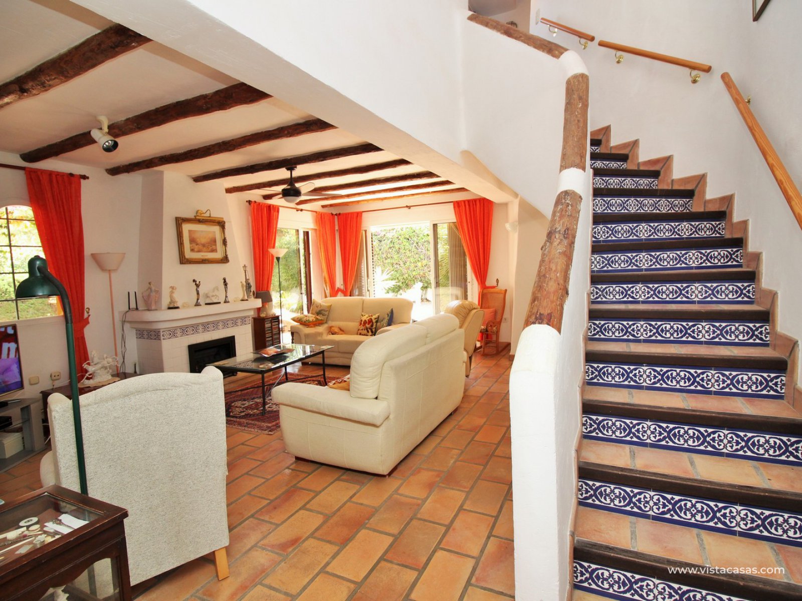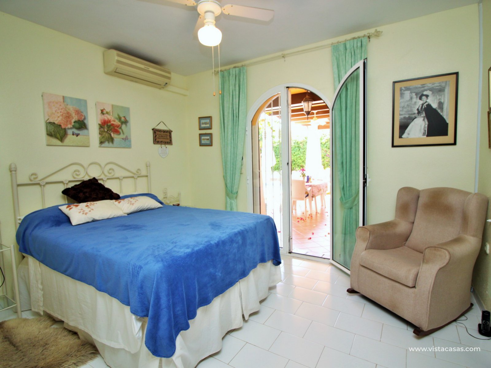 Beautiful first-line golf Mediterranean style villa directly facing the Villamartin golf course with access to the golf course from the garden. You enter the property into a large entrance hall which leads into the open lounge area with fireplace and a lovely circular dining room. There is a separate kitchen with high ceilings and a good size utility room. There are 3 bedrooms which are all located on the ground floor, with 2 of them benefitting from en-suite bathrooms, and direct access to the pool and garden area. The master bedroom also has a walk-in wardrobe. Upstairs there is a round shaped tower room with a Juliet balcony, and a roof solarium offering stunning views of the Villamartin golf course. This tower room could serve as a 4th bedroom if desired. The villa has a large garden that wraps around the entire property and offers a private pool, covered porch area with built-in BBQ, 2 seating areas with gazebo, and gated off-road parking with garage. There is a gate located at the rear of the garden with a covered parking area for a golf buggy that leads directly onto the Villamartin golf course.