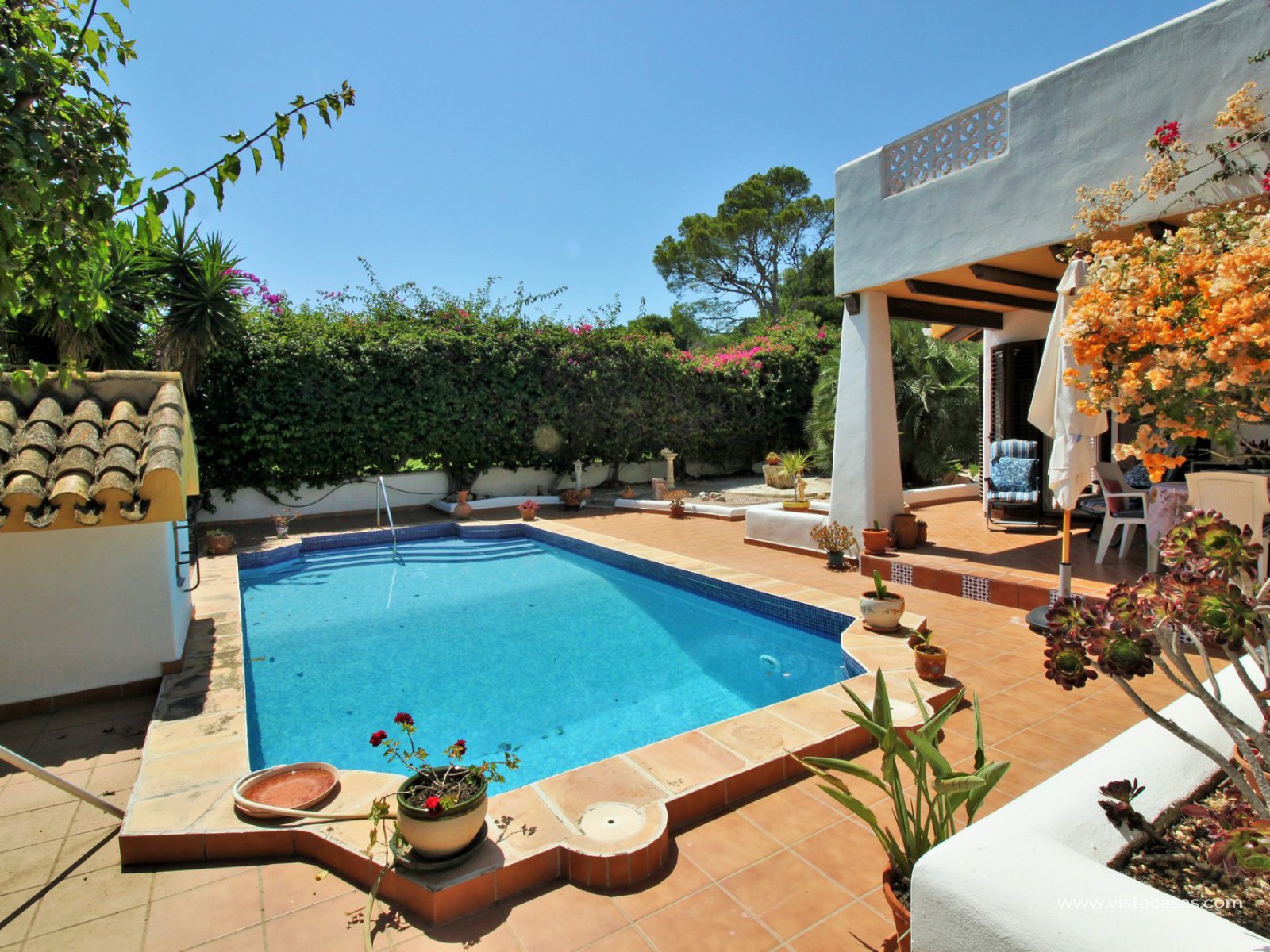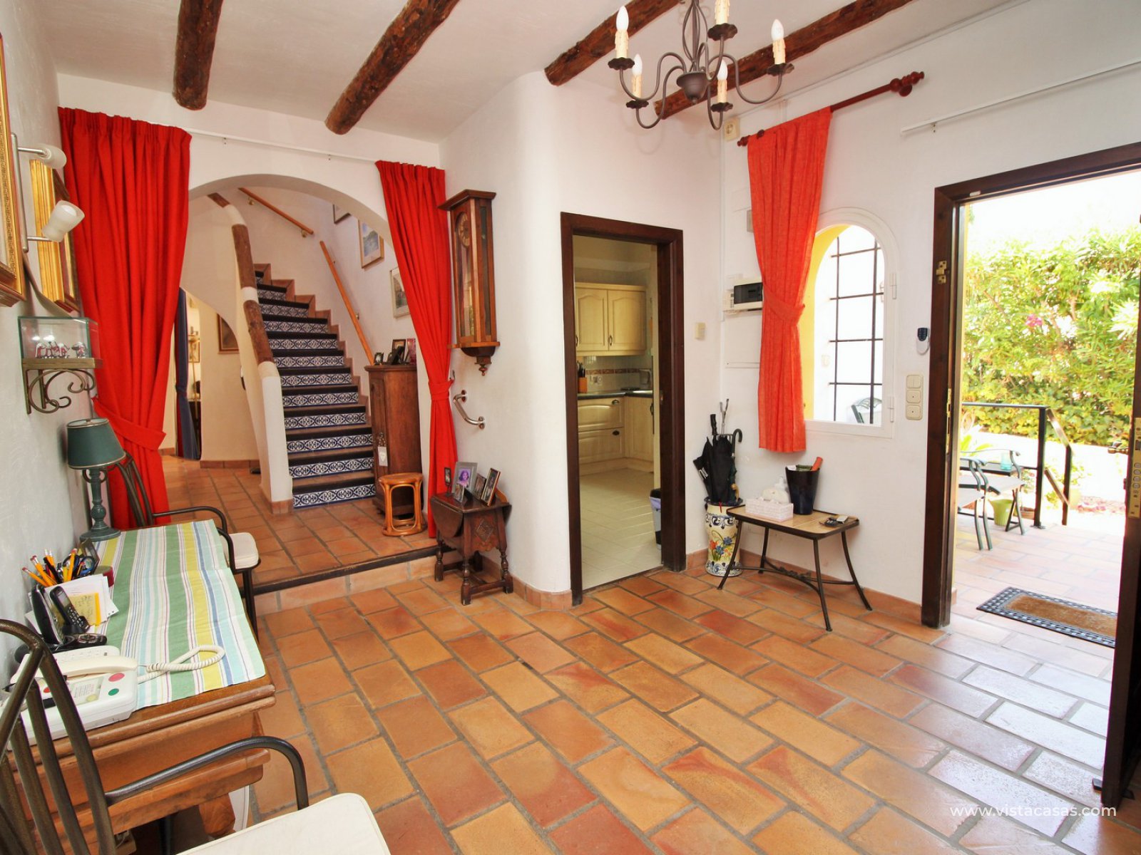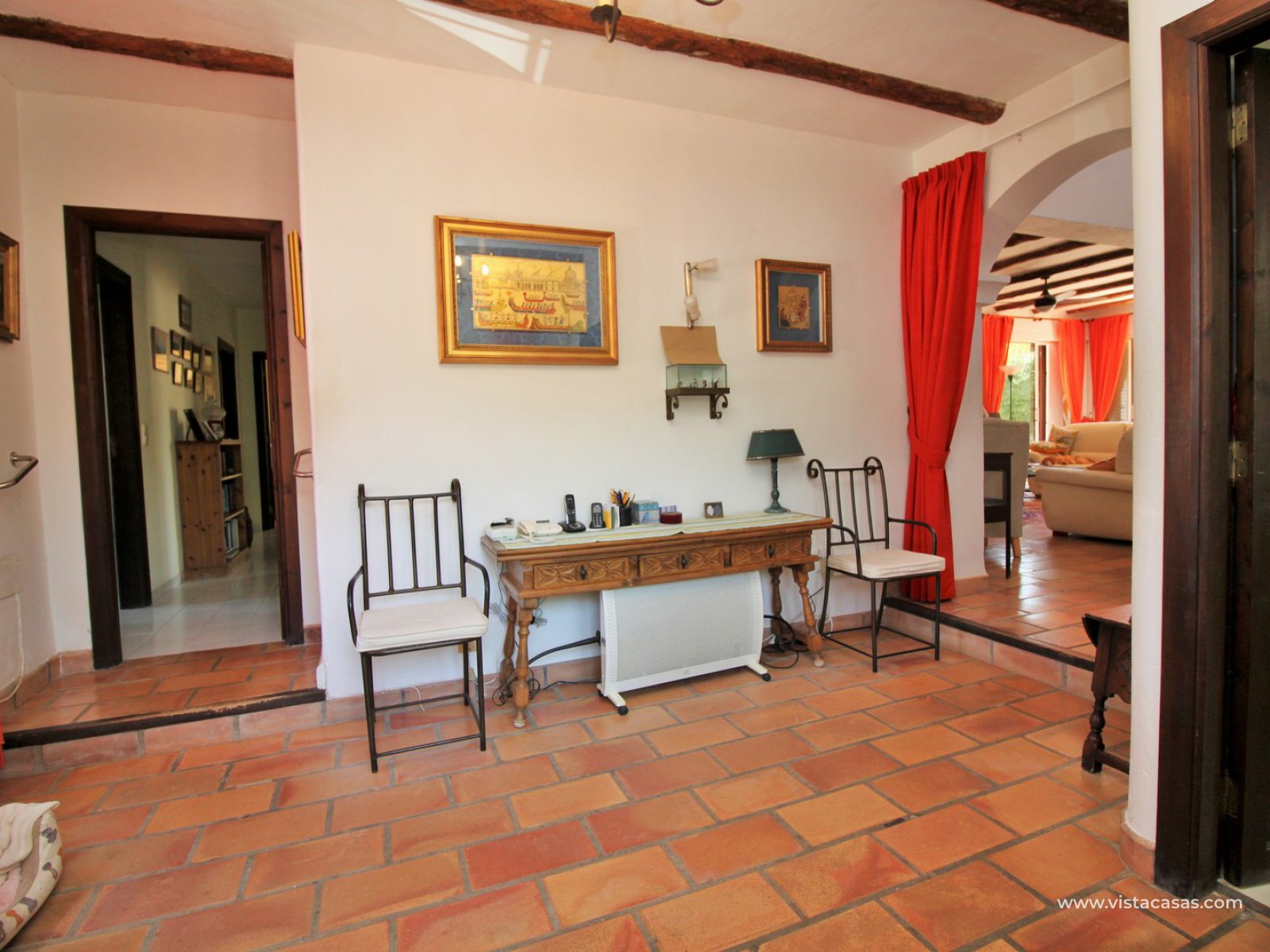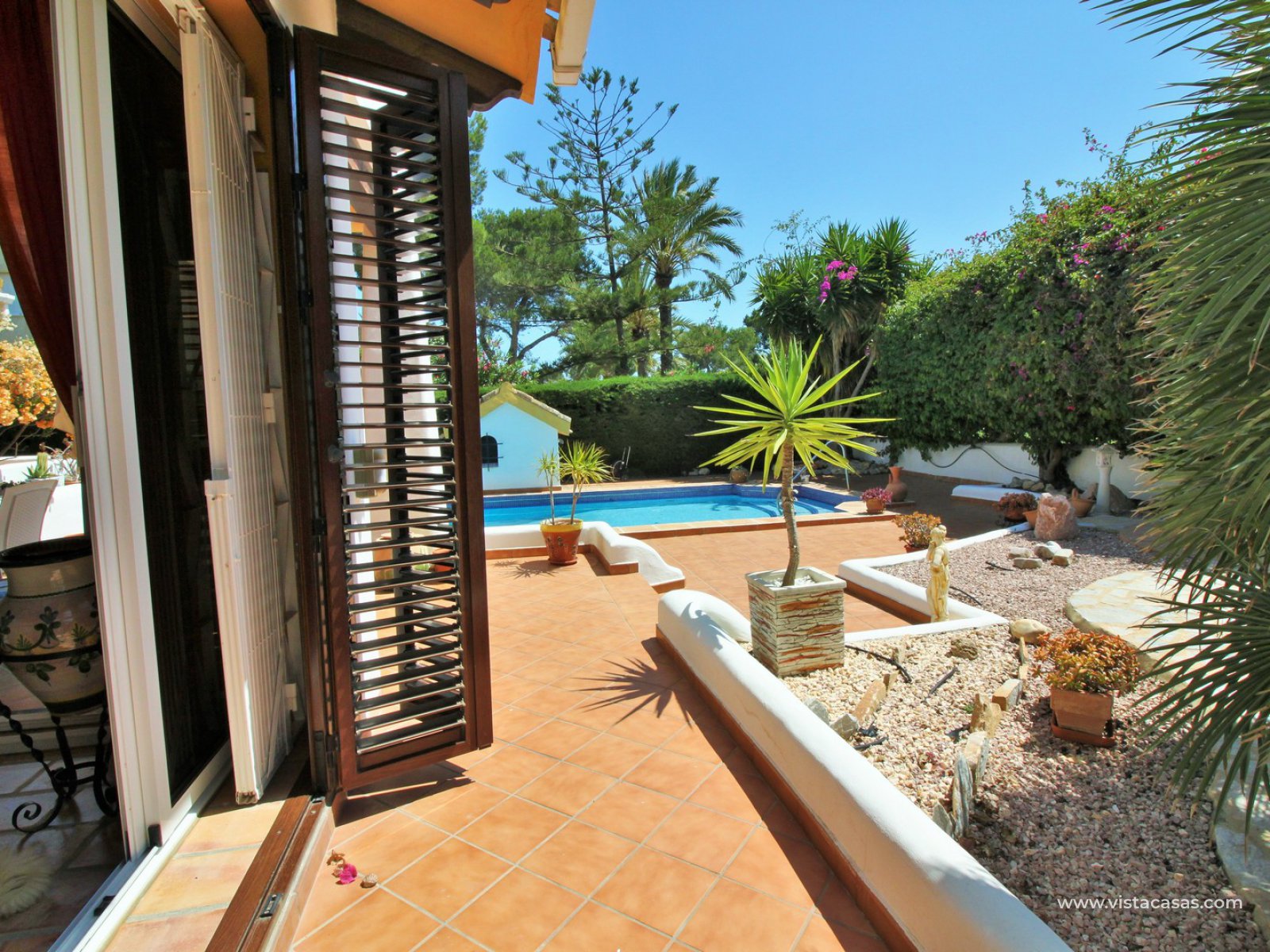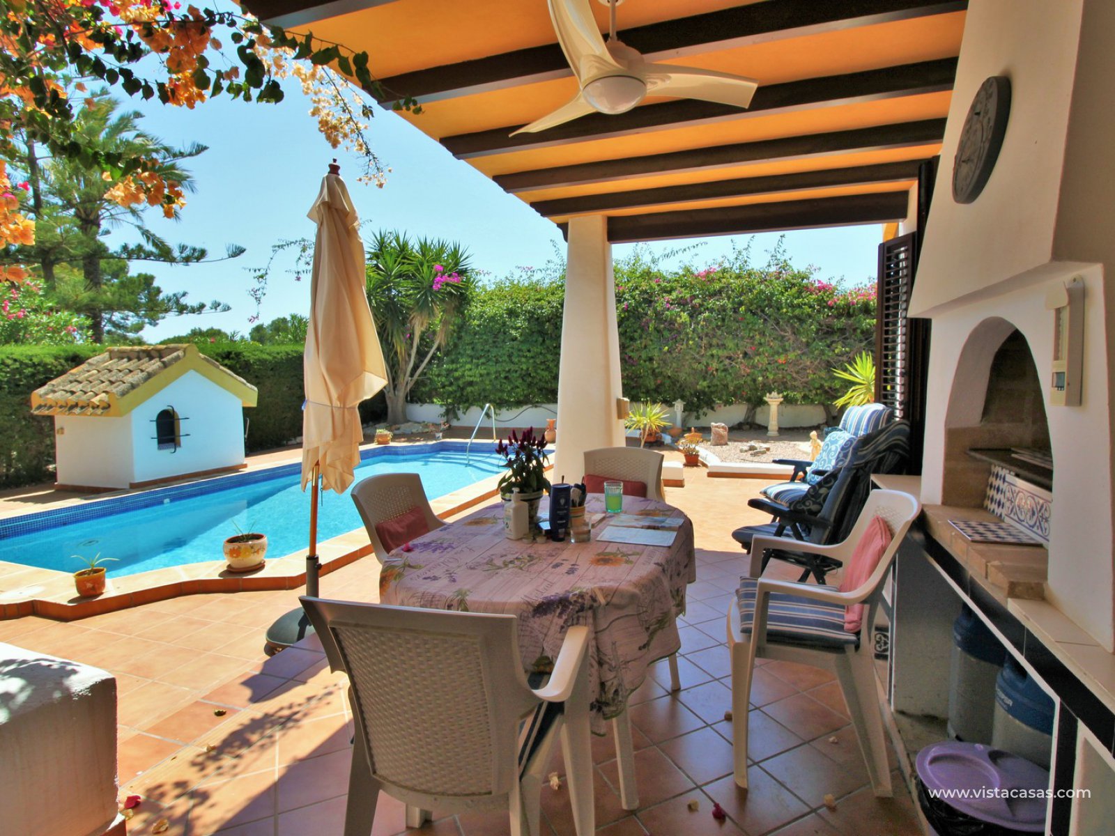 Beautiful first-line golf Mediterranean style villa directly facing the Villamartin golf course with access to the golf course from the garden. You enter the property into a large entrance hall which leads into the open lounge area with fireplace and a lovely circular dining room. There is a separate kitchen with high ceilings and a good size utility room. There are 3 bedrooms which are all located on the ground floor, with 2 of them benefitting from en-suite bathrooms, and direct access to the pool and garden area. The master bedroom also has a walk-in wardrobe. Upstairs there is a round shaped tower room with a Juliet balcony, and a roof solarium offering stunning views of the Villamartin golf course. This tower room could serve as a 4th bedroom if desired. The villa has a large garden that wraps around the entire property and offers a private pool, covered porch area with built-in BBQ, 2 seating areas with gazebo, and gated off-road parking with garage. There is a gate located at the rear of the garden with a covered parking area for a golf buggy that leads directly onto the Villamartin golf course.