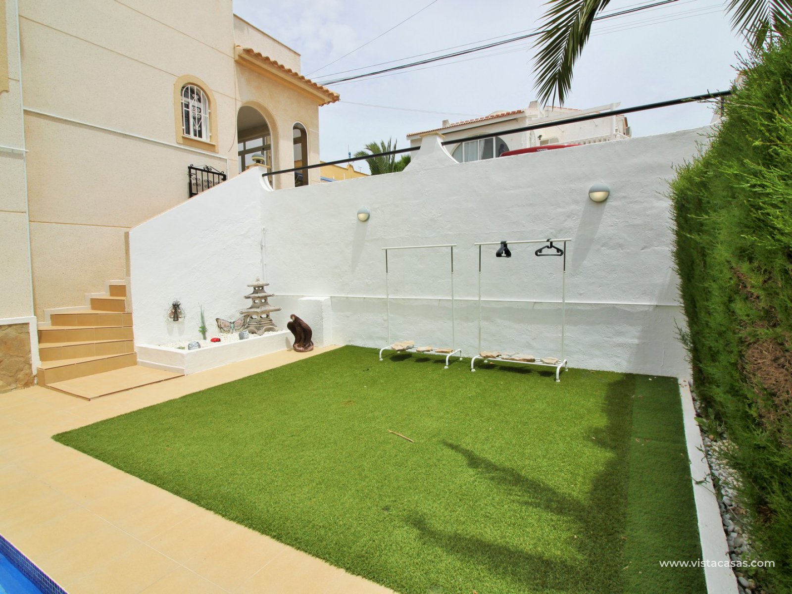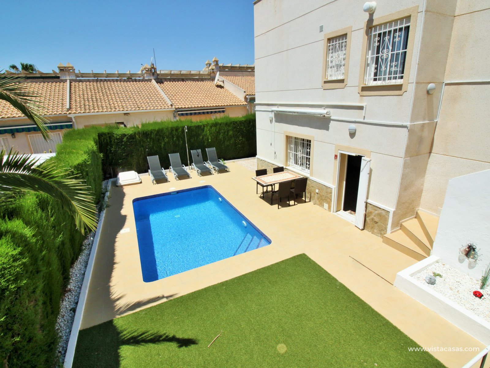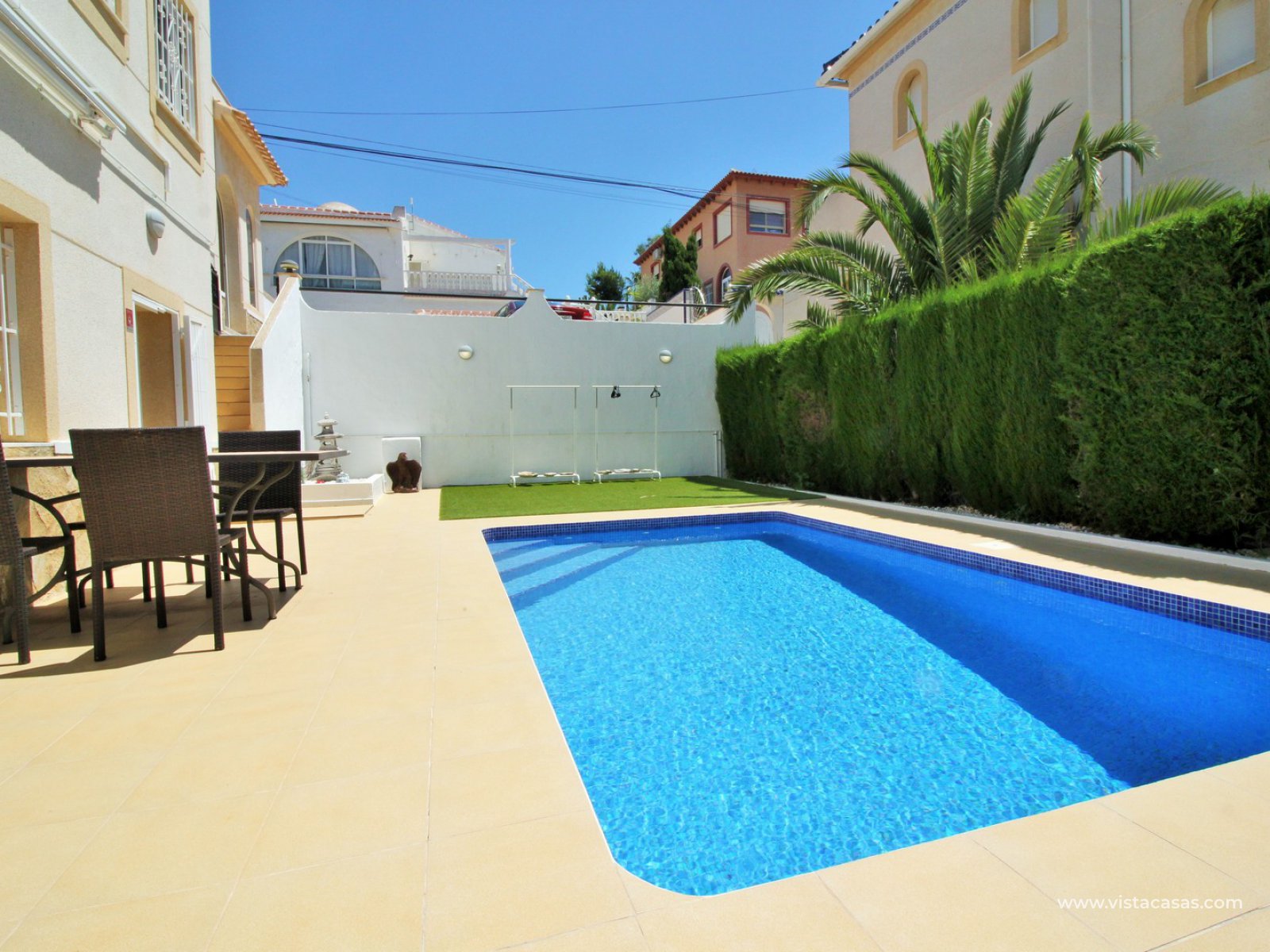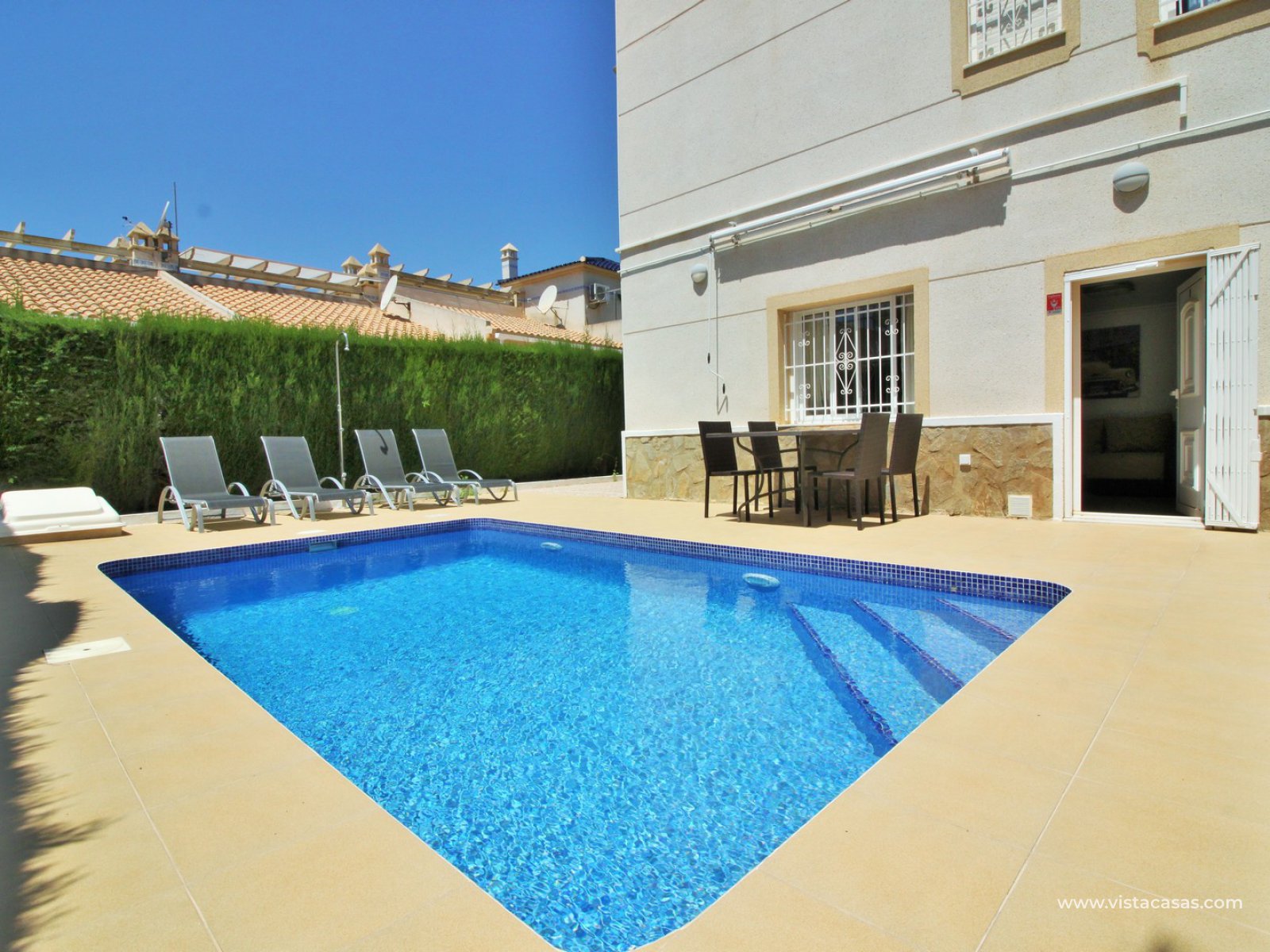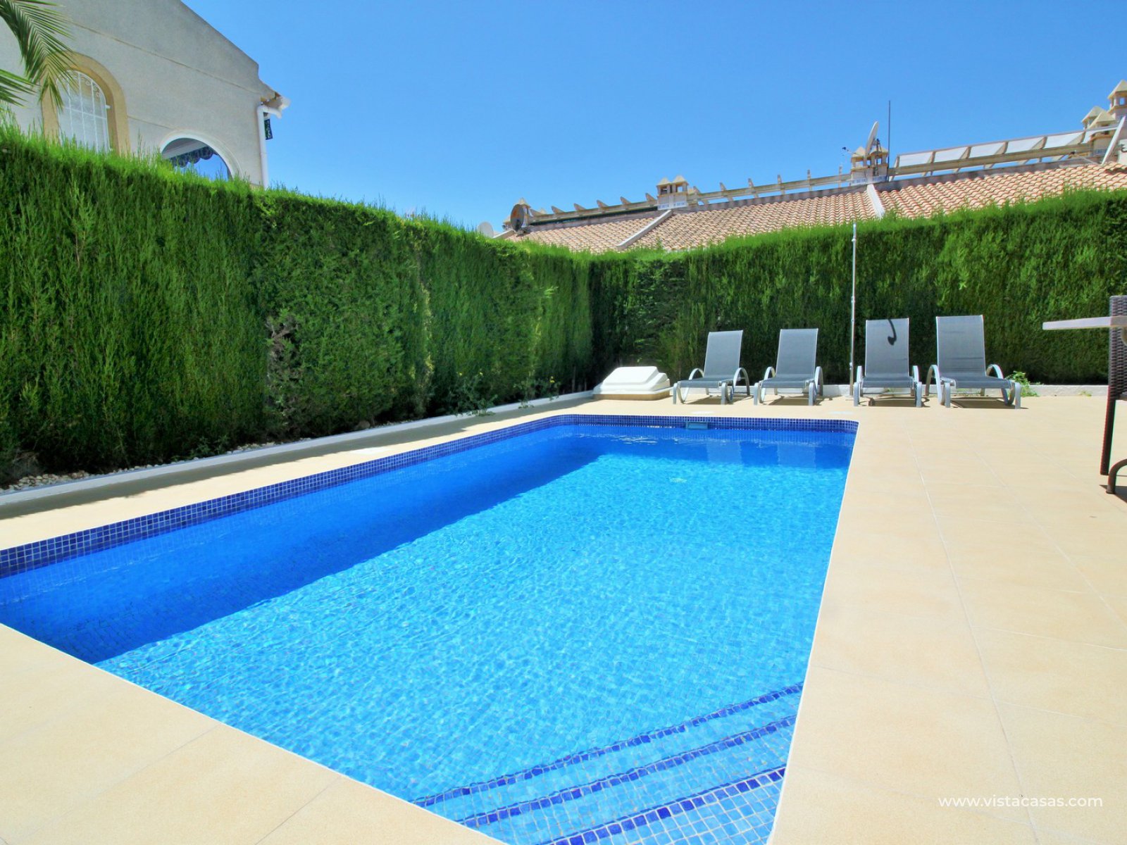 Exterior stairs lead down to the lovely pool area with plenty of space for sunbathing and entertaining. From here you can access the self contained annex, which comprises of a large lounge-dining area with fully fitted kitchen, utility room, bathroom with shower, and a bedroom with fitted wardrobes. The annex is very open and has lots of natural light going into the lounge area. There is also an off-road parking space just beside the property. Sold furnished with air-conditioning.