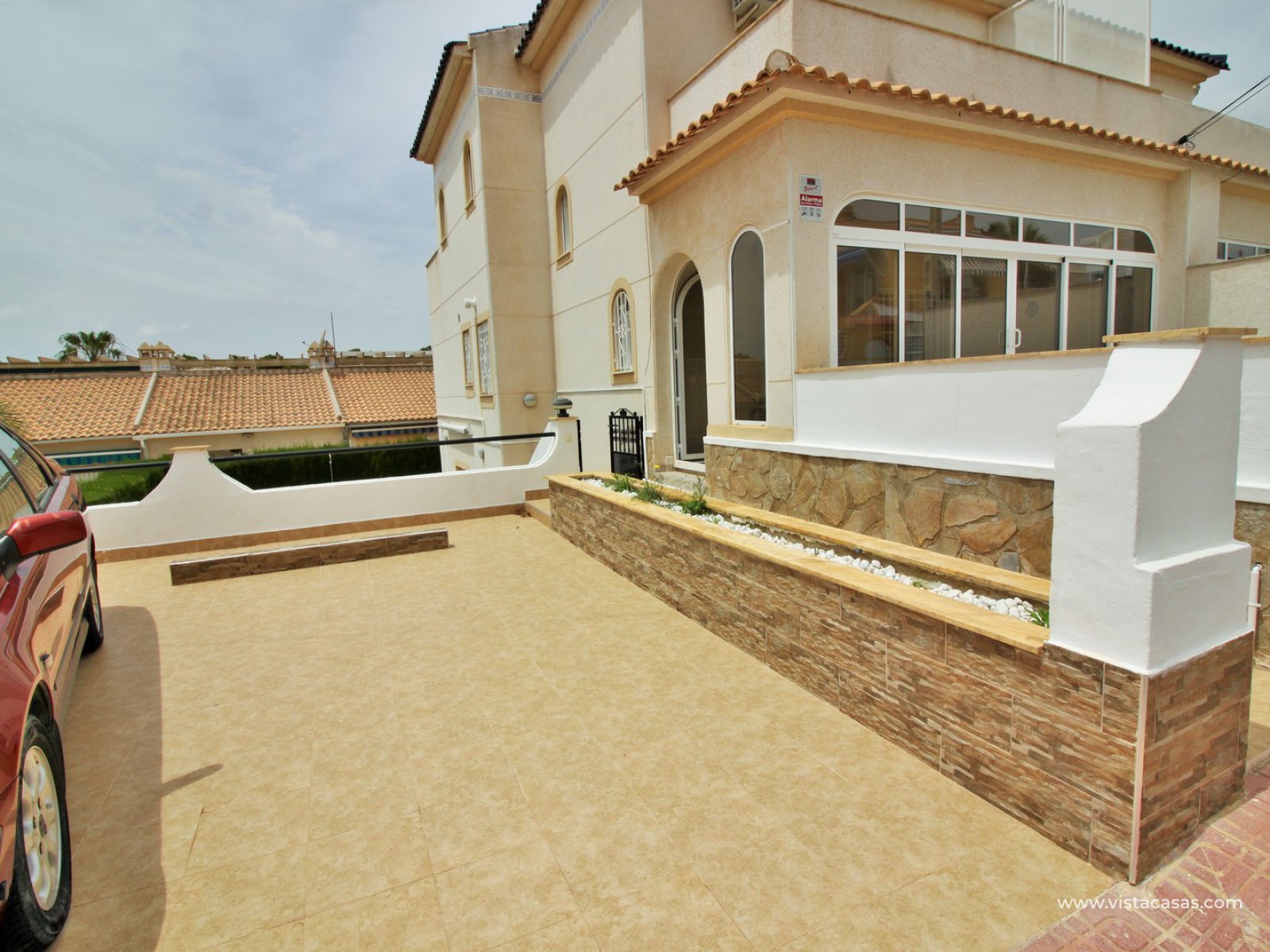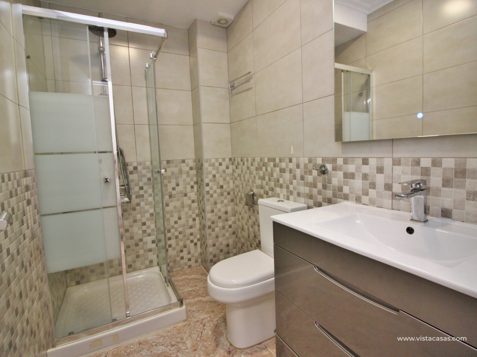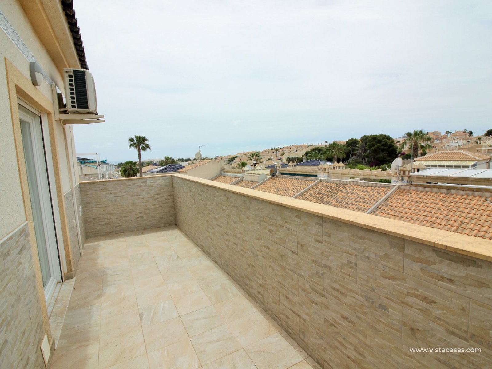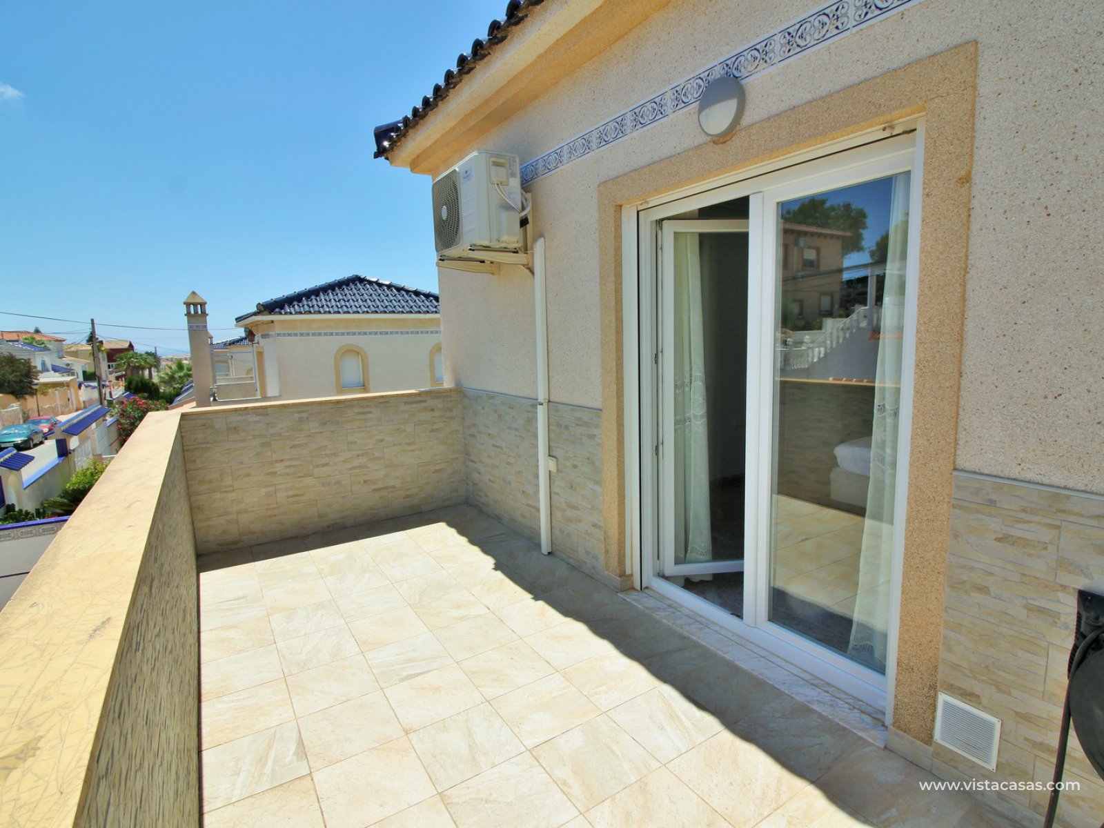 The main house comprises of a lounge-dining area with a seperate kitchen, utility room, 2 bedrooms with fitted wardrobes and a bathroom with shower. Internal stairs from the living area leads up to the second floor, which comprises of a bright lounge area with open kitchen and patio doors leading to a South facing balcony with sea views. There is also a bathroom with shower and a large master bedroom with fitted wardrobes and a private balcony. There is a front tiled garden with an en-glazed porch.