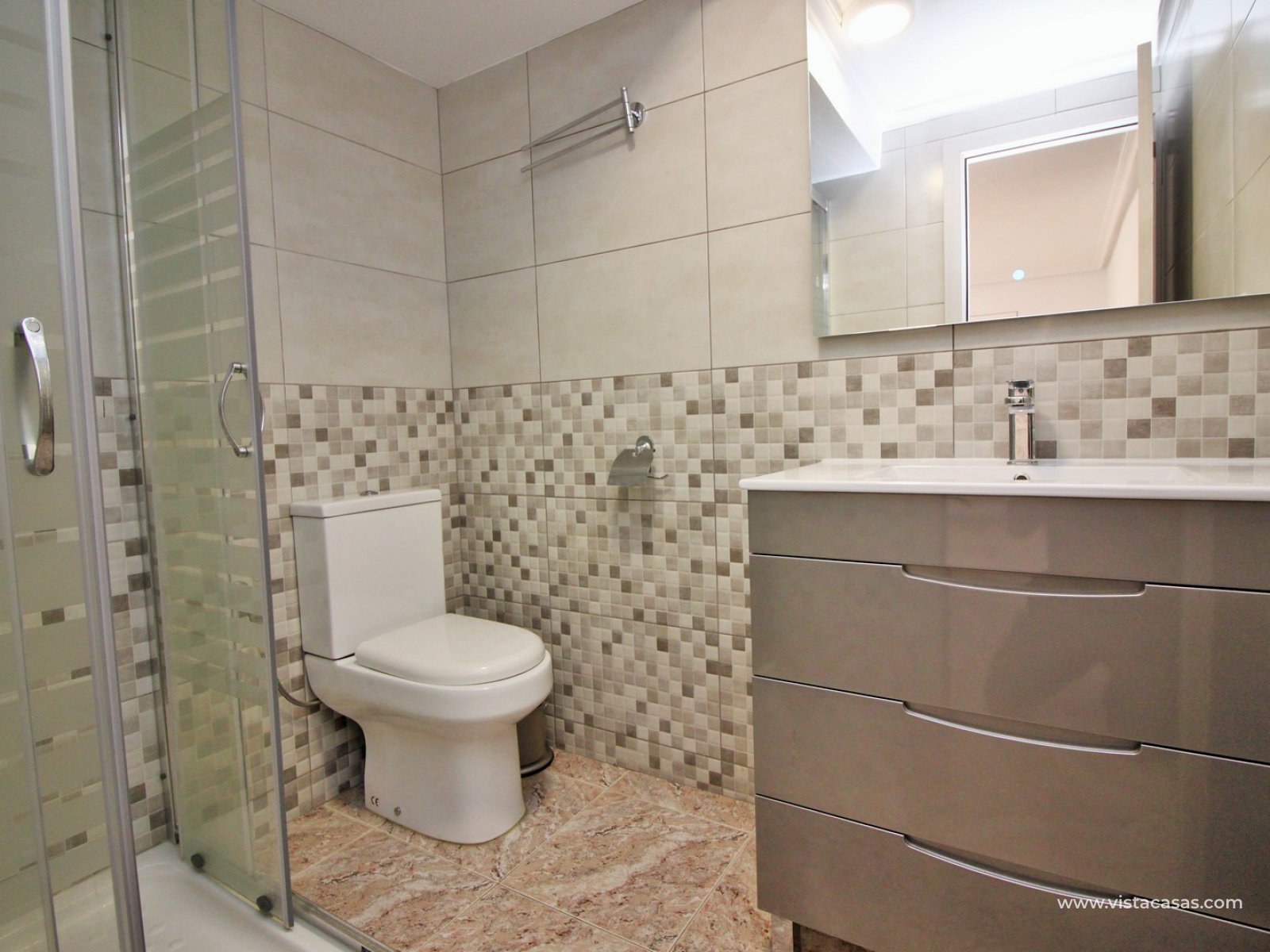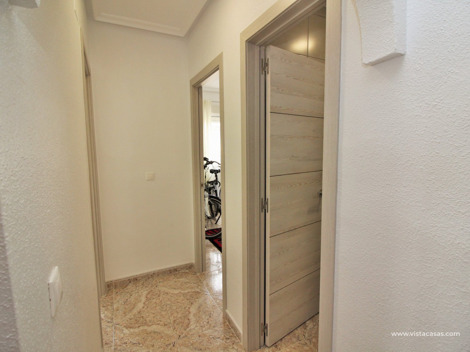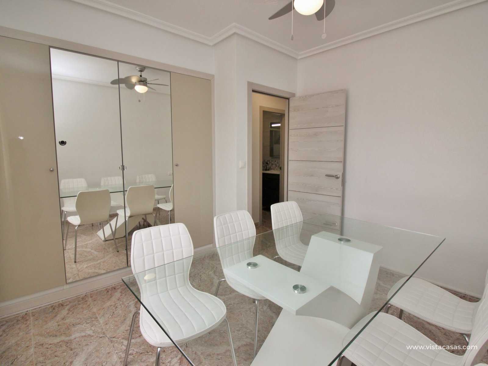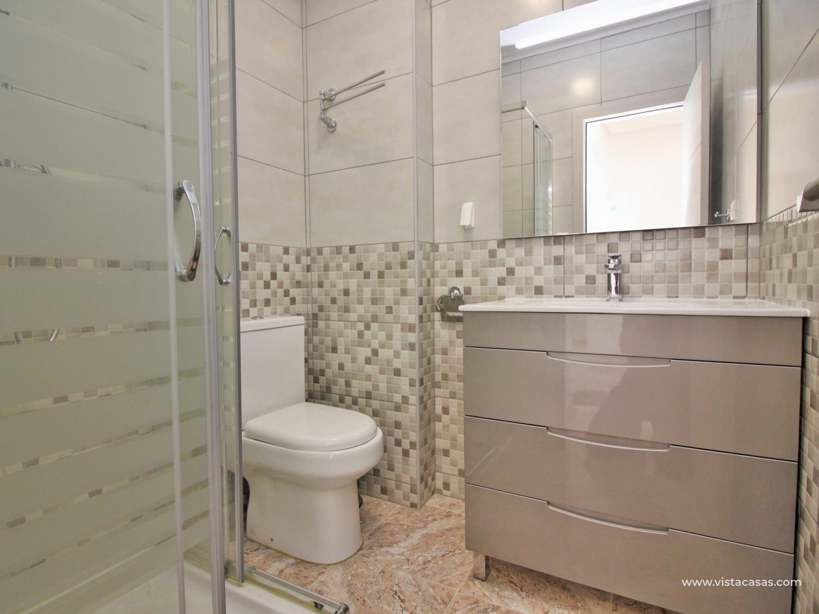 The main house comprises of a lounge-dining area with a seperate kitchen, utility room, 2 bedrooms with fitted wardrobes and a bathroom with shower. Internal stairs from the living area leads up to the second floor, which comprises of a bright lounge area with open kitchen and patio doors leading to a South facing balcony with sea views. There is also a bathroom with shower and a large master bedroom with fitted wardrobes and a private balcony. There is a front tiled garden with an en-glazed porch.