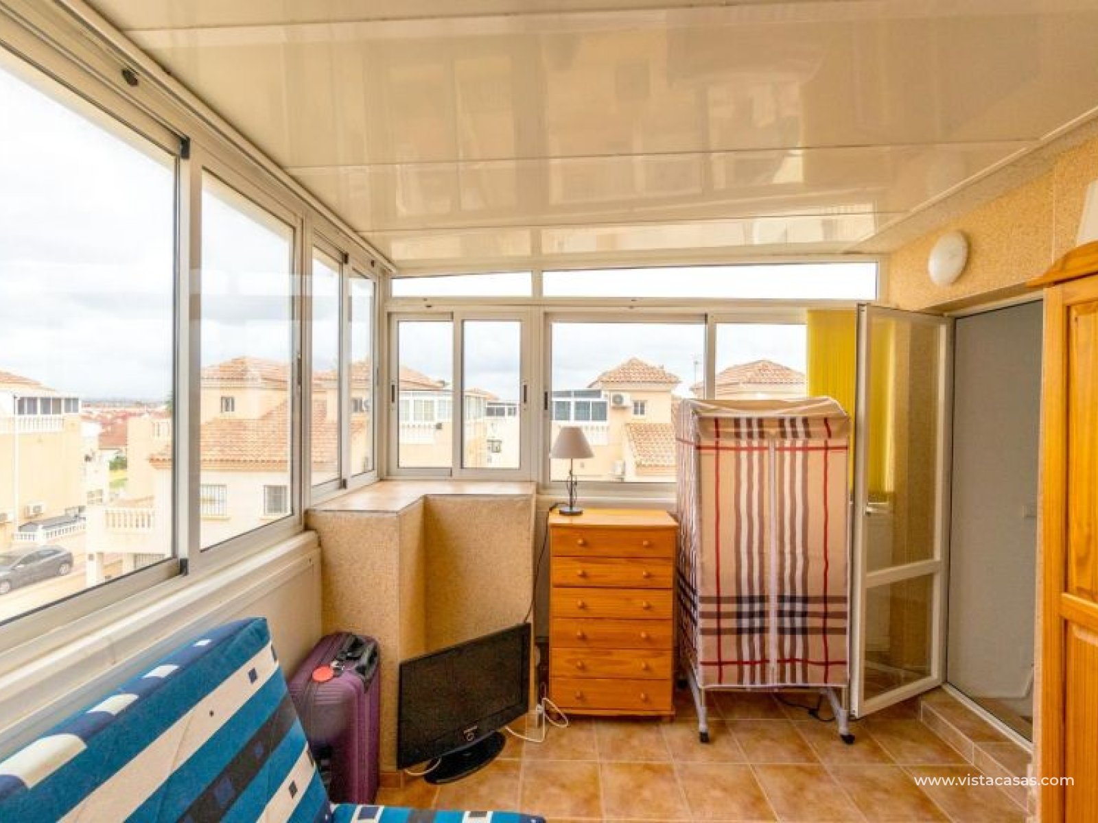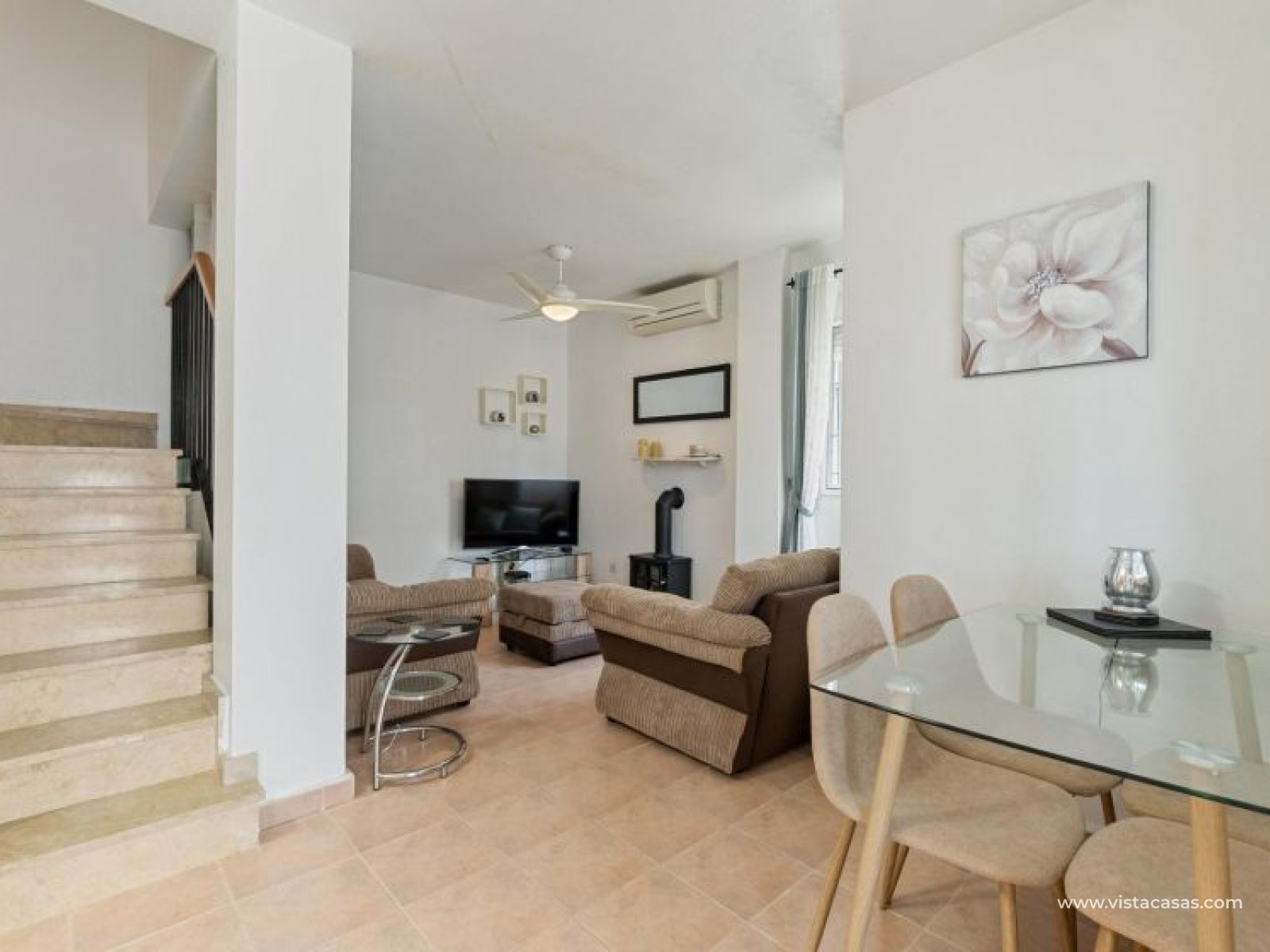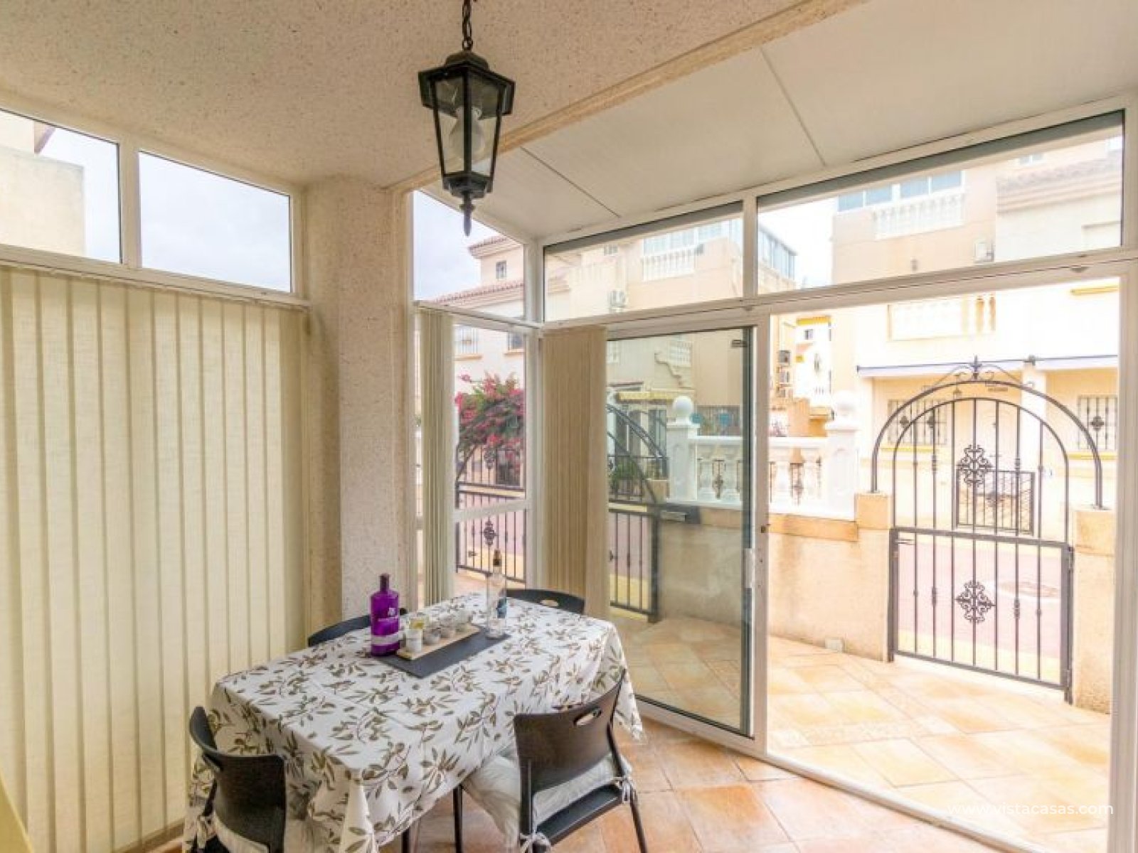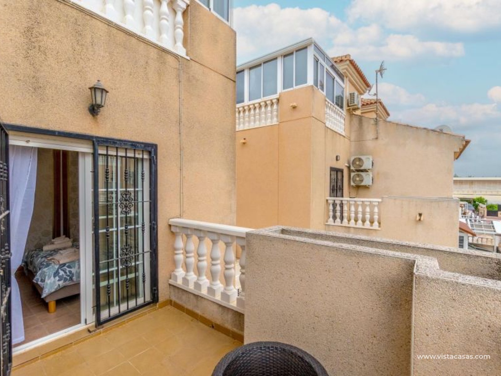 Your new home on the Costa Blanca is waiting for you! Imagine living under the Mediterranean sun in a bright, comfortable home, ready to move in from day one. This beautiful quad-style townhouse in Residencial El Coral II, Torrevieja, has everything you need: space, location, and an ideal setting for year-round living, holidays, or a solid investment. The property is distributed over two floors plus a private roof terrace. At the entrance, you’ll find a spacious tiled garden, perfect for relaxing or entertaining outdoors. There’s also off-street parking on the plot and a practical storage room. The ground floor features a bright glazed terrace – where you can enjoy sunny breakfasts – a light-filled living-dining room, a fully equipped independent kitchen, a closed utility room, and a guest toilet. On the first floor, there are two bedrooms, one with a private terrace, and a renovated bathroom with a walk-in shower. The roof terrace has been enclosed and converted into a third bedroom or multipurpose room. A marble staircase adds a touch of elegance. The home is sold furnished and ready to move into. The community offers a communal pool and is located in a peaceful yet well-connected area: supermarkets, schools, pharmacy, restaurants, sport zones, cinemas, and the beautiful La Siesta park nearby. And best of all: only 2.5 km from the beaches, 600 meters from the Pink Lake, and 40 km from Alicante airport. Don’t miss this opportunity – come and visit with no obligation. Call or message us today to schedule your viewing. Your new home in Torrevieja is waiting!