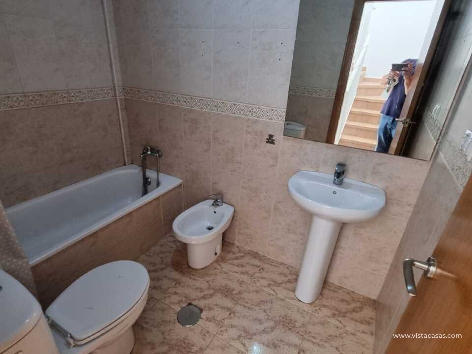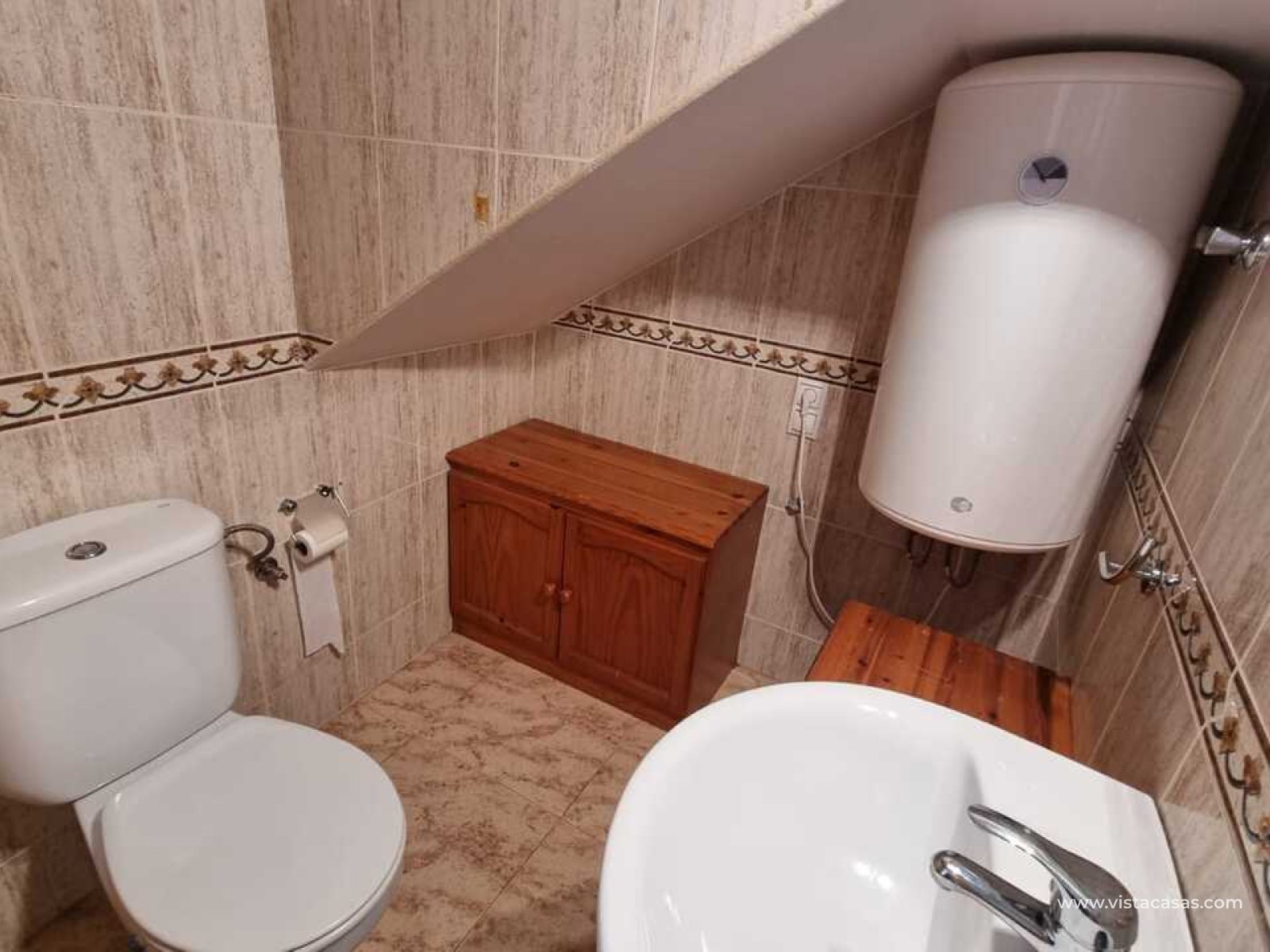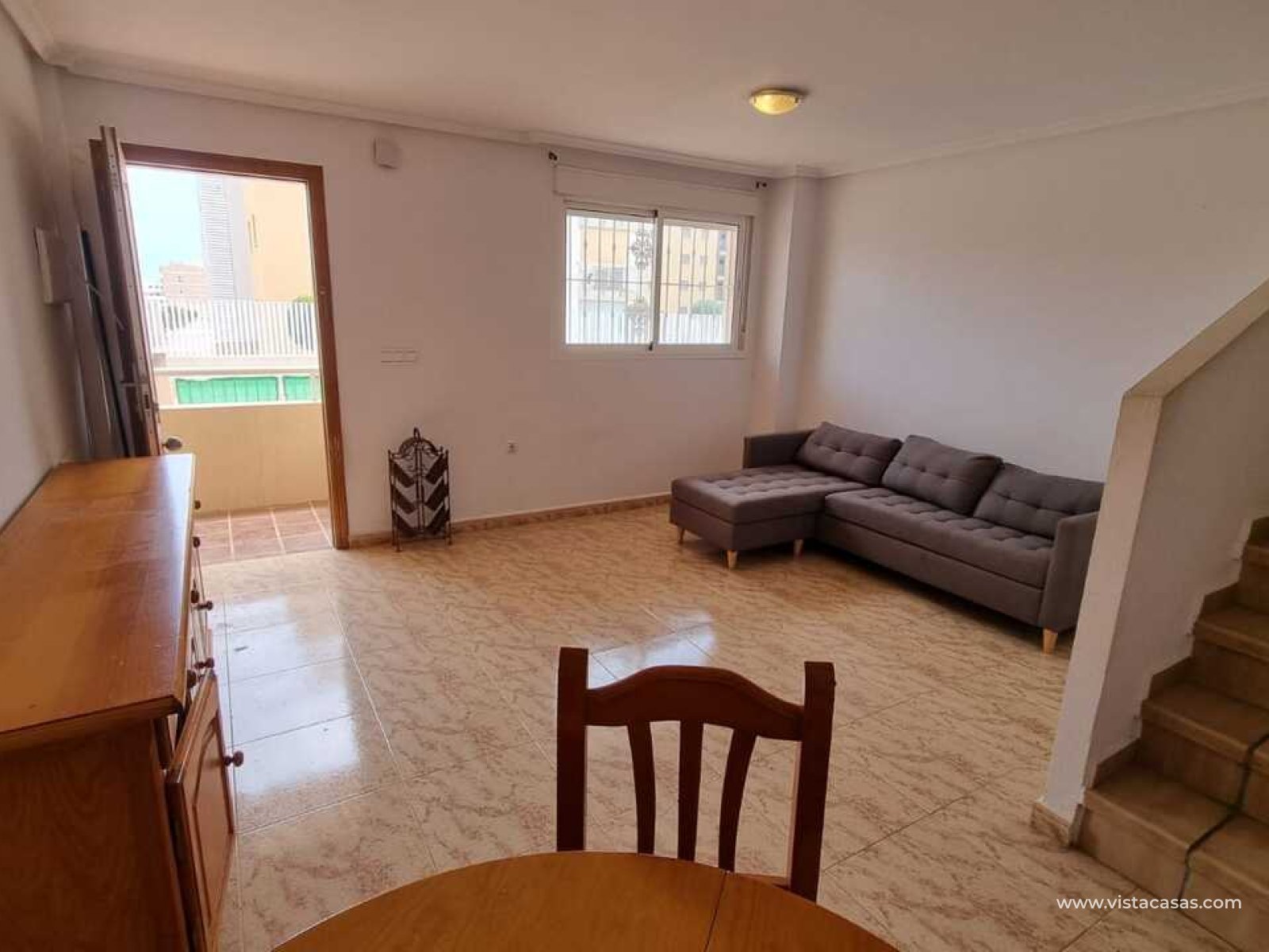 We present this townhouse triplex in Villamartín, Orihuela Costa, in a charming residential area consisting of only 9 homes. Enjoy a home with a privileged location, just 3 km from La Zenia Beach and 5 minutes from La Zenia Boulevard Shopping Center, surrounded by supermarkets, restaurants, and all the services you need.The property features a communal pool, which you can access directly from the back of the house. Its East-facing orientation ensures natural light and warmth throughout the day. Additionally, at the front of the house, a spacious patio allows you to park your vehicle or simply enjoy great moments with friends and family.Inside, upon entering, we find a cozy living room, a guest toilet, a small bedroom, and a practical open-plan kitchen equipped with access to the rear terrace. From here, you can reach the pool to enjoy the sun and tranquility.On the upper floor, we find two bedrooms: one with an en-suite bathroom and a walk-in closet, perfect for keeping everything organized. There is also another full bathroom with a bathtub. And on the highest floor, a solarium, ideal for sunbathing or simply relaxing.If you are looking for a perfect home to live in all year round or to enjoy your holidays, don't miss this opportunity. Contact us for more information and schedule your visit!