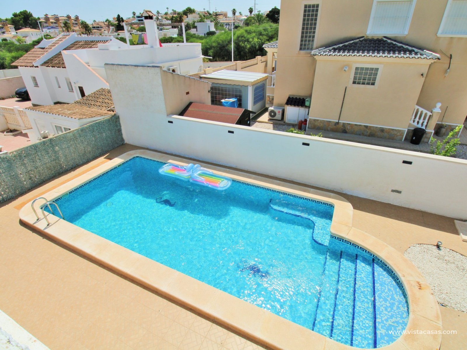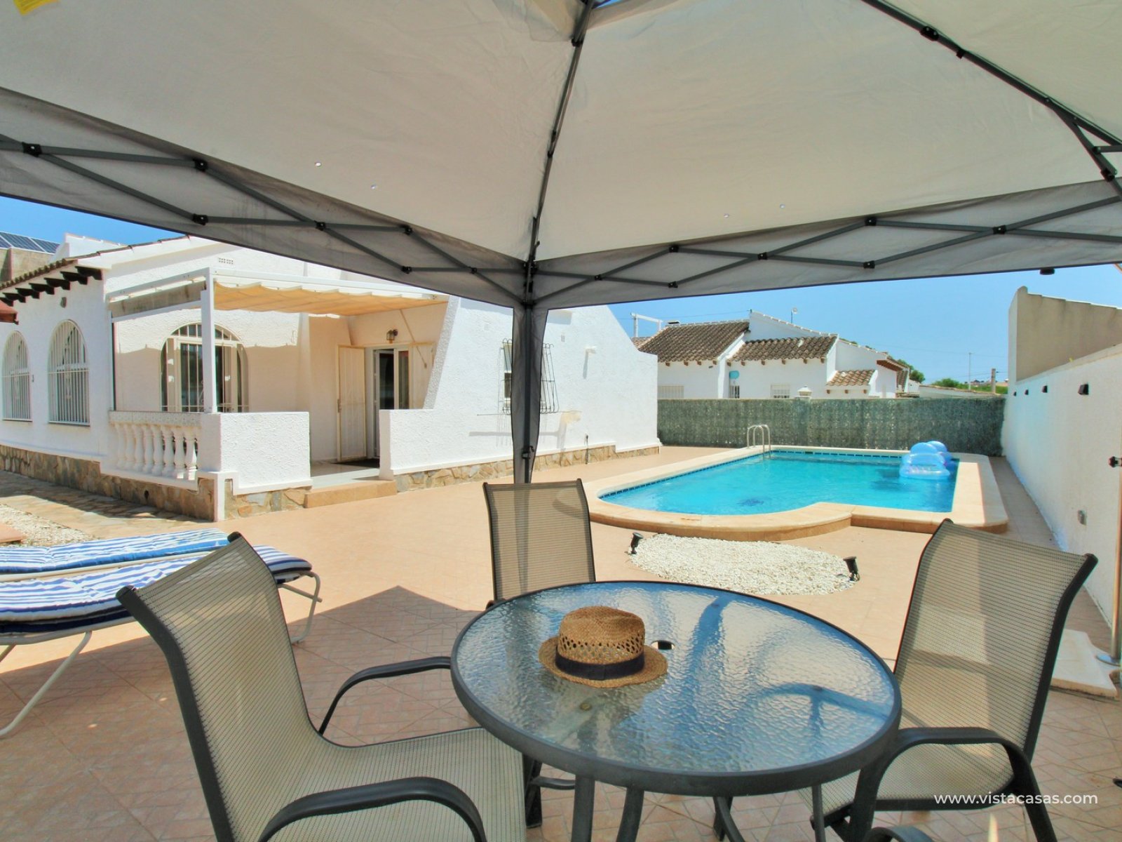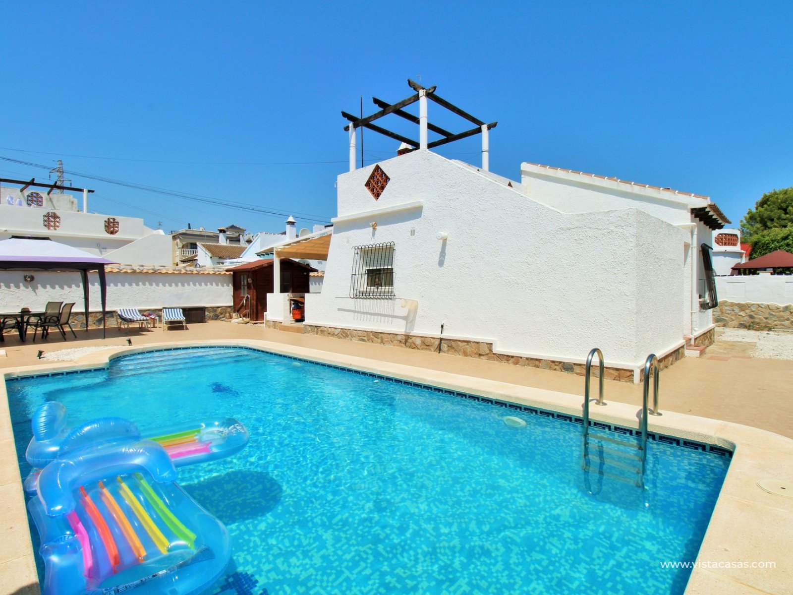 A beautifully presented three-bedroom, two-bathroom detached villa with a generous private swimming pool, set within the sought-after Eagles Nest neighbourhood, just minutes from Villamartin Plaza and its renowned golf course. Occupying a substantial 420m2 plot, the property offers extensive outdoor space designed for both relaxation and entertaining, with ample off-road parking secured by an electric gate. A short stroll brings you to local amenities, including the popular Cheers Bar and the San Miguel Bowls Club.