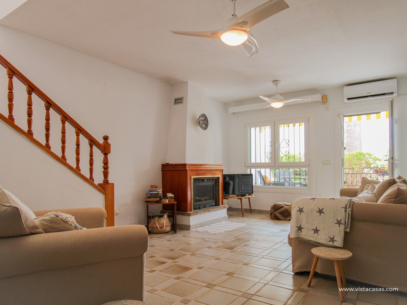 The property boasts spacious front and rear terraces with open views over the lush green areas, ideal for relaxing, entertaining, or enjoying the Mediterranean sunshine. Inside, you’ll find a welcoming lounge and dining area with a cosy fireplace, complemented by air conditioning and ceiling fans for comfortable living all year round. The home has been thoughtfully decorated, blending modern touches with the charm of traditional Spanish style. The layout comprises: 2 double bedrooms on the ground floor, both with fitted wardrobes, plus a family bathroom. On the upper level, the master suite enjoys an en-suite bathroom and access to a private terrace overlooking the pool.