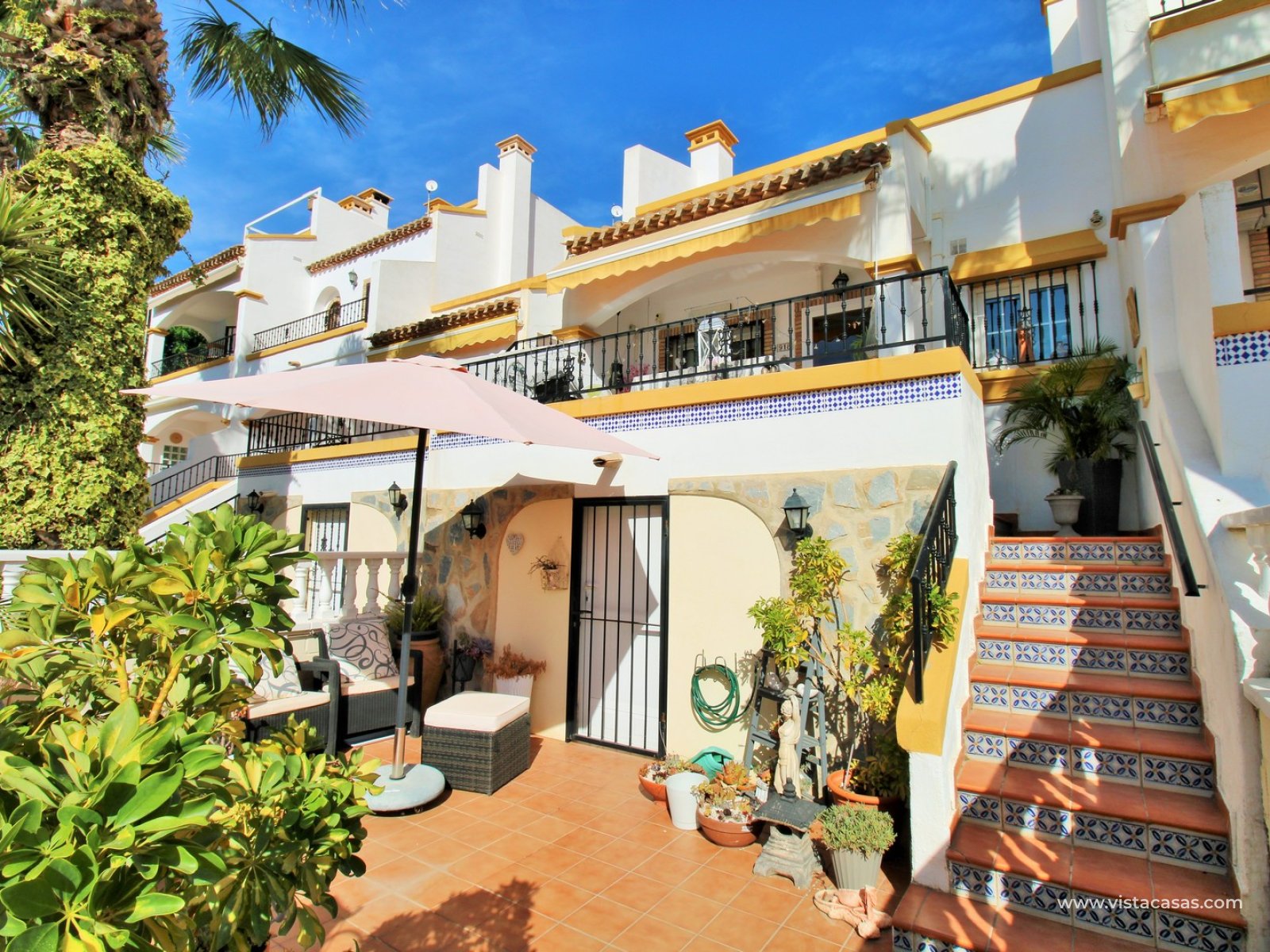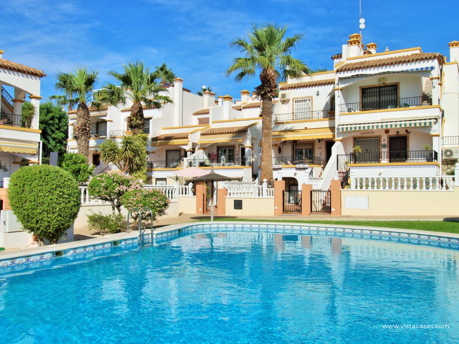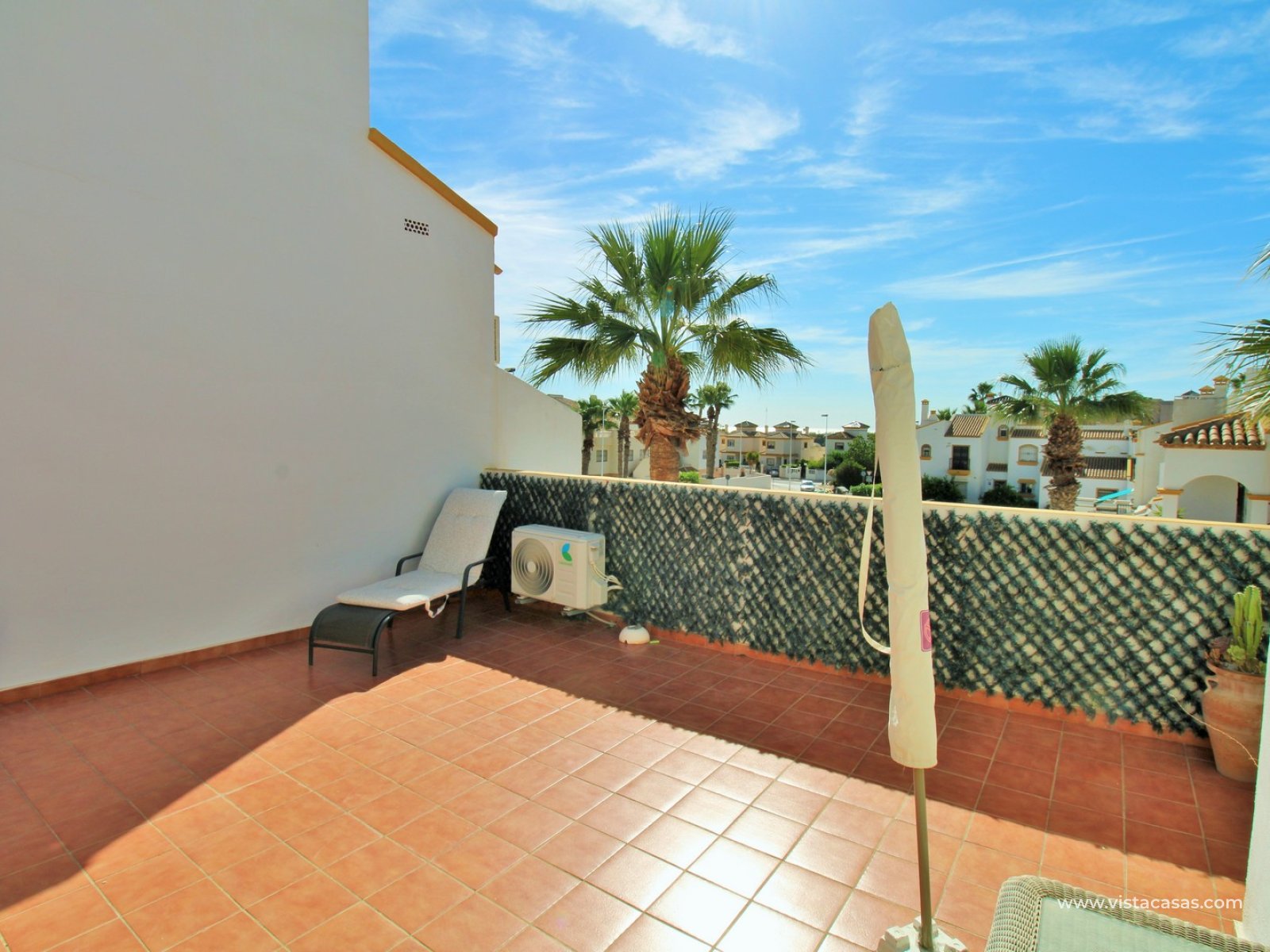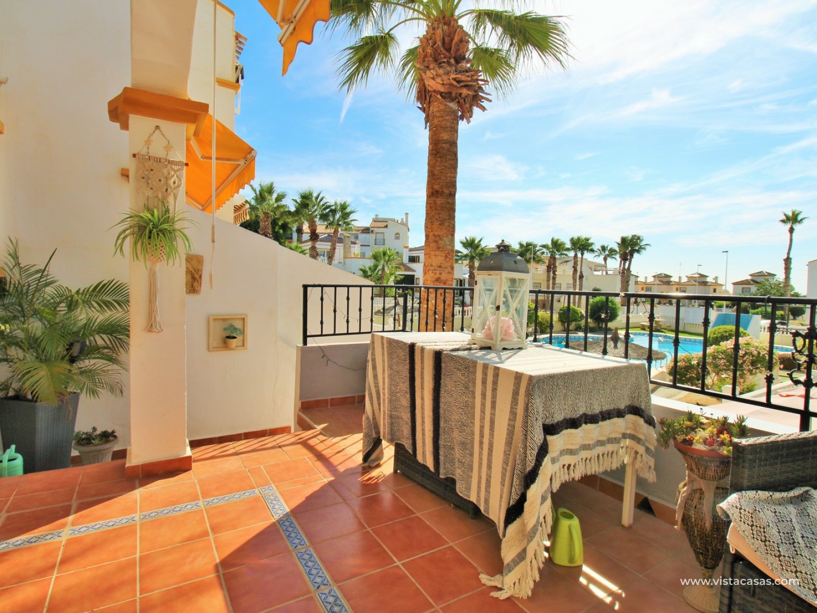 The ground floor offers a bright and spacious lounge–dining area with an open-plan kitchen and adjoining utility space. To the rear are two double bedrooms with fitted wardrobes, together with a family bathroom. French doors from one of the bedrooms open onto the rear tiled garden/terrace, complete with retractable awnings for shade and comfort. To the front, there is an additional tiled garden with a raised, covered terrace which overlooks the pool, beneath which is a useful storage room. On the first floor, the master bedroom features high ceilings, an en-suite bathroom with walk-in shower, ample storage within the built-in storeroom, and direct access to a large private solarium. The solarium can also be reached from the landing and enjoys sunshine throughout the day and views of the pool.