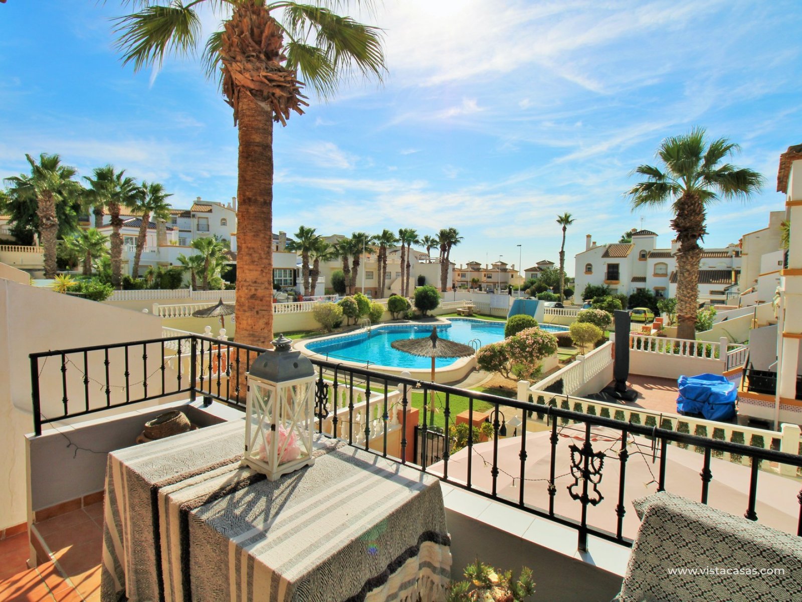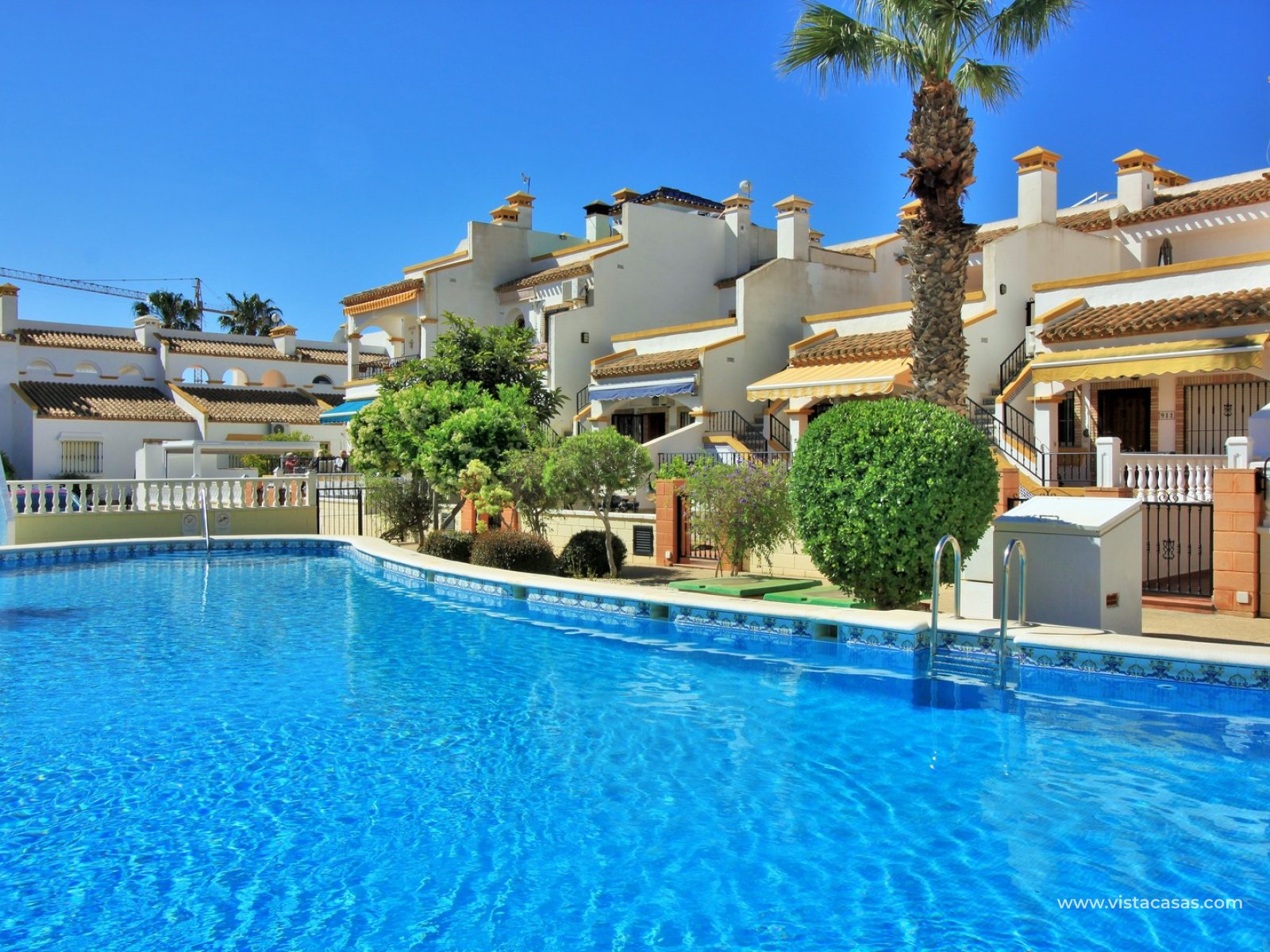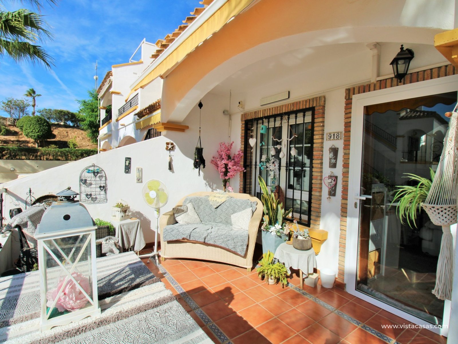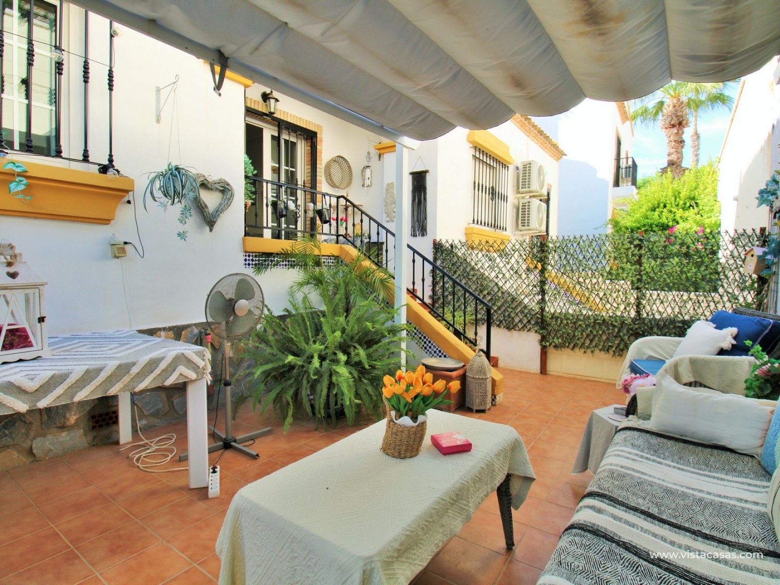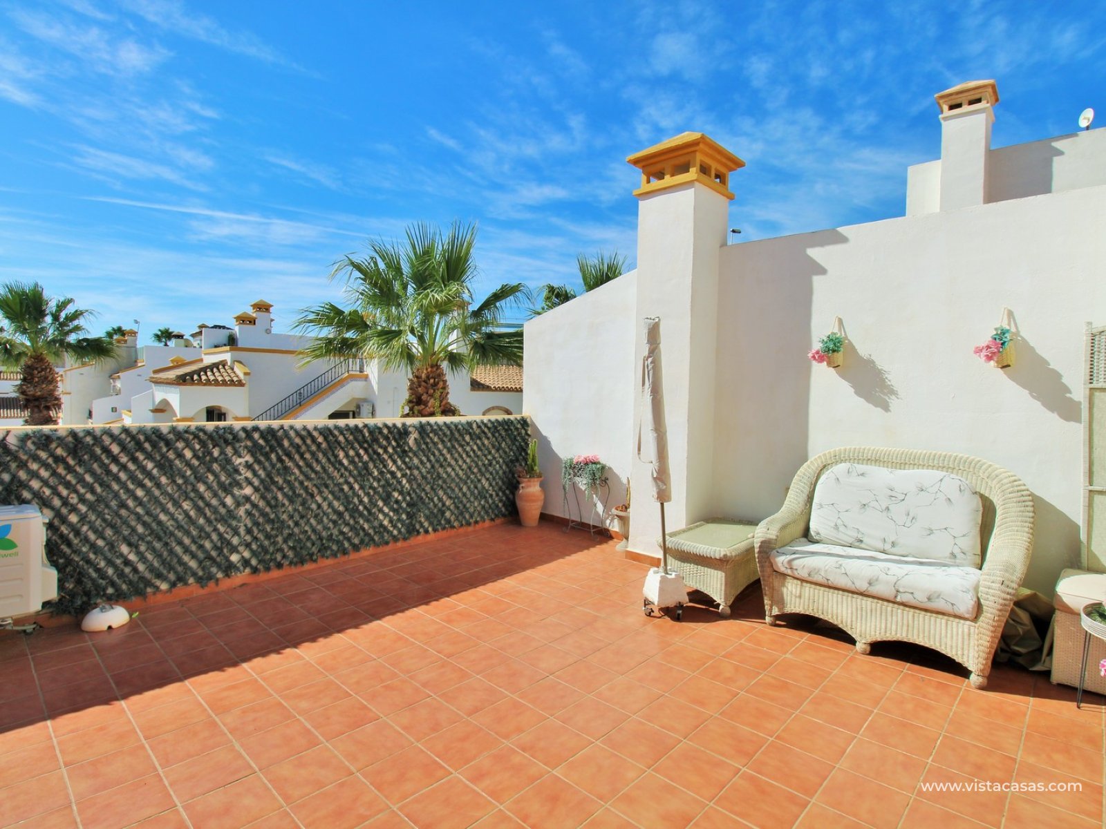 The ground floor offers a bright and spacious lounge–dining area with an open-plan kitchen and adjoining utility space. To the rear are two double bedrooms with fitted wardrobes, together with a family bathroom. French doors from one of the bedrooms open onto the rear tiled garden/terrace, complete with retractable awnings for shade and comfort. To the front, there is an additional tiled garden with a raised, covered terrace which overlooks the pool, beneath which is a useful storage room. On the first floor, the master bedroom features high ceilings, an en-suite bathroom with walk-in shower, ample storage within the built-in storeroom, and direct access to a large private solarium. The solarium can also be reached from the landing and enjoys sunshine throughout the day and views of the pool.