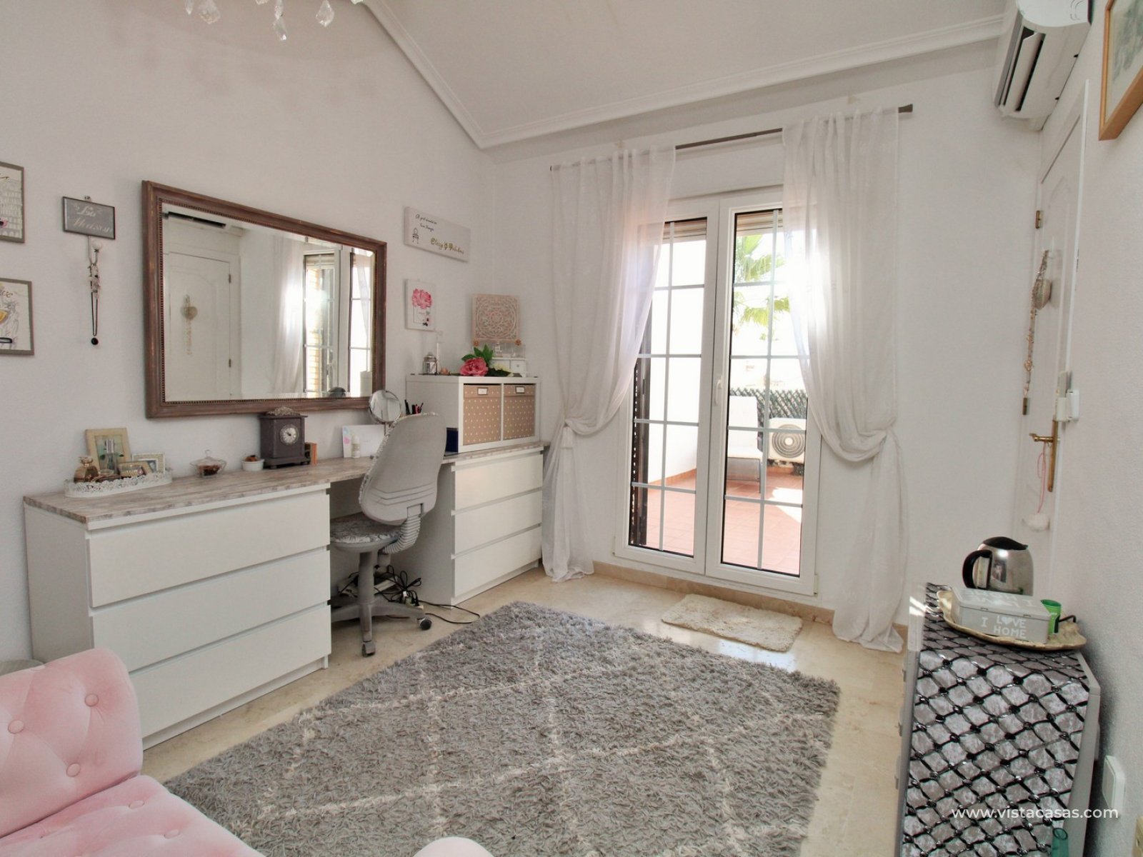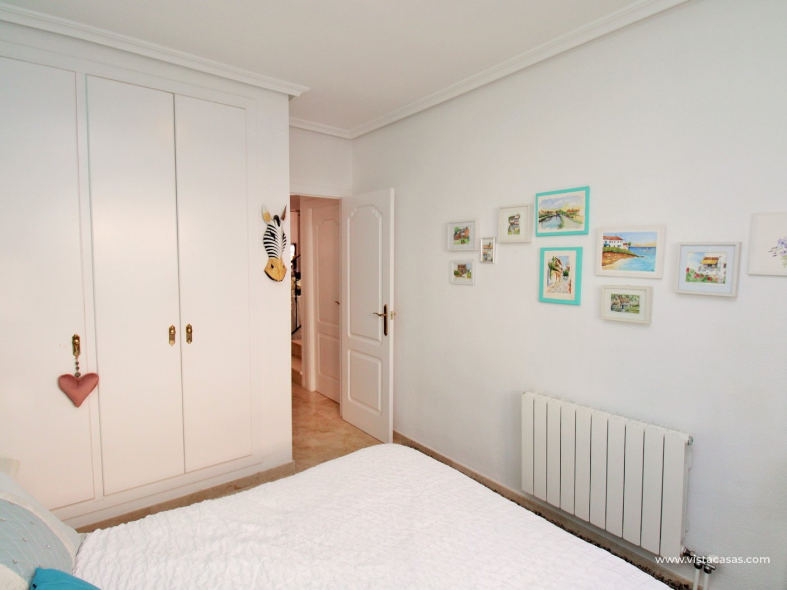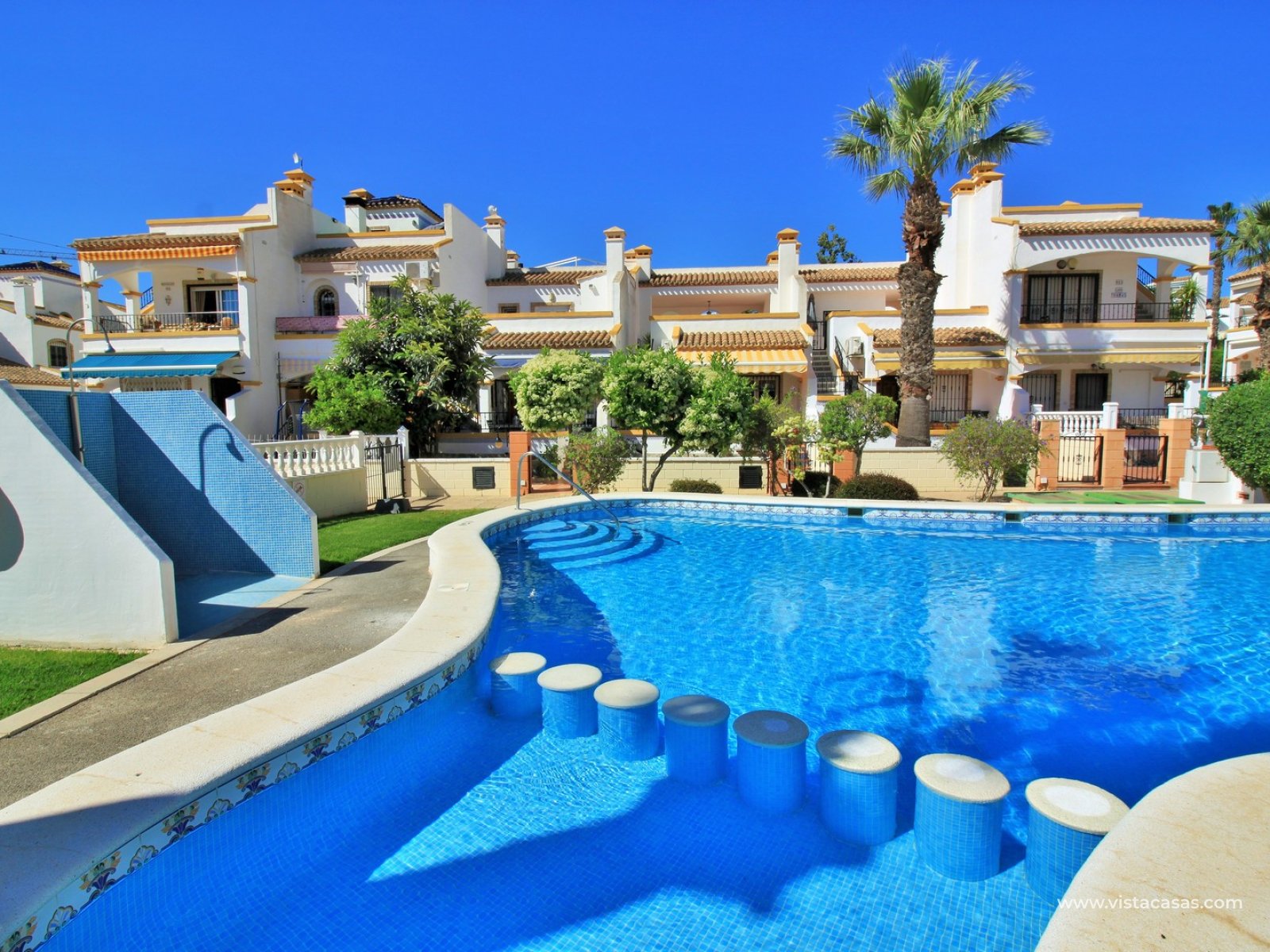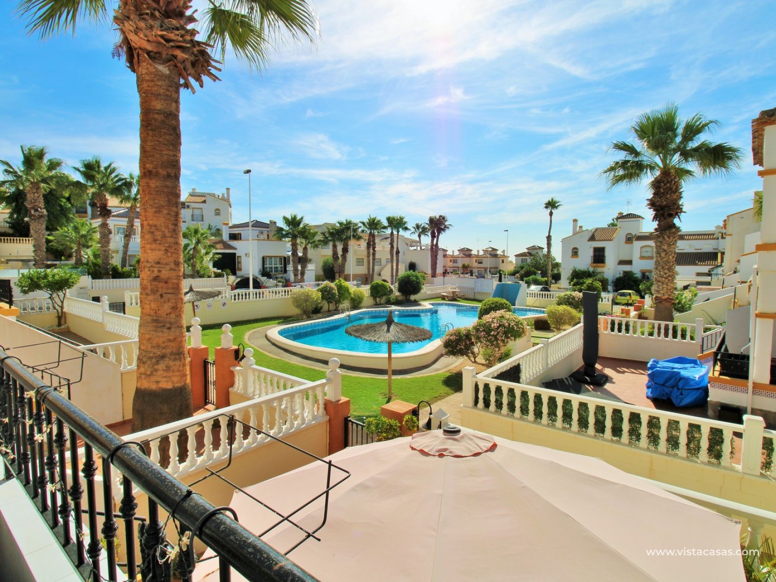The ground floor offers a bright and spacious lounge–dining area with an open-plan kitchen and adjoining utility space. To the rear are two double bedrooms with fitted wardrobes, together with a family bathroom. French doors from one of the bedrooms open onto the rear tiled garden/terrace, complete with retractable awnings for shade and comfort. To the front, there is an additional tiled garden with a raised, covered terrace which overlooks the pool, beneath which is a useful storage room. On the first floor, the master bedroom features high ceilings, an en-suite bathroom with walk-in shower, ample storage within the built-in storeroom, and direct access to a large private solarium. The solarium can also be reached from the landing and enjoys sunshine throughout the day and views of the pool.