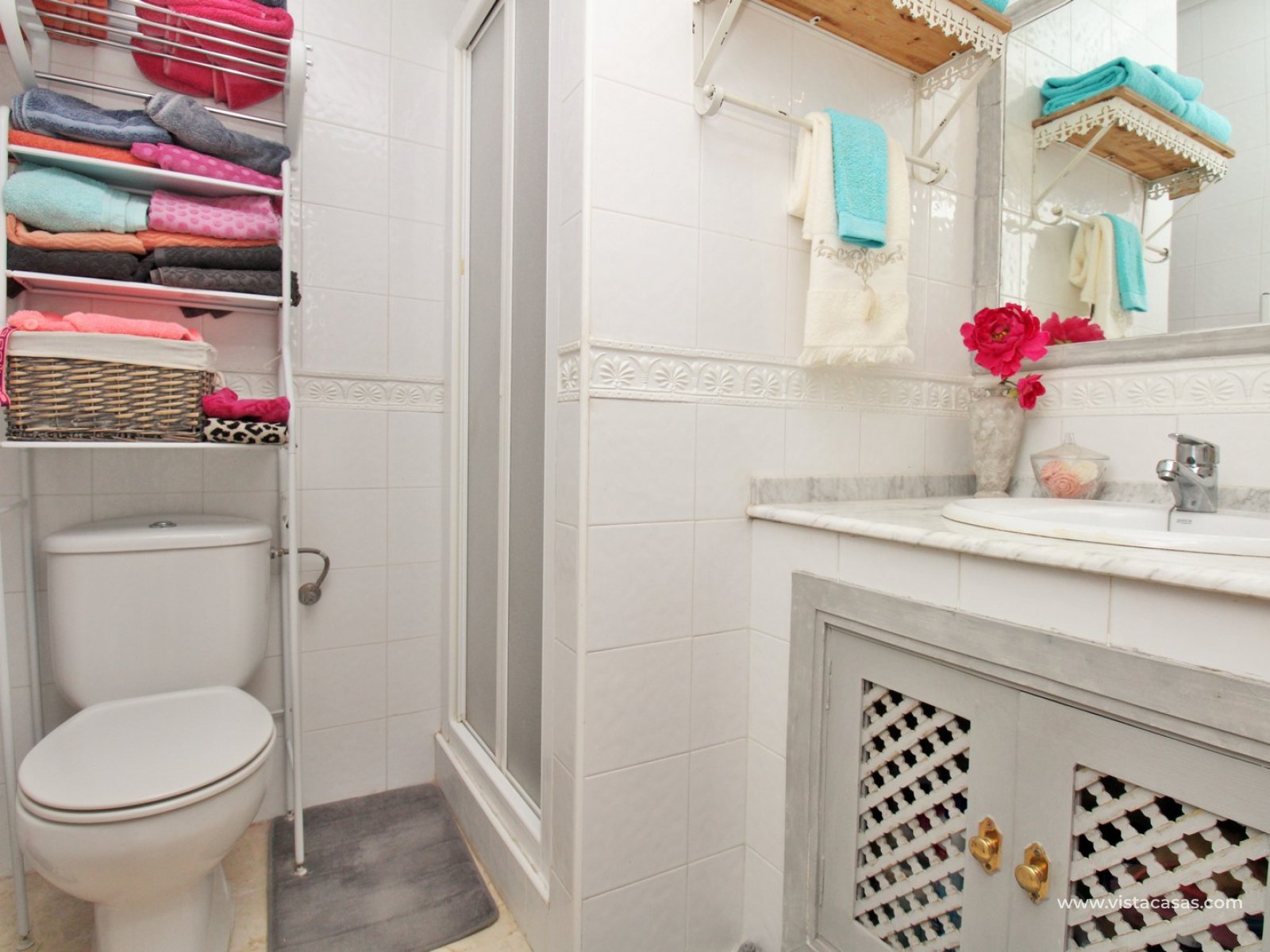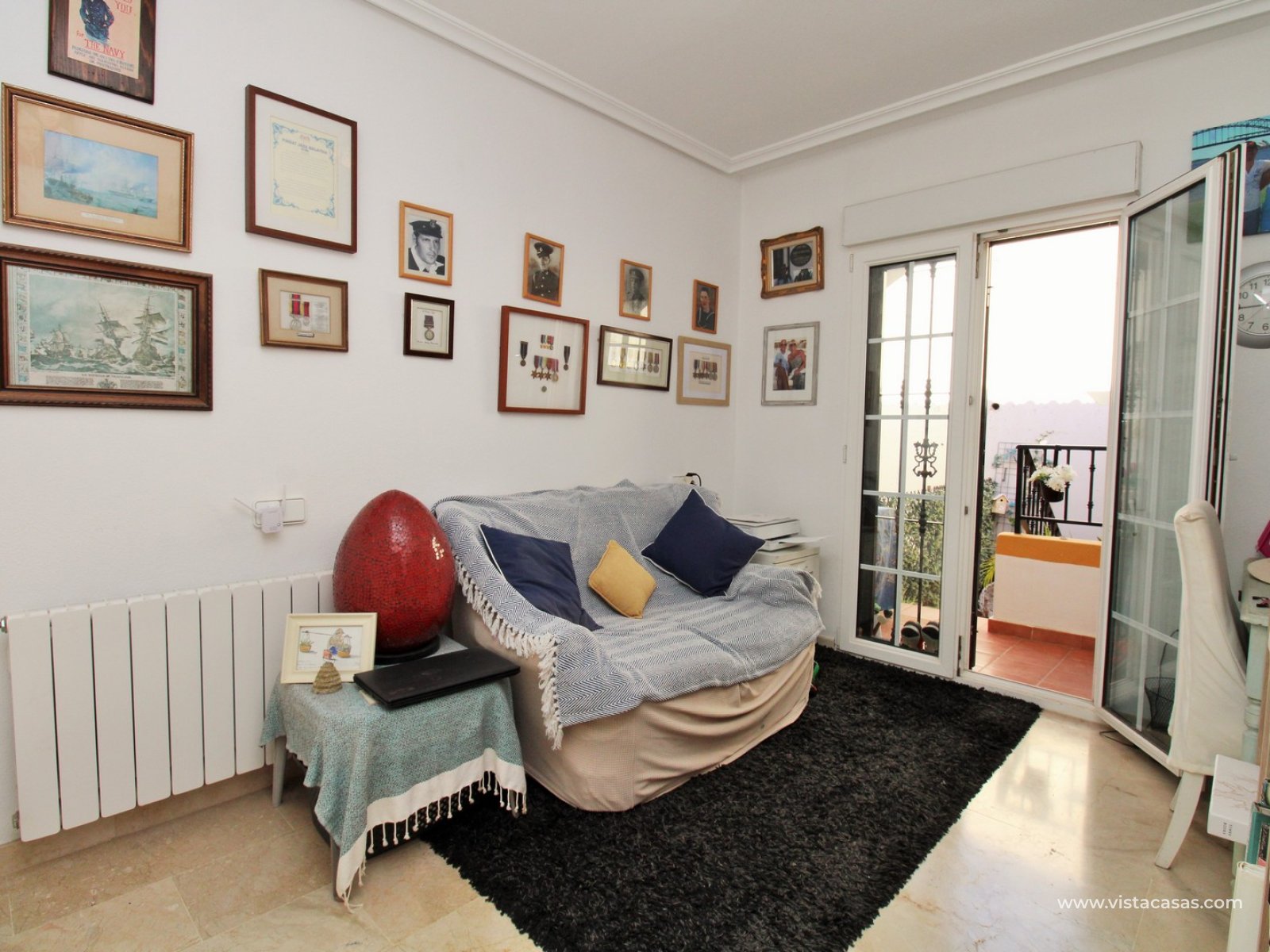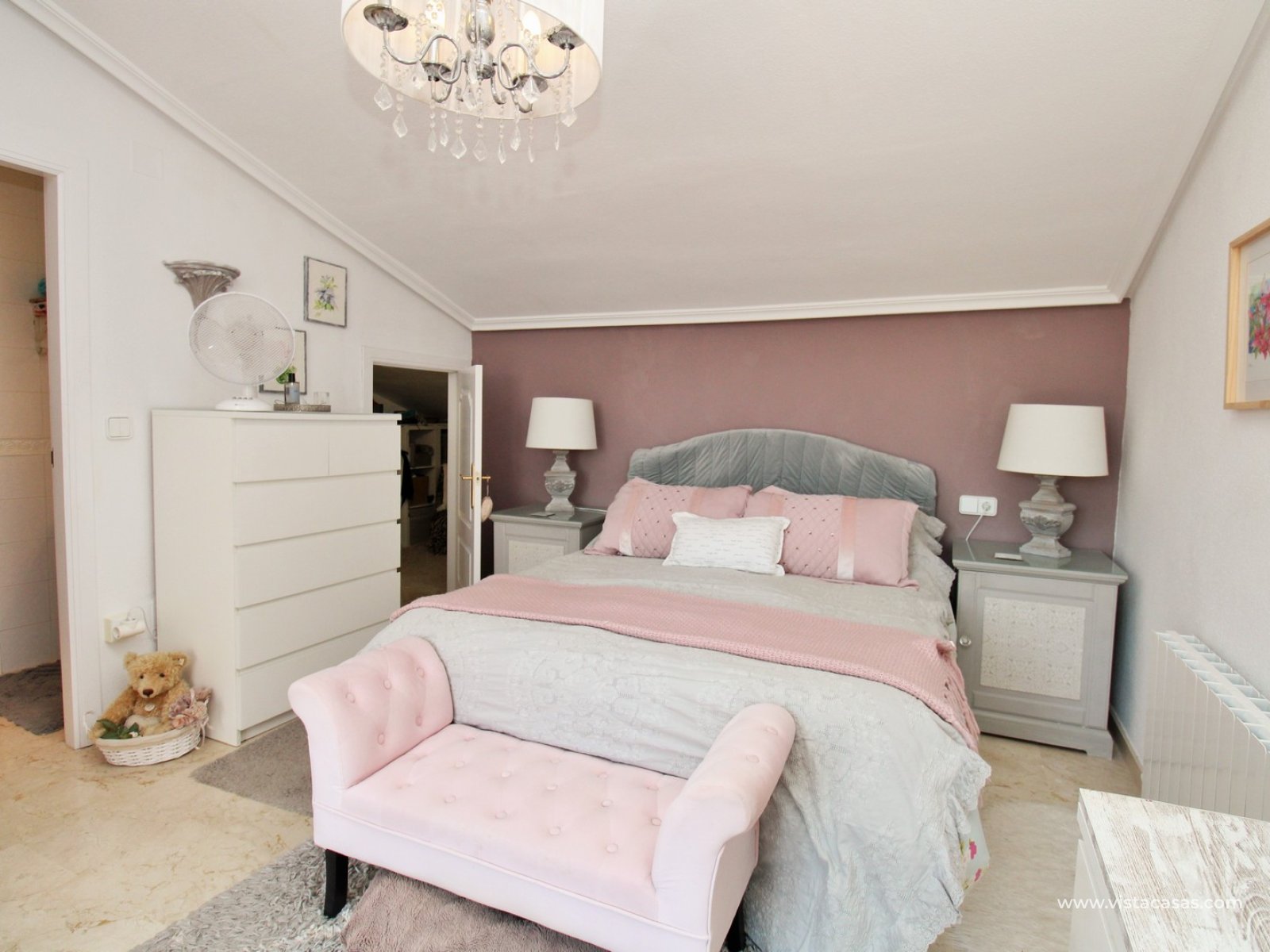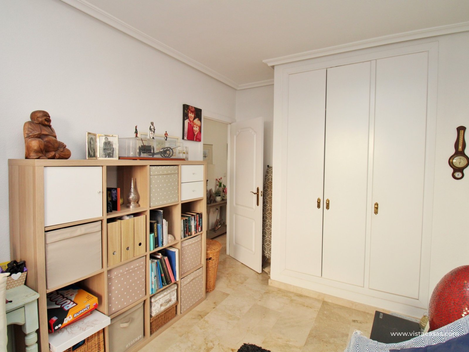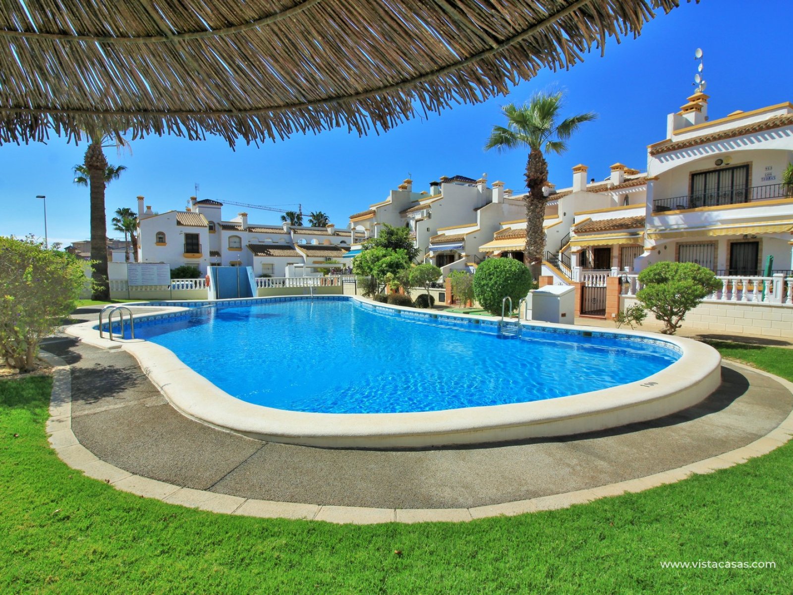 The ground floor offers a bright and spacious lounge–dining area with an open-plan kitchen and adjoining utility space. To the rear are two double bedrooms with fitted wardrobes, together with a family bathroom. French doors from one of the bedrooms open onto the rear tiled garden/terrace, complete with retractable awnings for shade and comfort. To the front, there is an additional tiled garden with a raised, covered terrace which overlooks the pool, beneath which is a useful storage room. On the first floor, the master bedroom features high ceilings, an en-suite bathroom with walk-in shower, ample storage within the built-in storeroom, and direct access to a large private solarium. The solarium can also be reached from the landing and enjoys sunshine throughout the day and views of the pool.