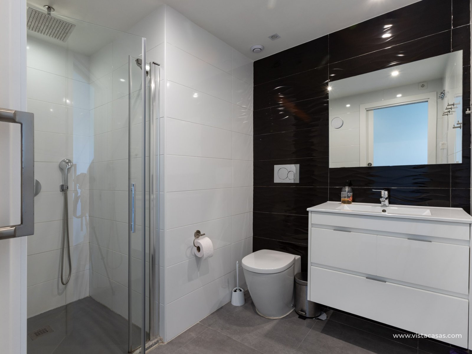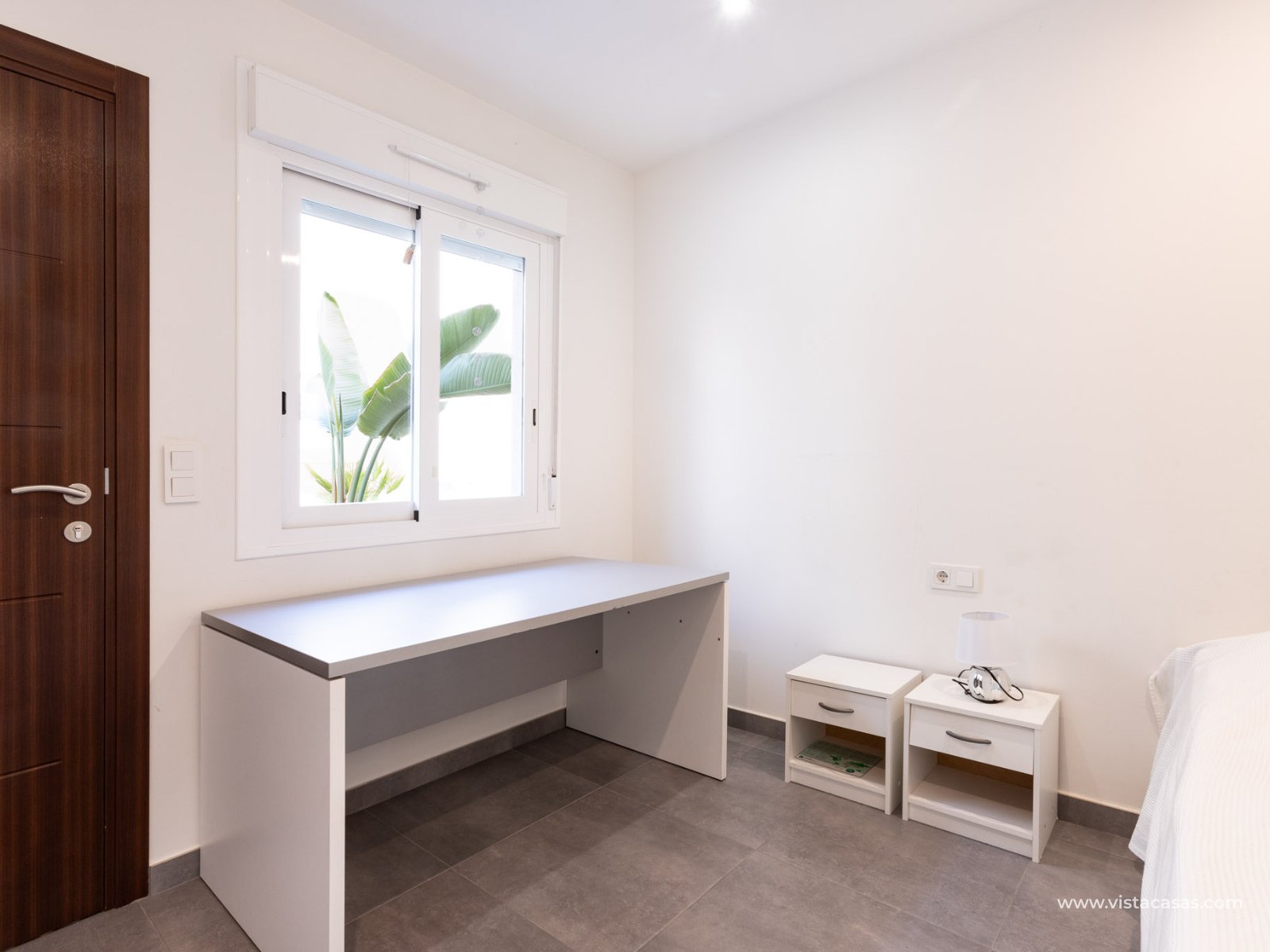 Bright Bungalow in Aguas Nuevas This single-story bungalow offers a practical layout and a prime location in Torrevieja's Aguas Nuevas. Spacious rooms, a private yard, and modern conveniences make this home an excellent choice for families and couples alike. Spacious and Functional Layout The property features an open-plan kitchen-living area, three bedrooms, and two bathrooms. The bedrooms are designed with functionality in mind and offer plenty of closet space. The living room seamlessly connects to the outdoors through large sliding glass doors, opening to a covered terrace. Large West-Facing Yard The private yard offers ample space for sunbathing, children’s play, or hosting gatherings. The west-facing orientation ensures beautiful moments outdoors, especially during stunning sunsets. Modern Amenities and Shared Facilities The bungalow is equipped with air conditioning, ensuring comfortable indoor temperatures year-round. Additionally, the property includes a garage parking space. Residents of the community have access to beautiful and expansive swimming pool areas. Convenient Location Close to Amenities Aguas Nuevas provides all daily services within walking distance: Shops are only 300 meters away. A school is located just across the street. Quiron Hospital is approximately 800 meters away. Sports center and Parque Antonio Soria are about 500 meters away. The beach is roughly 2 kilometers away. Make This Your Dream Home This bungalow combines modern interiors, a private yard, and an excellent location. Come and see it for yourself – find your dream home in Aguas Nuevas!