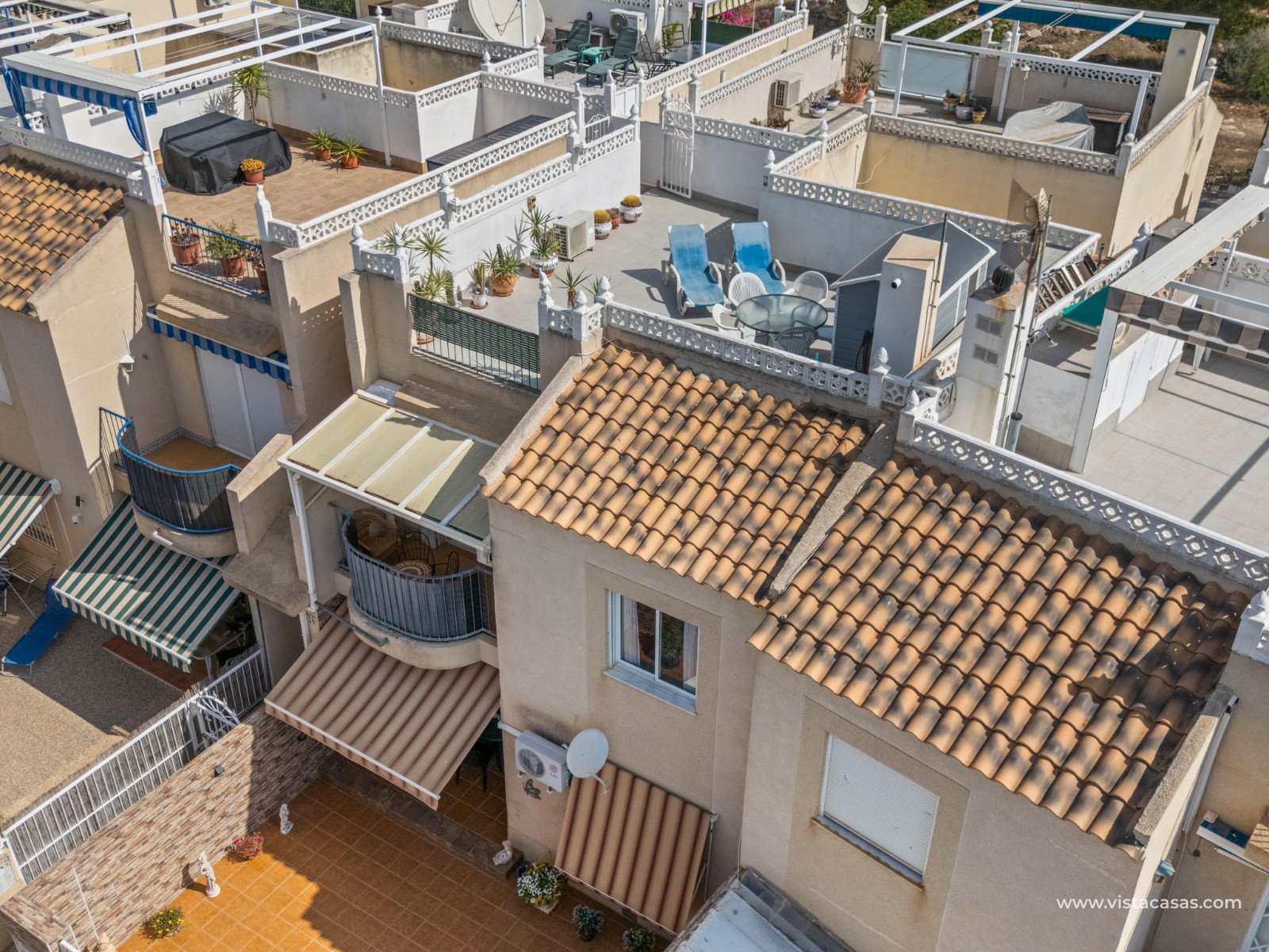 Welcome to the peaceful atmosphere of El Chaparral – a neighbourhood where the warmth of the Mediterranean meets scenic walking trails and the famous pink salt lake. This charming top-floor bungalow offers a cosy living experience and a private roof terrace where everyday life feels like a holiday. Functional layout and private solarium This home features a practical layout: two bedrooms, a bathroom, kitchen, and a bright living room that opens onto a covered balcony. With three air conditioning units – one in each main room – comfort is guaranteed all year round. An external staircase leads to your own rooftop terrace, the solarium. This private space is ideal for sunbathing, barbecuing, or enjoying a peaceful morning coffee while the sun rises over the city skyline and the sky opens in all directions. Community pool for added comfort The residence has access to a communal pool area, perfect for refreshing dips on warm days. It’s a delightful addition that brings a touch of holiday feel to your everyday life, just steps from your door. El Chaparral – peaceful yet well-connected El Chaparral is known for its tranquil environment, green streets, and proximity to nature. You’ll find cafés, restaurants, and essential services nearby. The area also features a large, popular municipal park with facilities ranging from padel courts and playgrounds to an outdoor gym. Just around the corner lies the Torrevieja–La Mata Natural Park, offering fantastic nature trails and relaxing outdoor experiences. This bungalow is a great fit if you’re looking for easy and pleasant living with your own outdoor space, in a peaceful yet well-connected area. Welcome to view – this home will charm you with its atmosphere.Community fees 320 euros per yearProperty tax approx 118 euros per year.