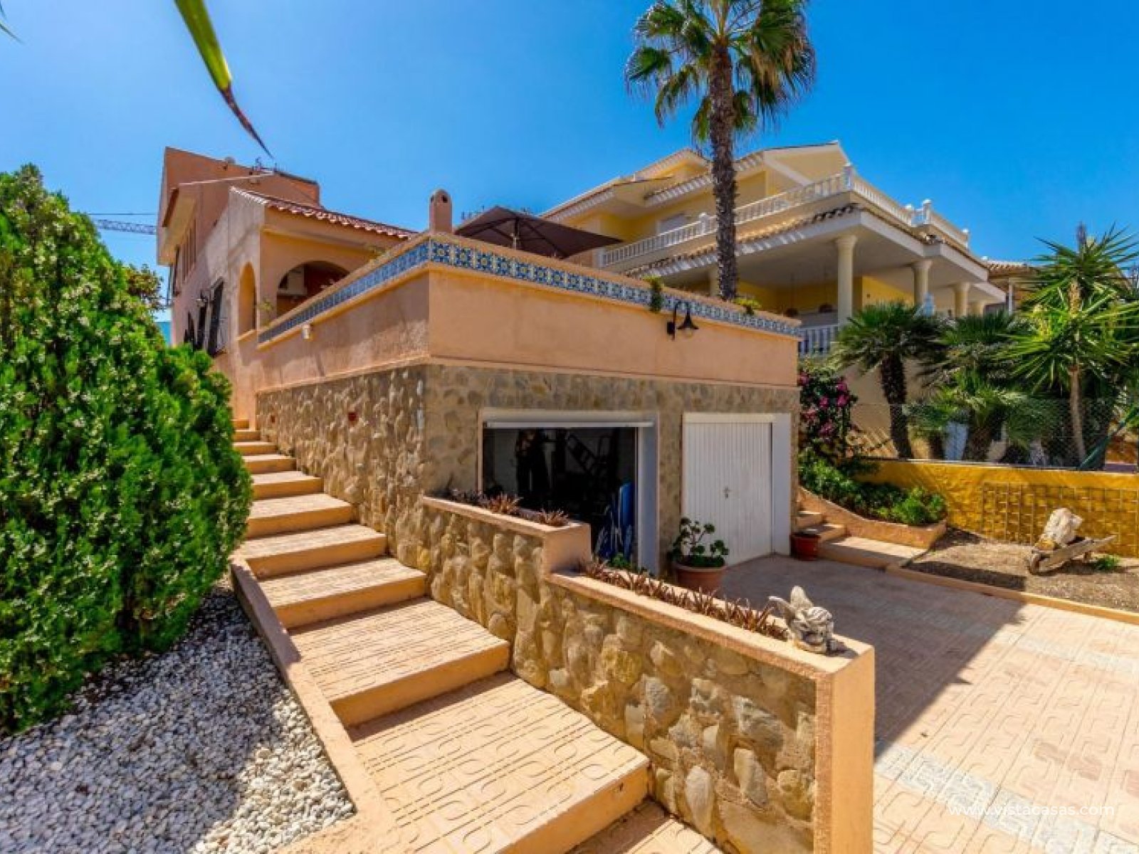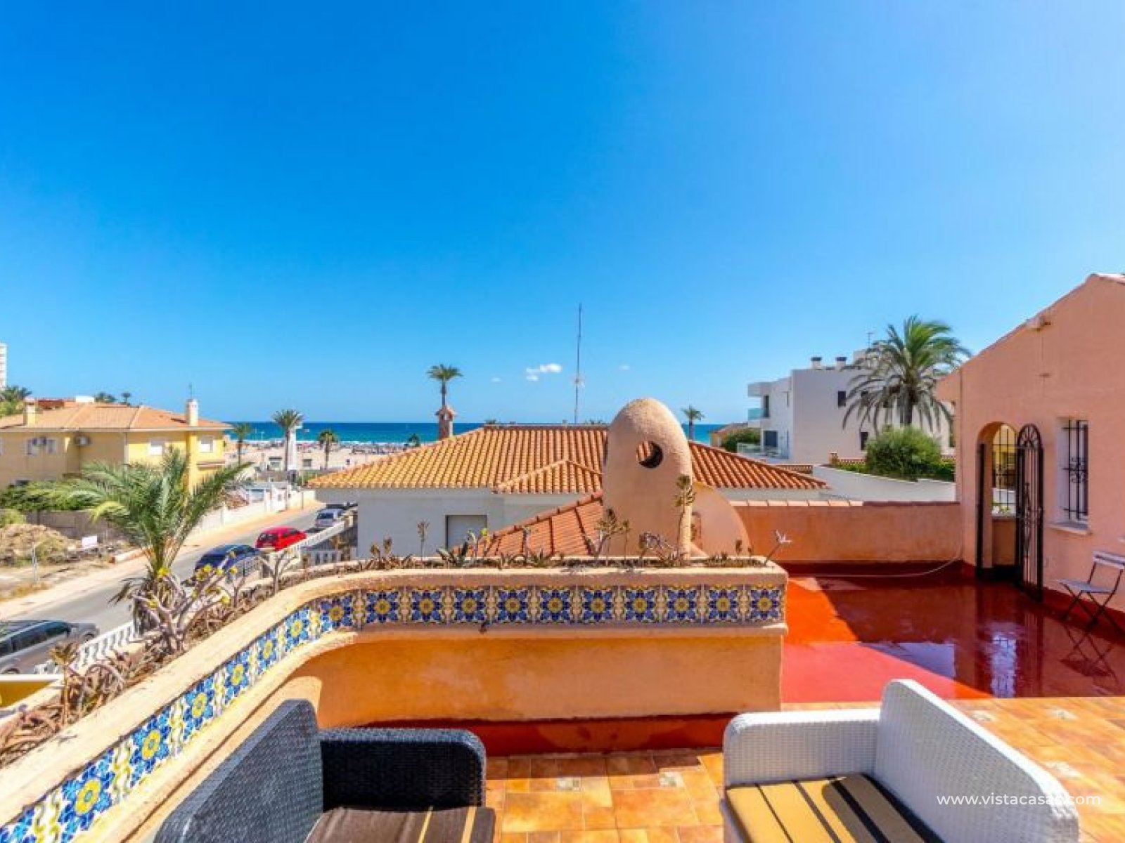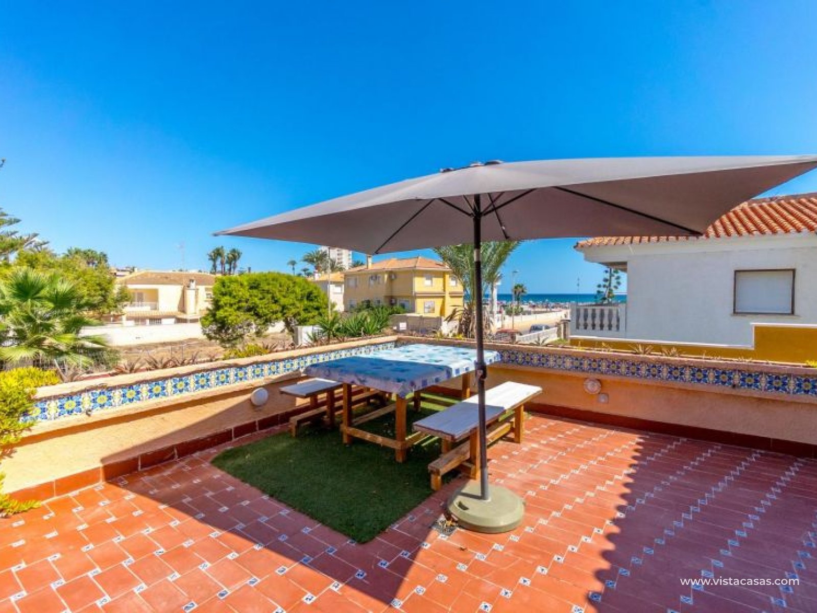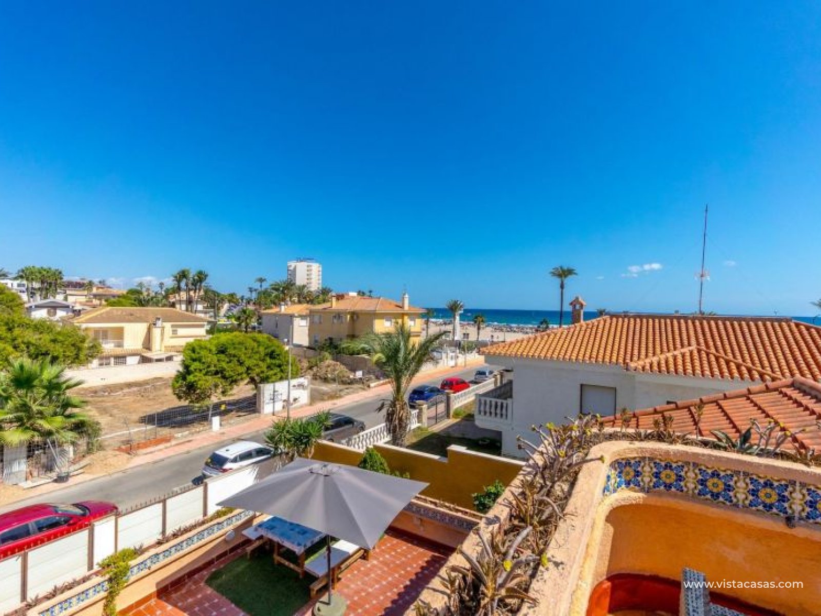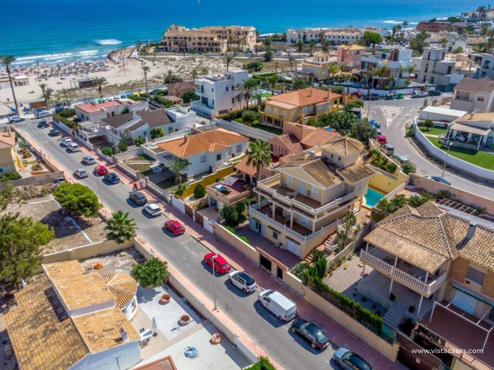 Spectacular detached villa by La Zenia Beach Can you imagine living with your feet almost in the sand? This stunning home makes it possible. Located in La Zenia (Orihuela Costa), one of the most exclusive areas of the Mediterranean Coast, you will enjoy sunshine all year round, the sea just a few steps away, and a lively environment with shops, restaurants, leisure options, and the famous La Zenia Boulevard shopping centre. The property offers a 600 m² private plot and a 220 m² house distributed over three staggered floors adapted to the terrain. Layout of the property: Ground floor: large terrace with direct sea views, covered porch, living room with fireplace, separate dining room, fully equipped kitchen with office area, laundry room and guest bathroom. Perfect for family gatherings or entertaining friends. First floor: 3 bedrooms, the master with walk-in wardrobe, en-suite bathroom and private terrace. Plus another full bathroom and a spectacular solarium-terrace to enjoy the sun and sea views all year round. Street level: closed garage with direct access. Outdoors: private garden, swimming pool, barbecue area and several spaces to relax under the Mediterranean sun. This villa is ideal as a permanent residence thanks to its size and comfort, or as a dream holiday home by the sea. La Zenia is one of the most sought-after areas of the Costa Blanca, famous for its sandy beaches, crystal-clear waters, wide range of restaurants, services, sports areas and its excellent connections to Alicante and Murcia. Don’t miss the chance to live by the sea. Book your visit today and discover your new home in La Zenia.