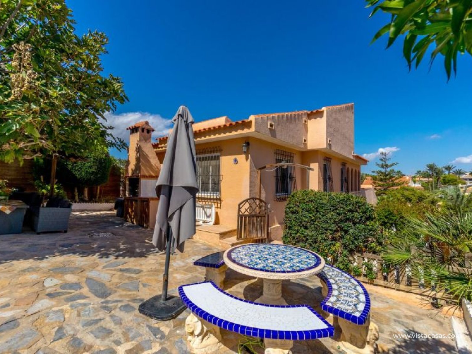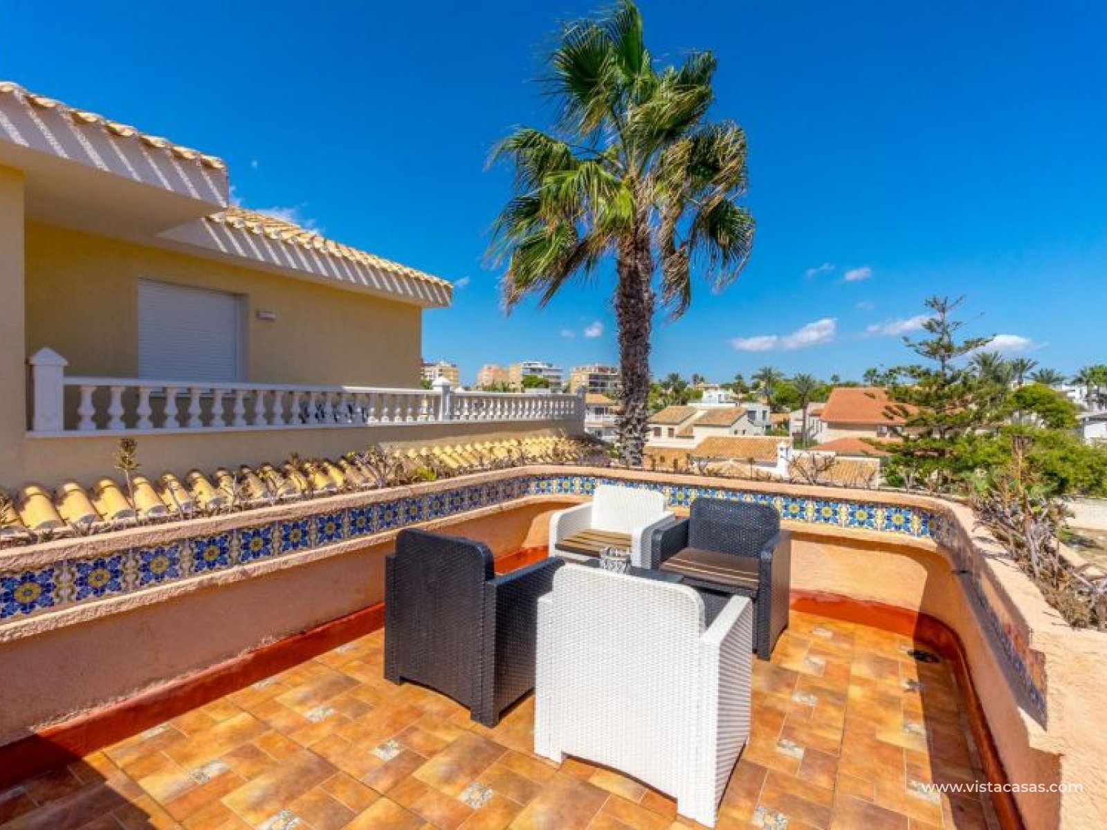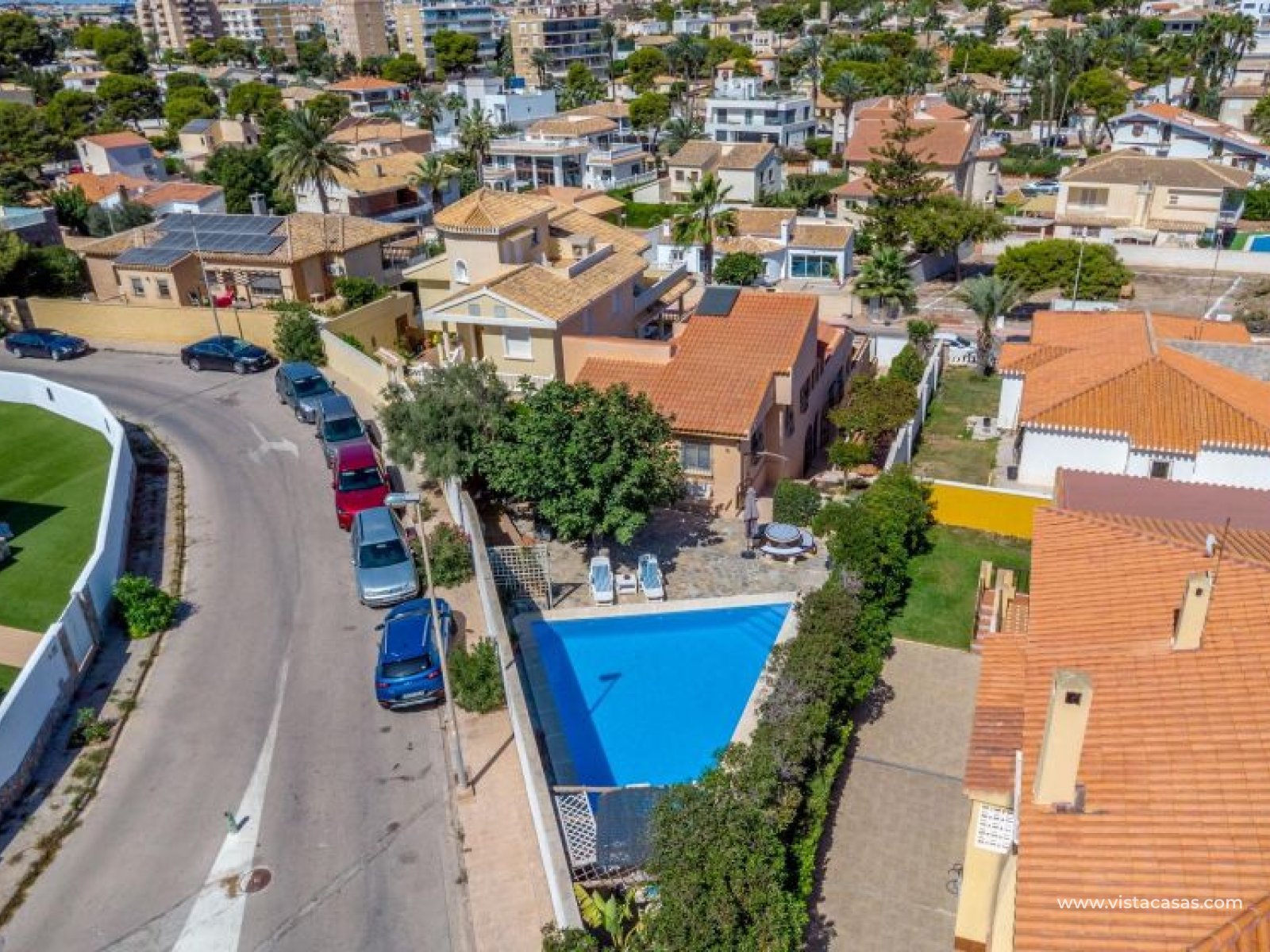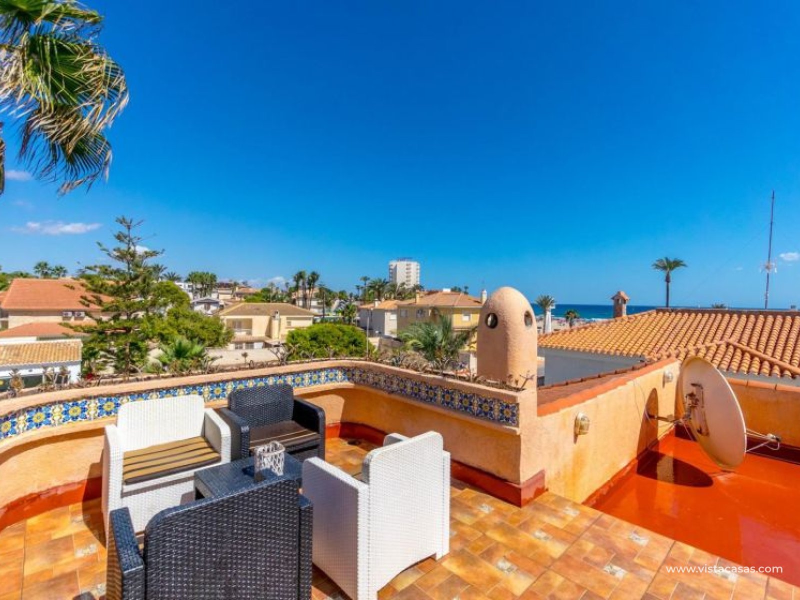 Spectacular detached villa by La Zenia Beach Can you imagine living with your feet almost in the sand? This stunning home makes it possible. Located in La Zenia (Orihuela Costa), one of the most exclusive areas of the Mediterranean Coast, you will enjoy sunshine all year round, the sea just a few steps away, and a lively environment with shops, restaurants, leisure options, and the famous La Zenia Boulevard shopping centre. The property offers a 600 m² private plot and a 220 m² house distributed over three staggered floors adapted to the terrain. Layout of the property: Ground floor: large terrace with direct sea views, covered porch, living room with fireplace, separate dining room, fully equipped kitchen with office area, laundry room and guest bathroom. Perfect for family gatherings or entertaining friends. First floor: 3 bedrooms, the master with walk-in wardrobe, en-suite bathroom and private terrace. Plus another full bathroom and a spectacular solarium-terrace to enjoy the sun and sea views all year round. Street level: closed garage with direct access. Outdoors: private garden, swimming pool, barbecue area and several spaces to relax under the Mediterranean sun. This villa is ideal as a permanent residence thanks to its size and comfort, or as a dream holiday home by the sea. La Zenia is one of the most sought-after areas of the Costa Blanca, famous for its sandy beaches, crystal-clear waters, wide range of restaurants, services, sports areas and its excellent connections to Alicante and Murcia. Don’t miss the chance to live by the sea. Book your visit today and discover your new home in La Zenia.