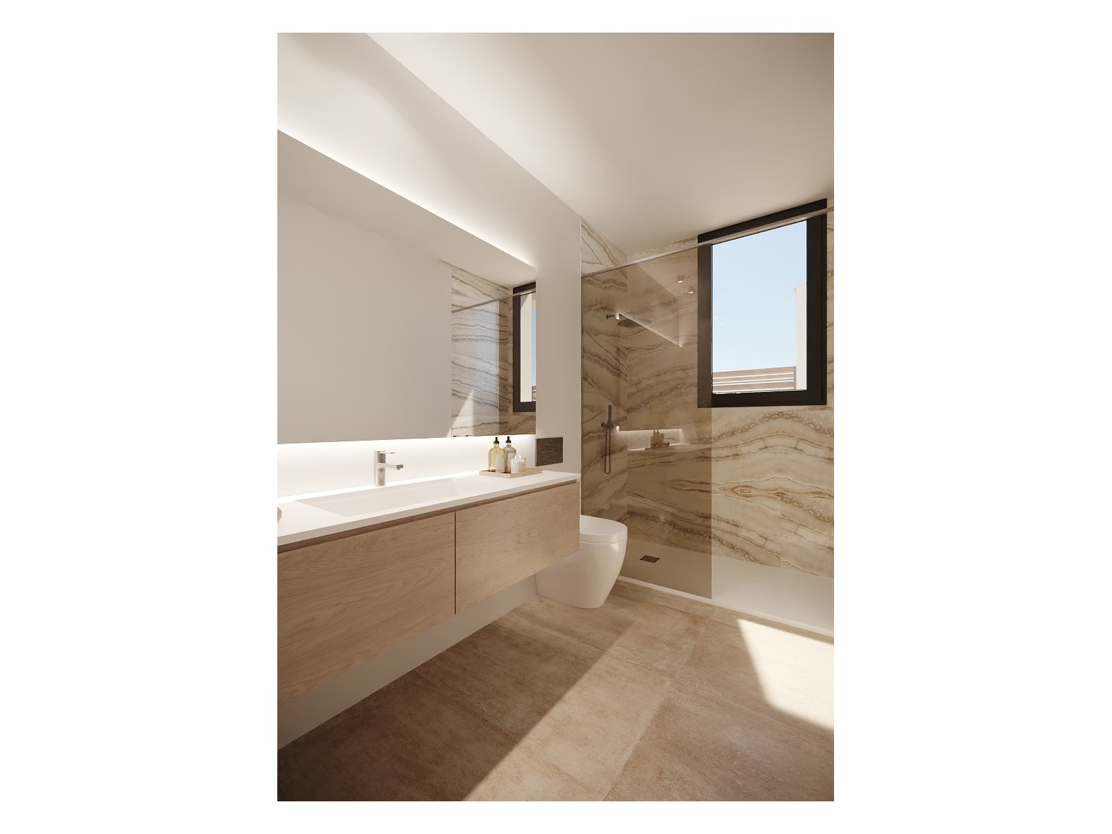 The exterior design is equally appealing. Each home features a private garden, ideal for enjoying the Mediterranean climate. The terraces and solariums offer multiple options for outdoor relaxation, while the private pool in each property adds a touch of luxury, allowing residents to refresh and unwind in the comfort of their home. The proximity to the golf course is an additional attraction, offering the possibility to enjoy this pastime just minutes from home.