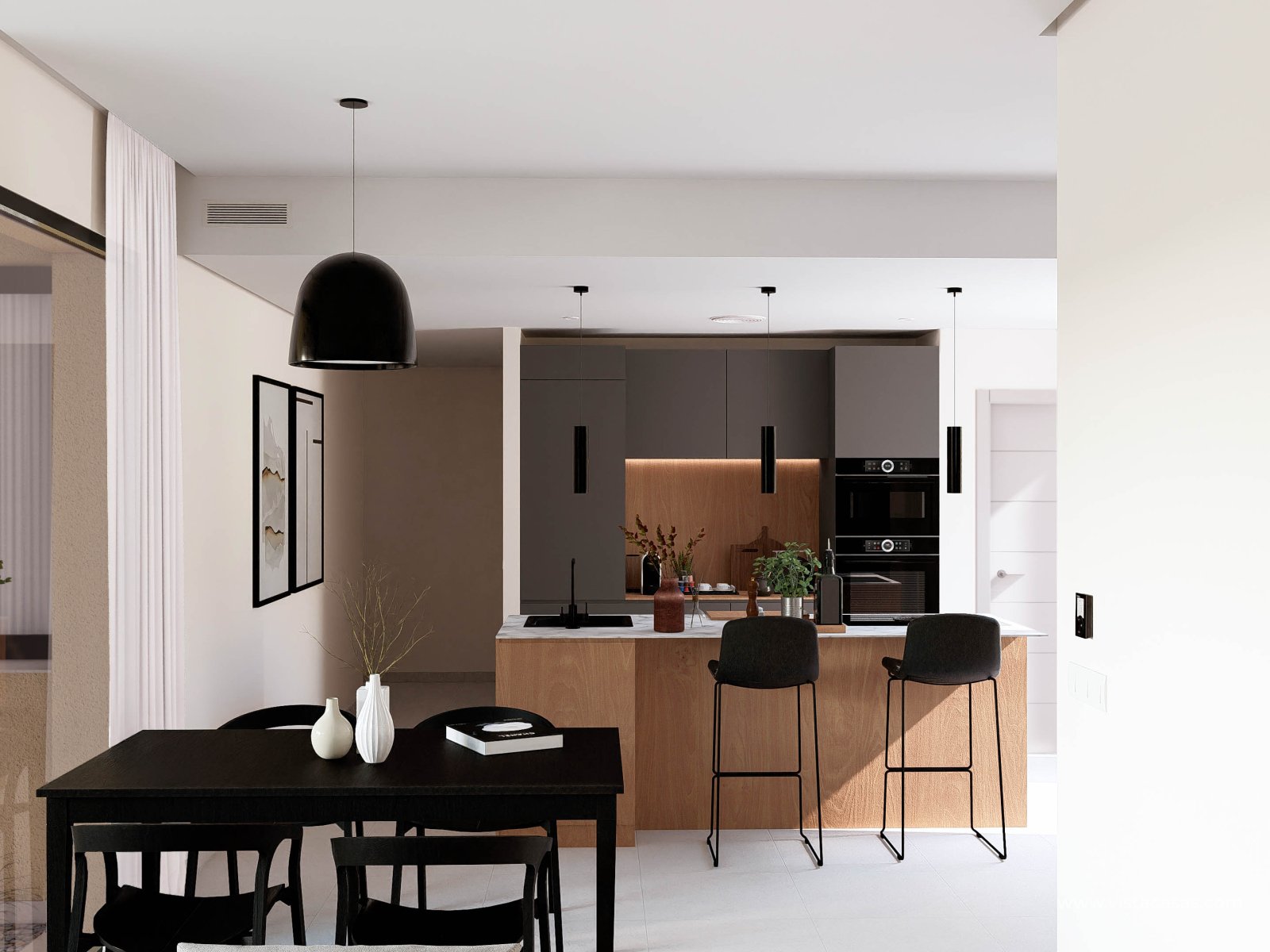 The available homes cater to various family needs, offering options of 2, 3, 4, and up to 5 bedrooms, along with 2 or 3 bathrooms. This design ensures space and comfort for all household members, allowing for an inviting and functional environment. The interior reflects a modern design with porcelain tile flooring, providing sophistication and ease of maintenance. Additionally, the air conditioning system ensures a comfortable atmosphere year-round. The built-in wardrobes optimize the available space, offering practical and elegant storage solutions.