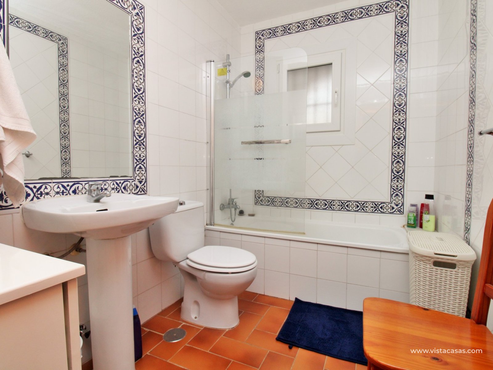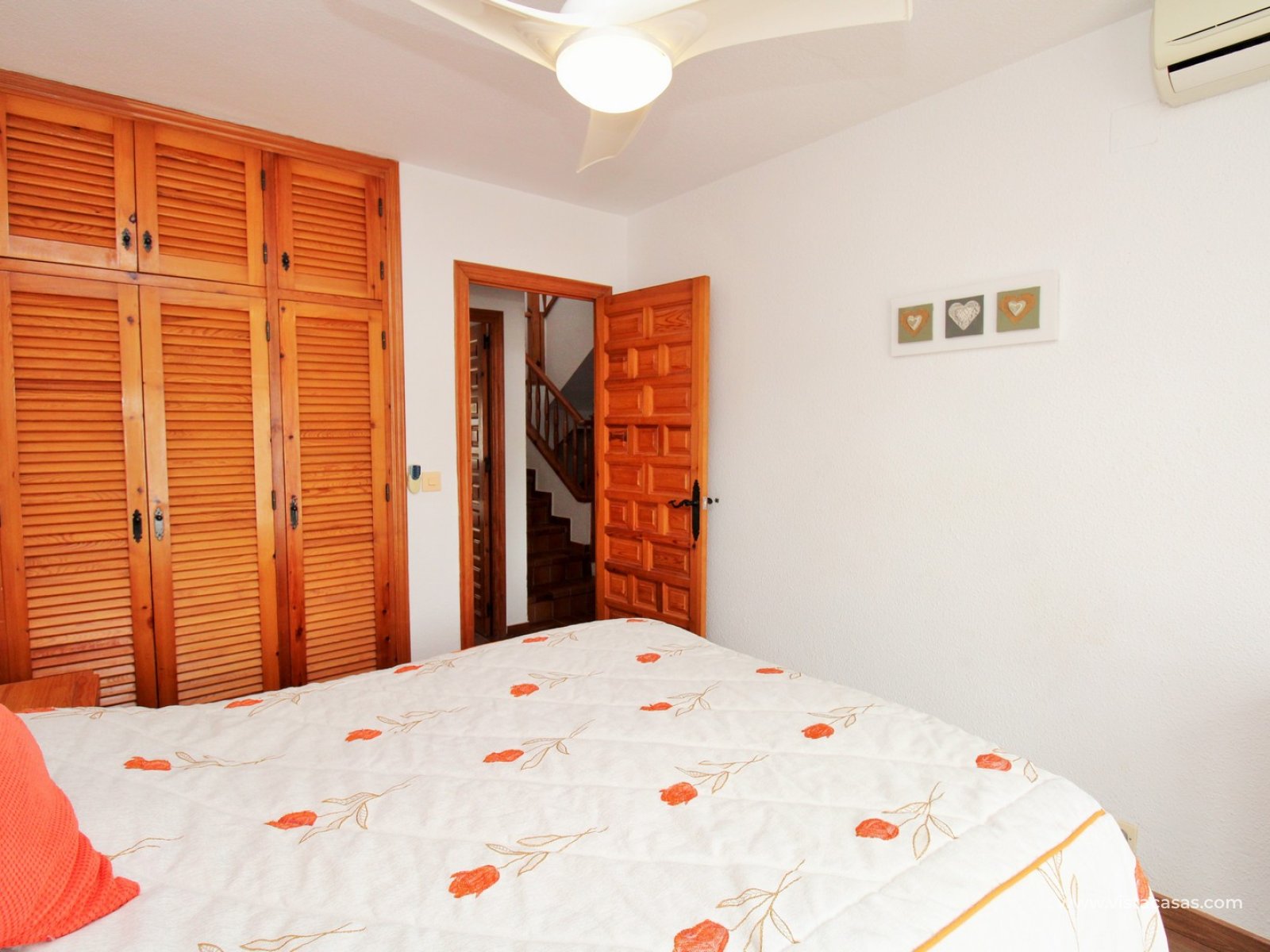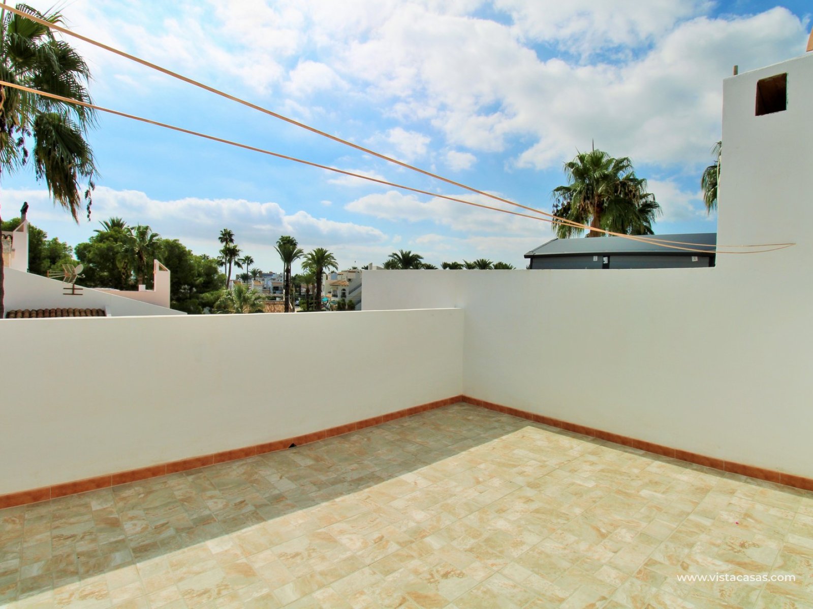 The ground floor features a spacious lounge–dining area with guest WC, an open-plan kitchen to the rear, and a utility room with direct access to the back garden. Upstairs, there are two double bedrooms with fitted wardrobes and a family bathroom. The main bedroom benefits from a private South-facing balcony overlooking the central fountain of Verdemar III. Internal stairs from the landing lead to the roof solarium, which offers far-reaching views of the sea. The property is sold furnished and includes air-conditioning.