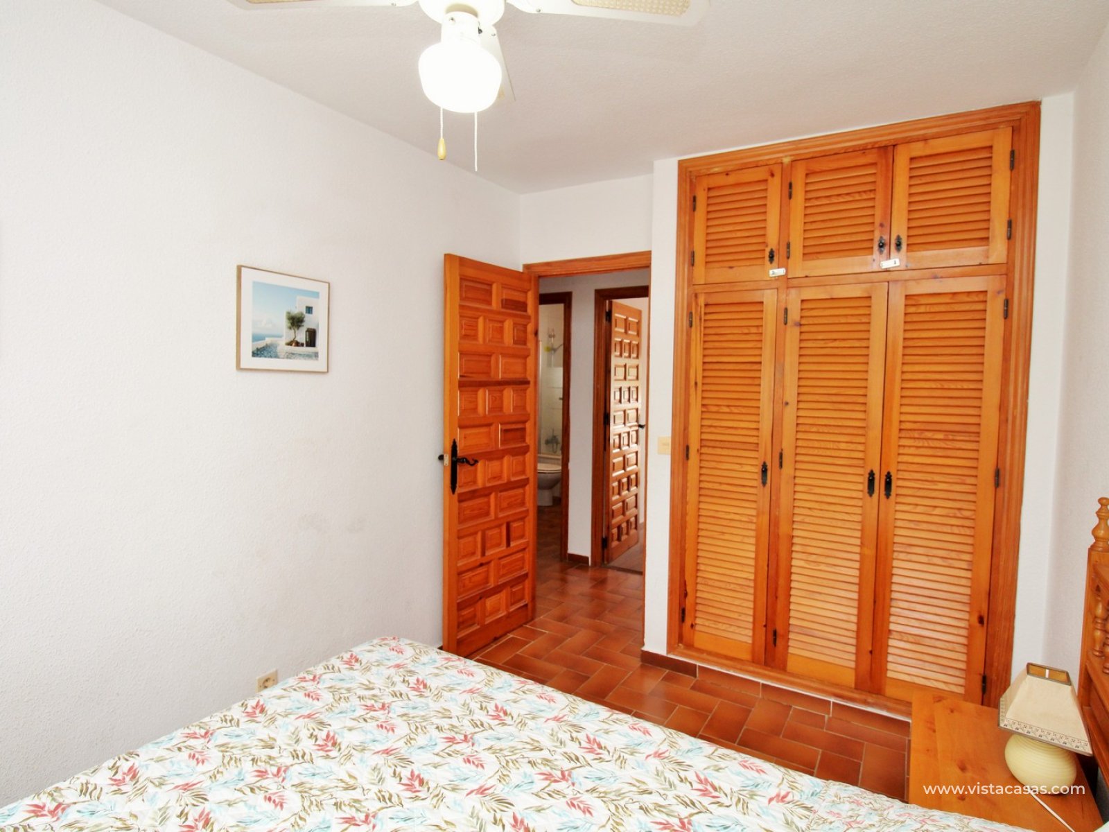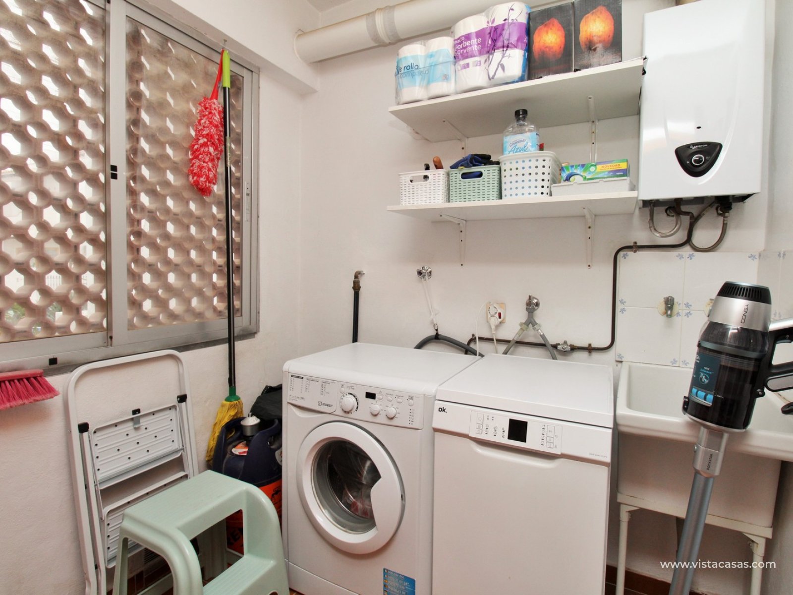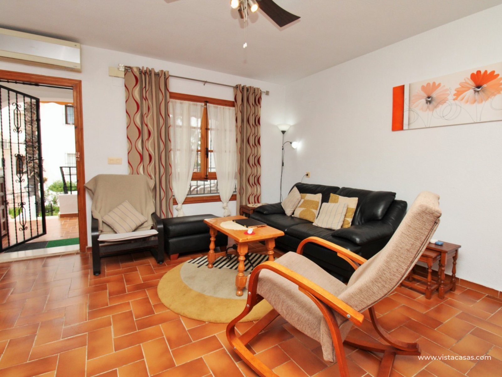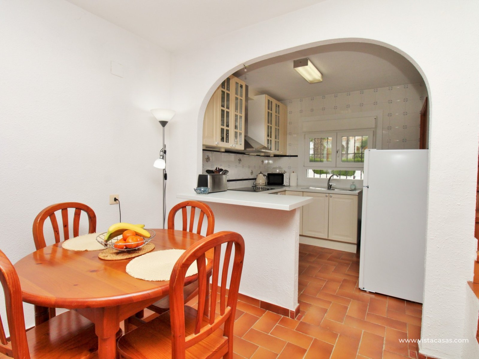 The ground floor features a spacious lounge–dining area with guest WC, an open-plan kitchen to the rear, and a utility room with direct access to the back garden. Upstairs, there are two double bedrooms with fitted wardrobes and a family bathroom. The main bedroom benefits from a private South-facing balcony overlooking the central fountain of Verdemar III. Internal stairs from the landing lead to the roof solarium, which offers far-reaching views of the sea. The property is sold furnished and includes air-conditioning.