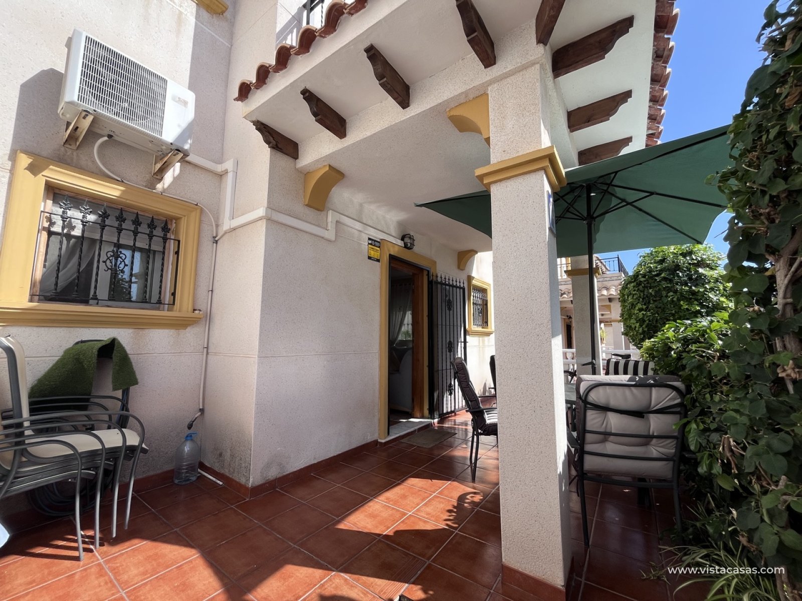 Perfect opportunity to own your very own traditional-style 3-bedroom, 2-bathroom south-facing quad located in the peaceful and sought-after residential area of San Jose IV, La Zenia. This bright and well-maintained home combines comfort with classic Mediterranean charm. Front terrace area at the entrance — the perfect spot to enjoy the sun all day. The private solarium provides partial sea views, creating an ideal space to relax and unwind, a private driveway and a spacious sun-drenched terrace for year-round enjoyment. The ground floor comprises a welcoming living area, a fitted kitchen, a bedroom, and a convenient WC. Upstairs are two generous bedrooms with built-in wardrobes and a stylish family bathroom. The master bedroom opens onto its own private balcony, while an internal staircase leads to a large private solarium with storage space and those partial sea views. Set within a well-kept community with access to a communal pool, the property is sold fully furnished, including white goods and air conditioning, ready to move into right away. Ideally located within walking distance to Zenia Boulevard, local restaurants, shops, and the vibrant Cabo Roig strip, while La Zenia Beach is just a 20-minute walk away. A fantastic opportunity to own a traditional home in one of the Costa Blanca’s most desirable coastal areas.