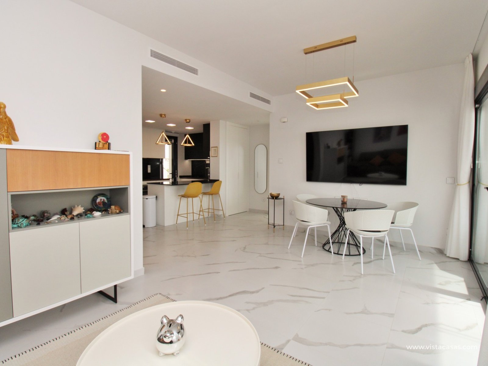 The apartment offers a bright and spacious open-plan layout, with marble flooring throughout, a contemporary fitted kitchen, and a comfortable lounge-dining area that flows directly out to the terrace — perfect for enjoying the Costa Blanca sunshine.