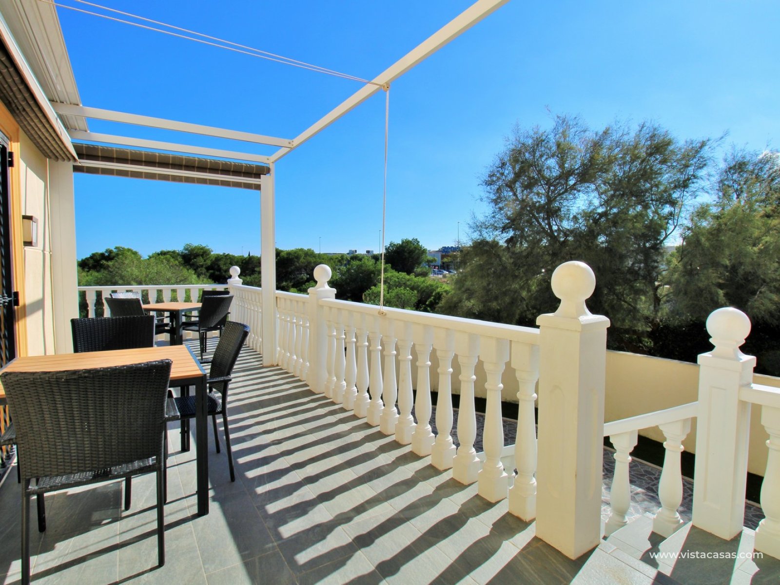 Inside, the ground floor features a bright and airy living and dining area, a large independent kitchen with access to the terrace, plus a double bedroom and a bathroom with walk-in shower. Upstairs, there are three double bedrooms with fitted wardrobes and a family bathroom. The master bedroom benefits from an en-suite bathroom and access to a private balcony with pool views. Internal stairs lead up to the generous roof solarium, complete with a retractable awning and lovely open views of the sea and surrounding area.