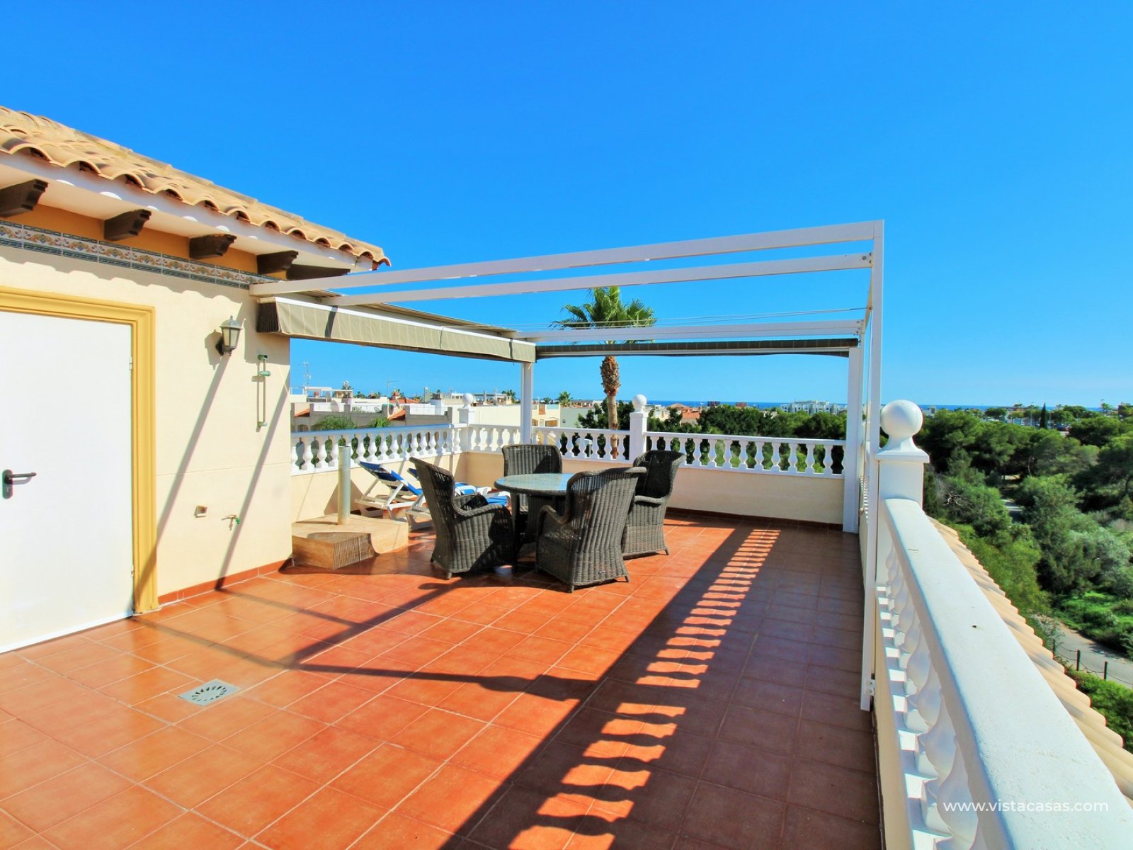The villa offers an impressive amount of outdoor space, including a tiled garden, driveway, raised front terrace, balcony overlooking the pool, and a large private roof solarium with sea and pool views — ideal for relaxing or entertaining.