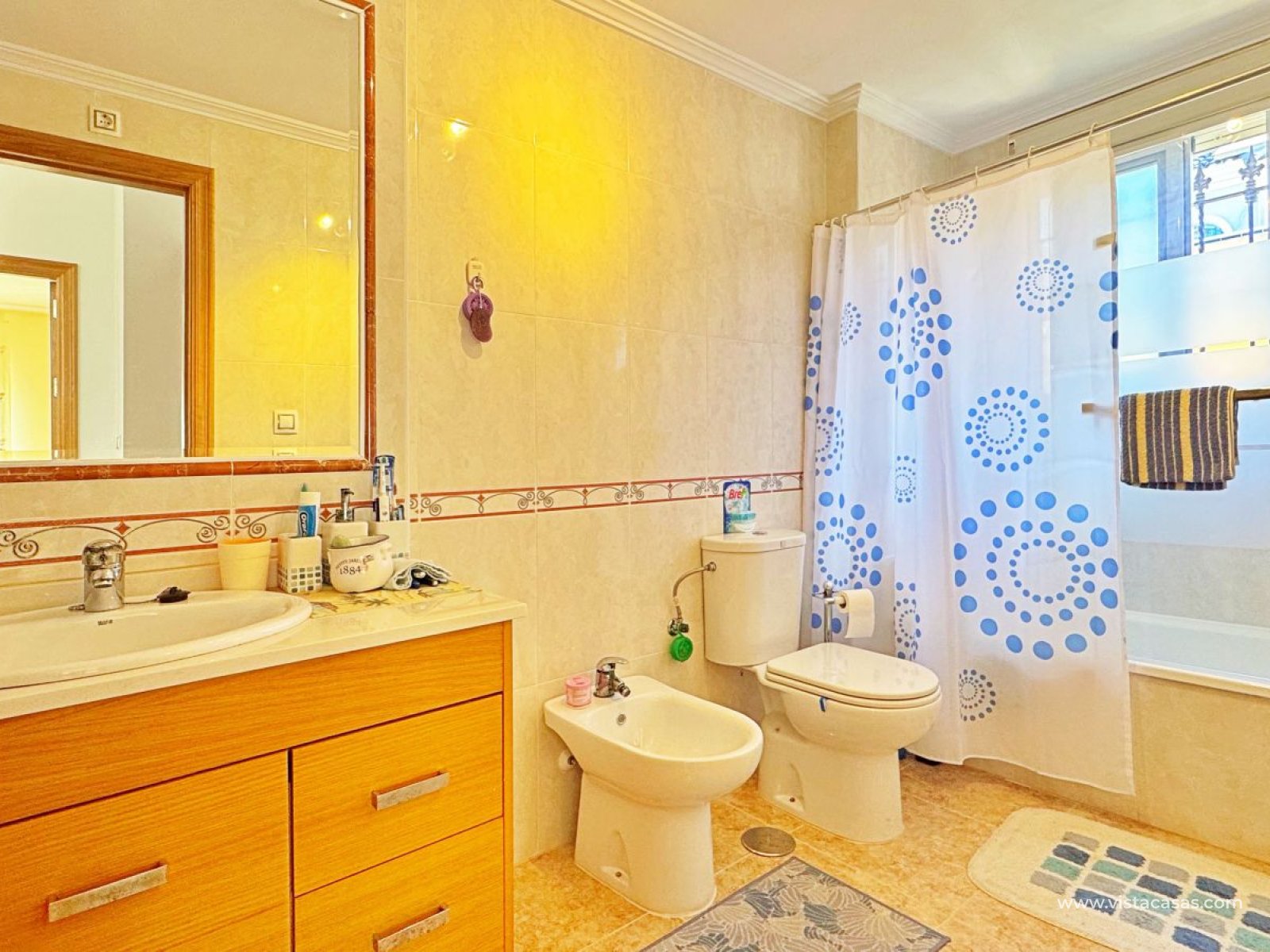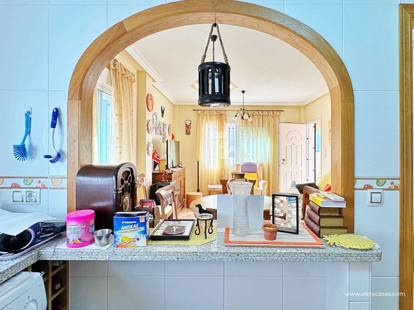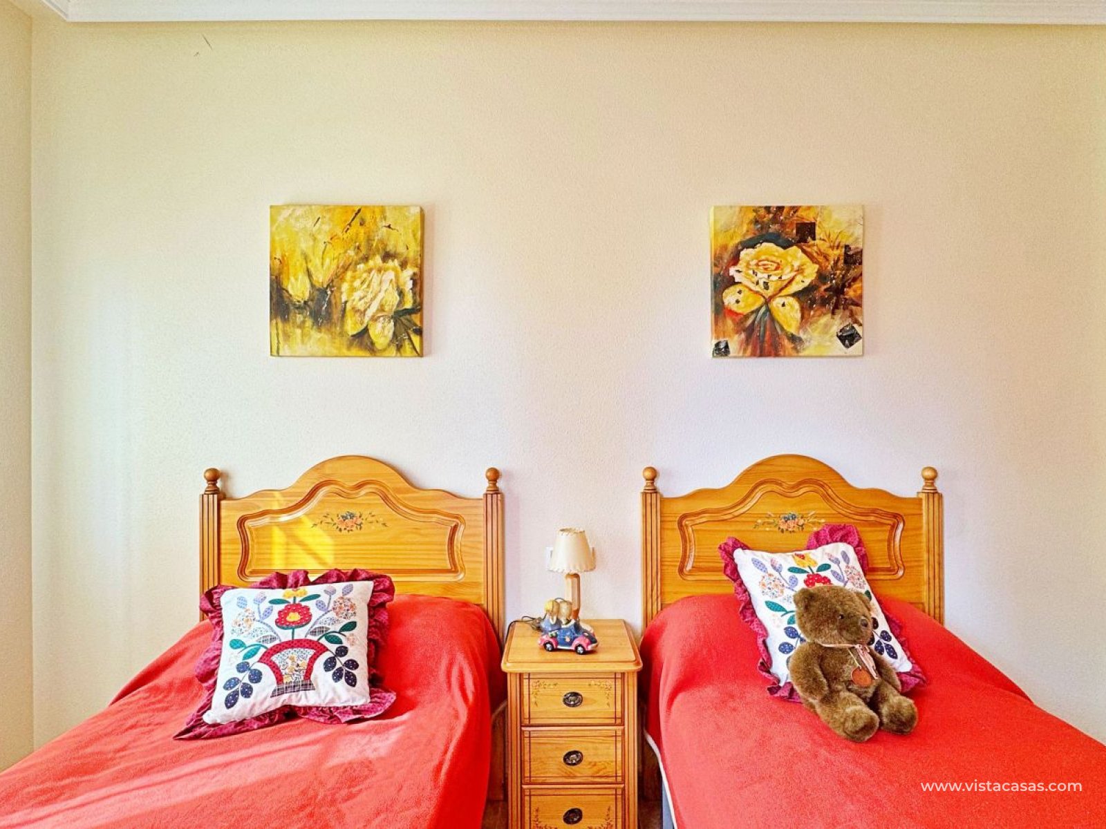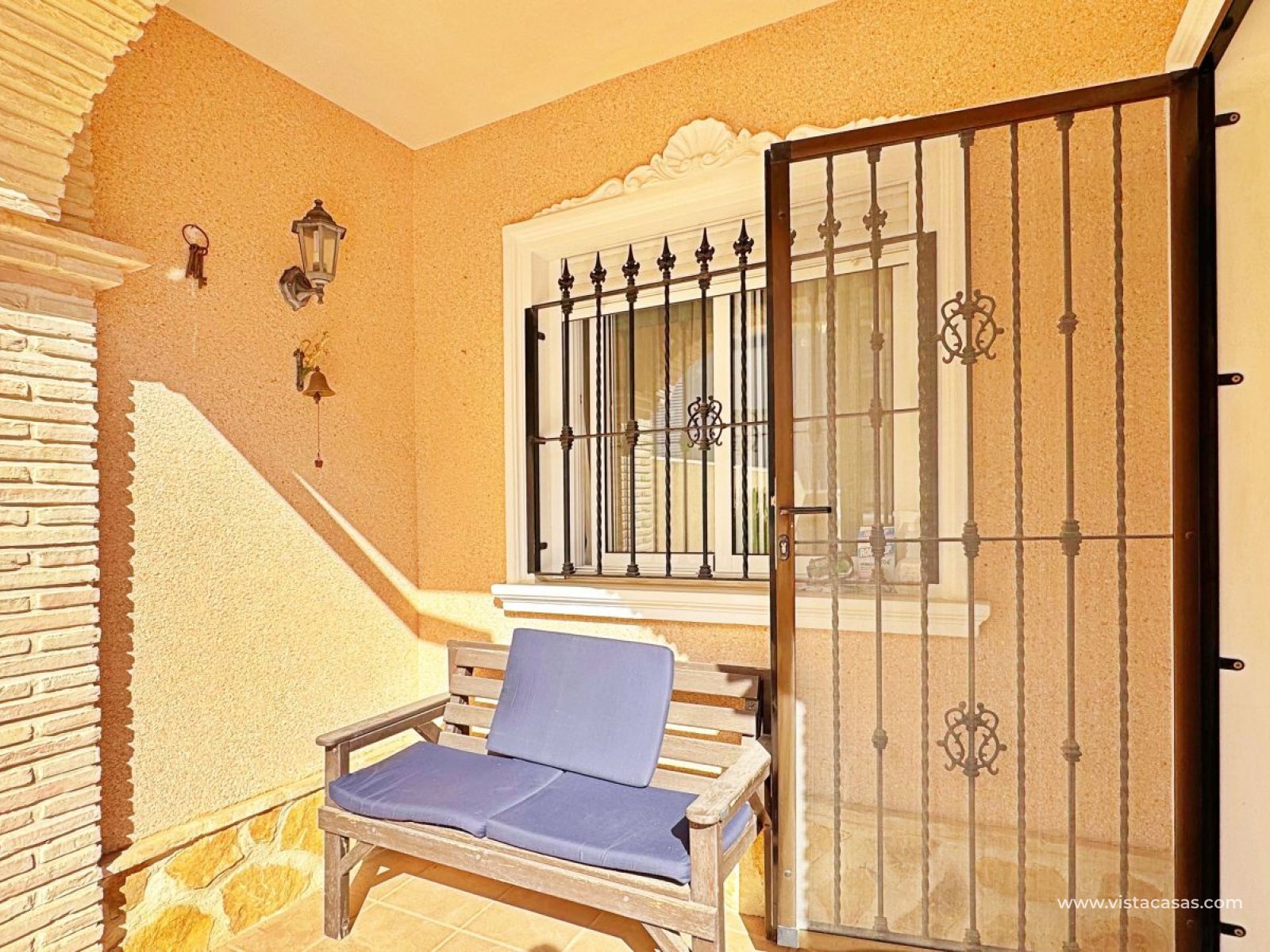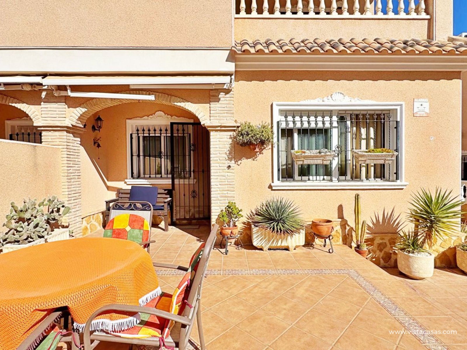 Beautiful corner quad-style duplex located in the exclusive Vista Azul Residential, one of the most desirable developments in Villamartin, Orihuela Costa. This home perfectly combines Mediterranean style, comfort and an excellent location within a quiet, family-friendly environment close to all essential amenities. With 90 m² of built area on a 120 m² plot, the property enjoys a southwest orientation, providing plenty of natural light all day long. The ground floor offers a bright living-dining room with direct access to the terrace, a fully equipped independent kitchen, one bedroom ideal for guests or a home office, and a complete bathroom. The upper floor features two bedrooms with fitted wardrobes, a second bathroom, and access to a 20 m² private solarium, perfect for sunbathing, relaxing or enjoying open views. The property is in excellent condition and equipped with air conditioning, awnings, security door and private parking inside the plot. The spacious terrace surrounding the house provides several outdoor dining and chill-out areas, ideal to enjoy the Mediterranean climate all year round. The Vista Azul complex offers exceptional communal facilities including two swimming pools (one covered), jacuzzi, sauna and gym, making it one of the most complete and sought-after communities in Villamartin. Located next to Villamartin Golf Course, close to La Zenia Boulevard and Playa Flamenca, and only 3 km from the beaches of Orihuela Costa, this home is perfect for those looking to buy a duplex in Villamartin or invest in a property for sale on the Costa Blanca. A charming property, ready to move into — ideal as a permanent home, a holiday residence or a real estate investment in Orihuela Costa.