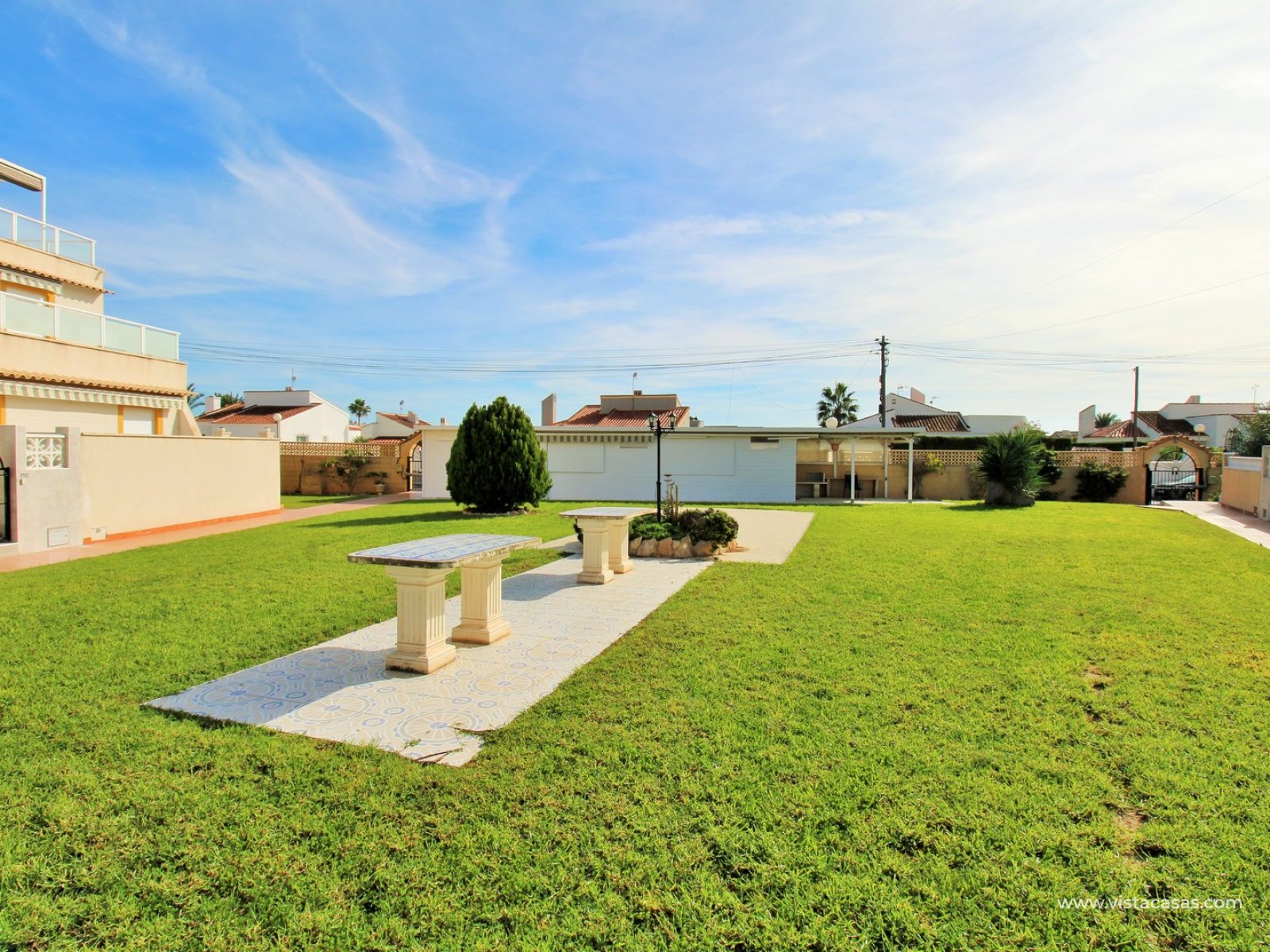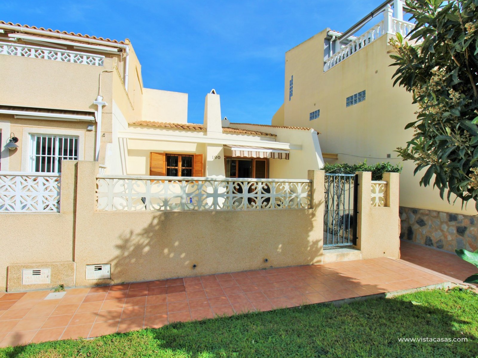 Vistacasas presents this exceptional end-of-terrace bungalow offering superb value in the gated community of Manzana 7, La Chismosa (Playa Flamenca). Enjoying a desirable south-west orientation, the home benefits from sunshine throughout the day and features a generous front terrace complete with built-in BBQ and retractable awnings—perfect for relaxing or entertaining. Residents also have access to beautifully maintained communal green areas.