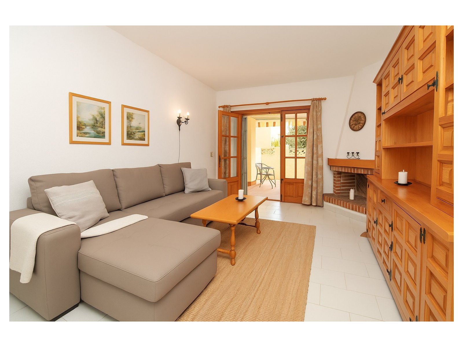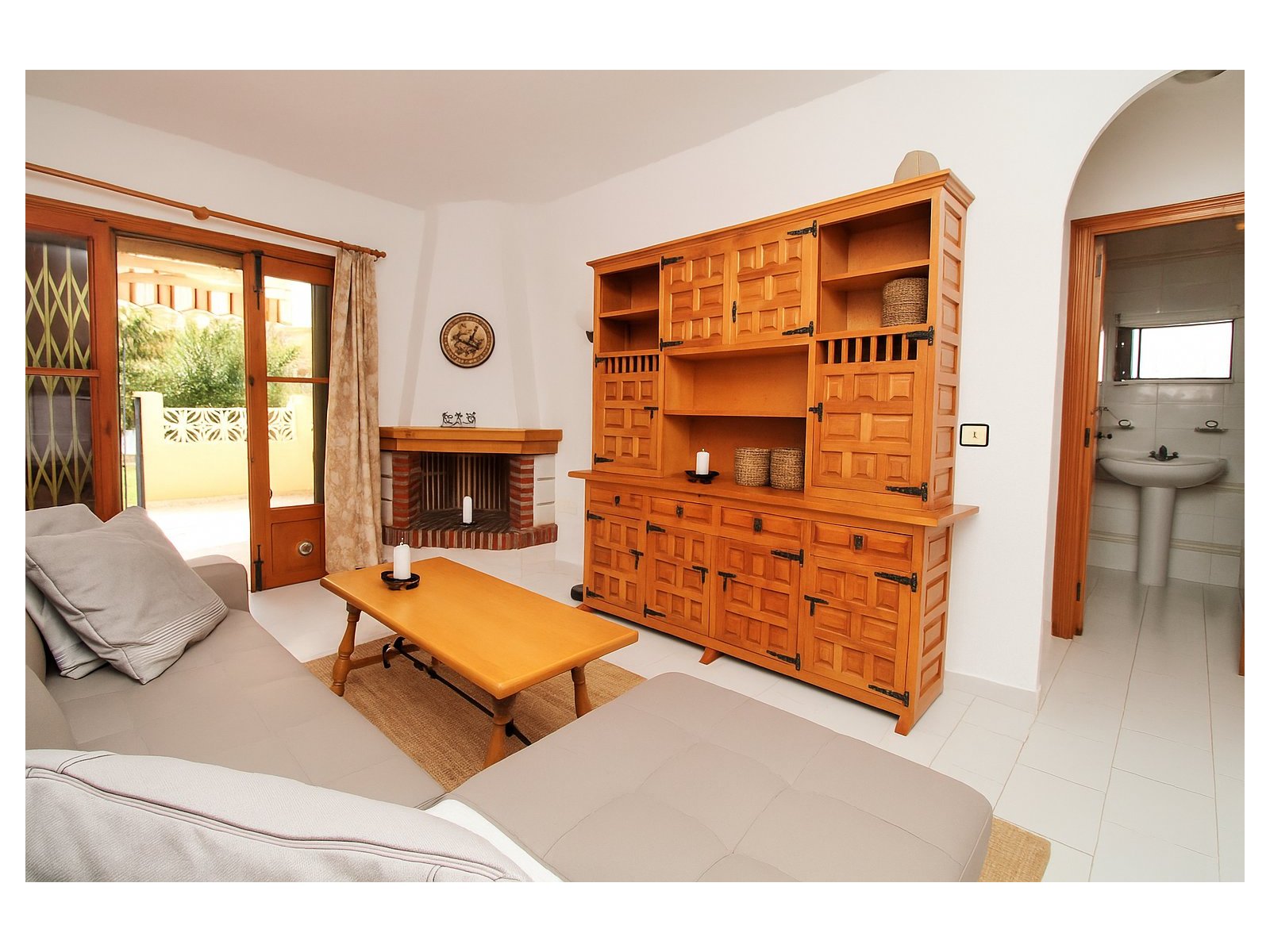 All living accommodation is arranged on one level, comprising a bright living room with feature fireplace, an open fully fitted kitchen to the rear with access to an exterior utility area, and a small hallway leading to a light and airy double bedroom with fitted wardrobes and a bathroom with walk-in shower. The property is offered fully furnished and includes air-conditioning.