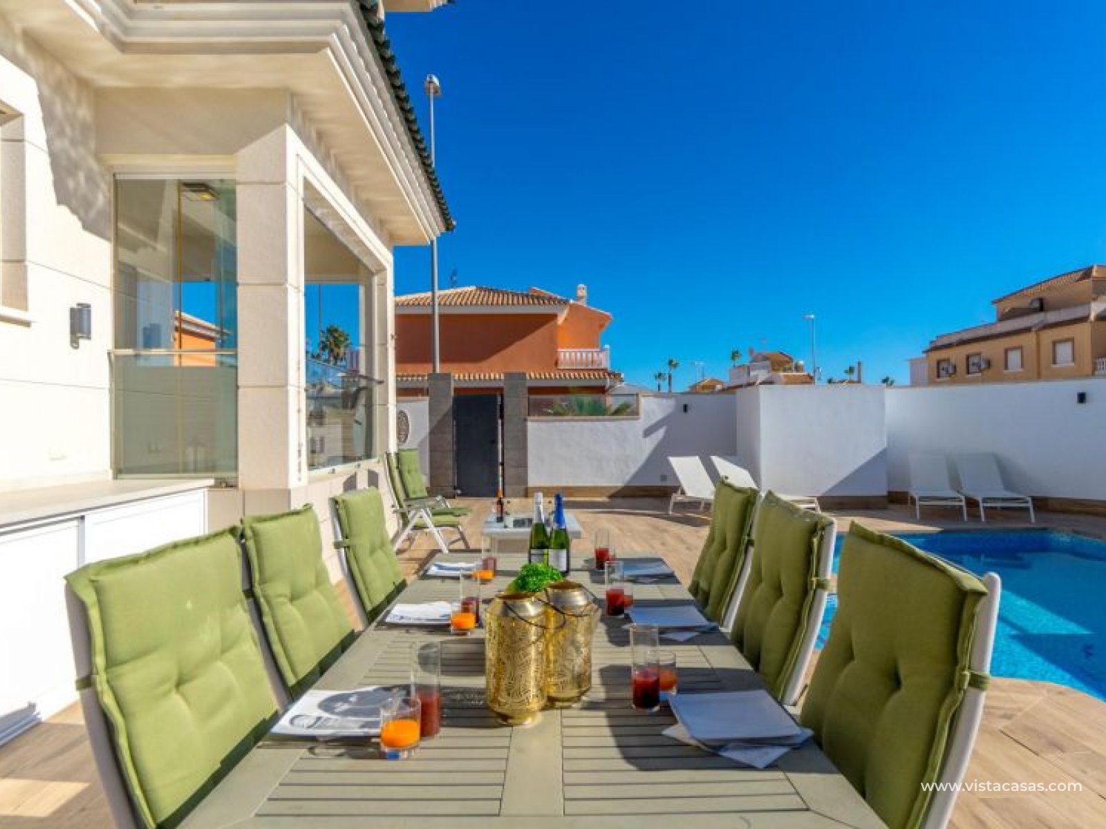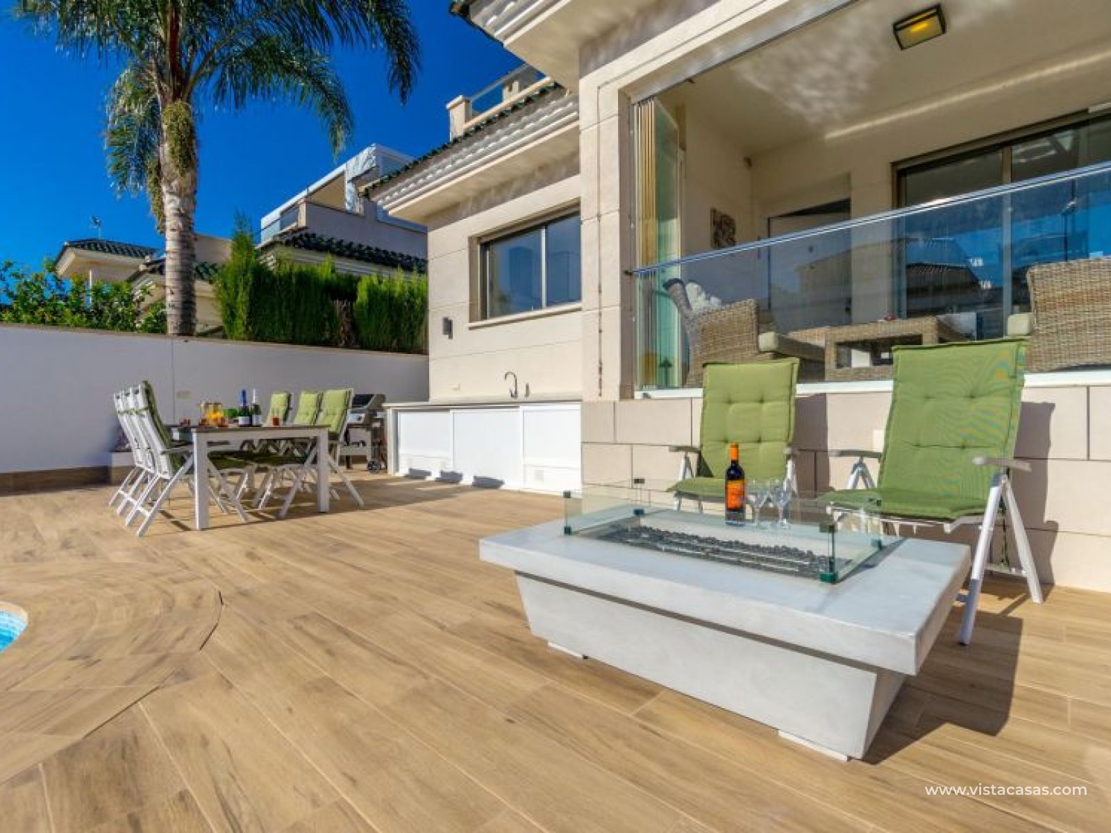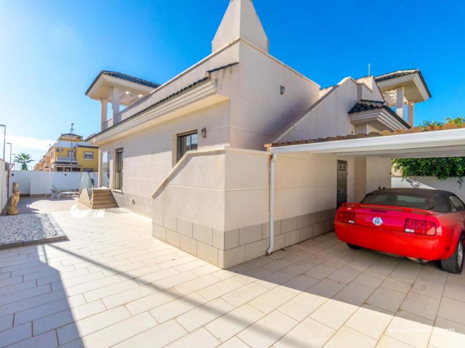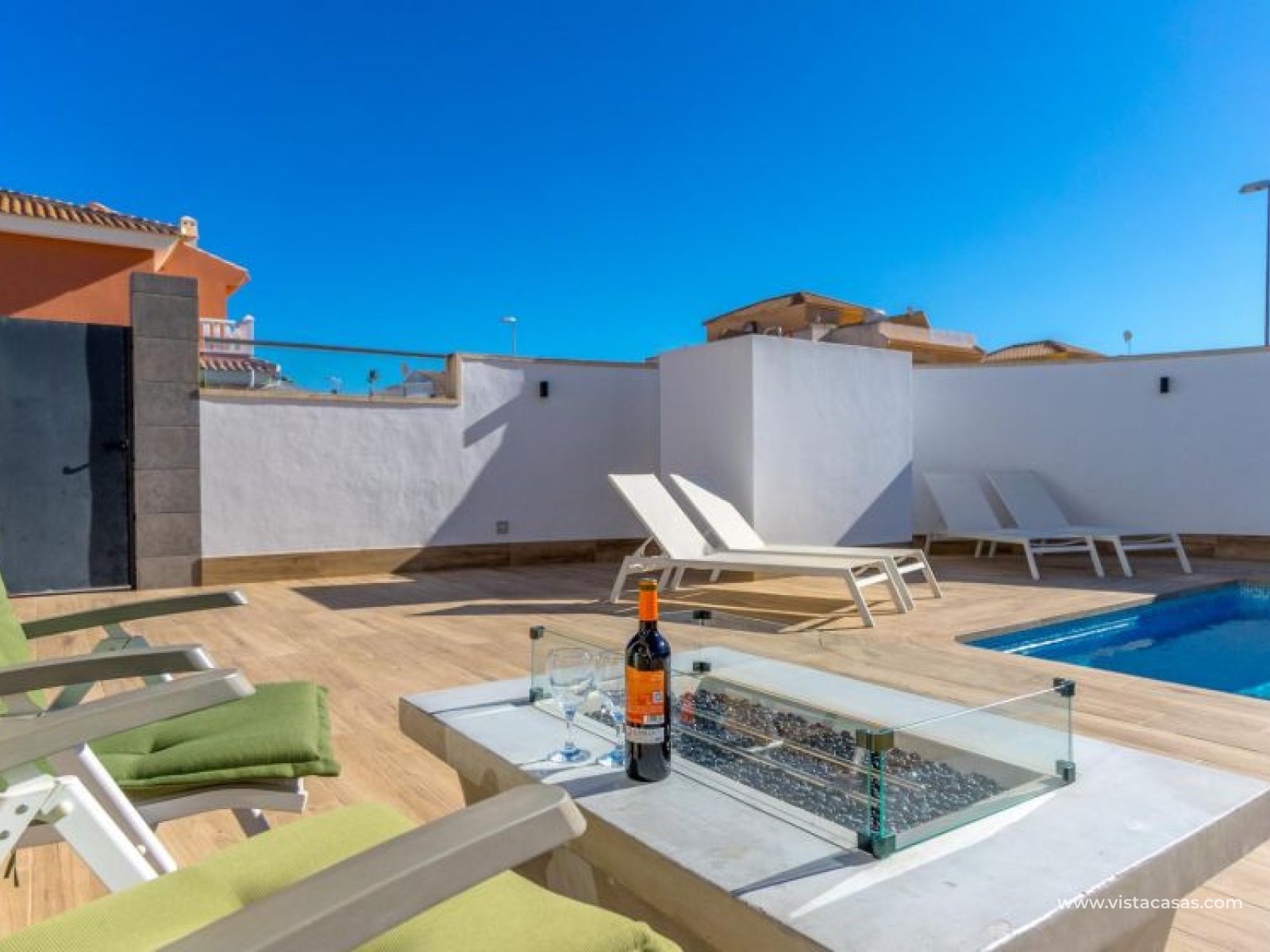 Discover this stunning detached villa in Ciudad Quesada- Lo Marabú — a home that perfectly blends Mediterranean charm with modern contemporary design. Set on a 420 m² plot with 104 m² of built area all on one level, this property offers a bright, comfortable lifestyle ideal for year-round living or holidays. Located in a privileged area surrounded by all amenities — supermarkets, pharmacy, restaurants, bars and more — this villa is perfect as a permanent residence or holiday home. Ciudad Quesada is known for its warm, international and vibrant atmosphere, offering an excellent quality of life. The property is located just steps away from La Marquesa Golf Course, an ideal setting for golf enthusiasts to enjoy relaxed rounds surrounded by nature. It is also only a short drive from the beautiful beaches of Guardamar and La Mata, known for their wide stretches of fine sand, clear waters, and a perfect atmosphere for relaxation or outdoor activities. The plot is fully tiled, offering various relaxing spaces. The summer kitchen is perfect for outdoor dining with family or friends, and the highlight of the exterior is its private swimming pool, a true delight during warm summer days. The property also features on-plot parking, a pergola, an automatic gate, and a storage room. From the garden, an external staircase leads to a spectacular 100 m² rooftop solarium, fully equipped with another summer kitchen and barbecue — an ideal setting for long evenings outdoors. Inside, a cozy glazed terrace with folding glass panels opens into a spacious living-dining area with a fully equipped open-plan kitchen. Everything is conveniently located on one floor: three bedrooms, including one with an en-suite bathroom, plus an additional guest bathroom. The property is sold fully furnished and in impeccable condition, ready to move into. Its south-facing orientation ensures natural light all day long. Just minutes from the beautiful beaches of Guardamar and close to the centre of Ciudad Quesada, this home offers space, elegance, modernity and comfort. Come and experience it for yourself — book your viewing today!