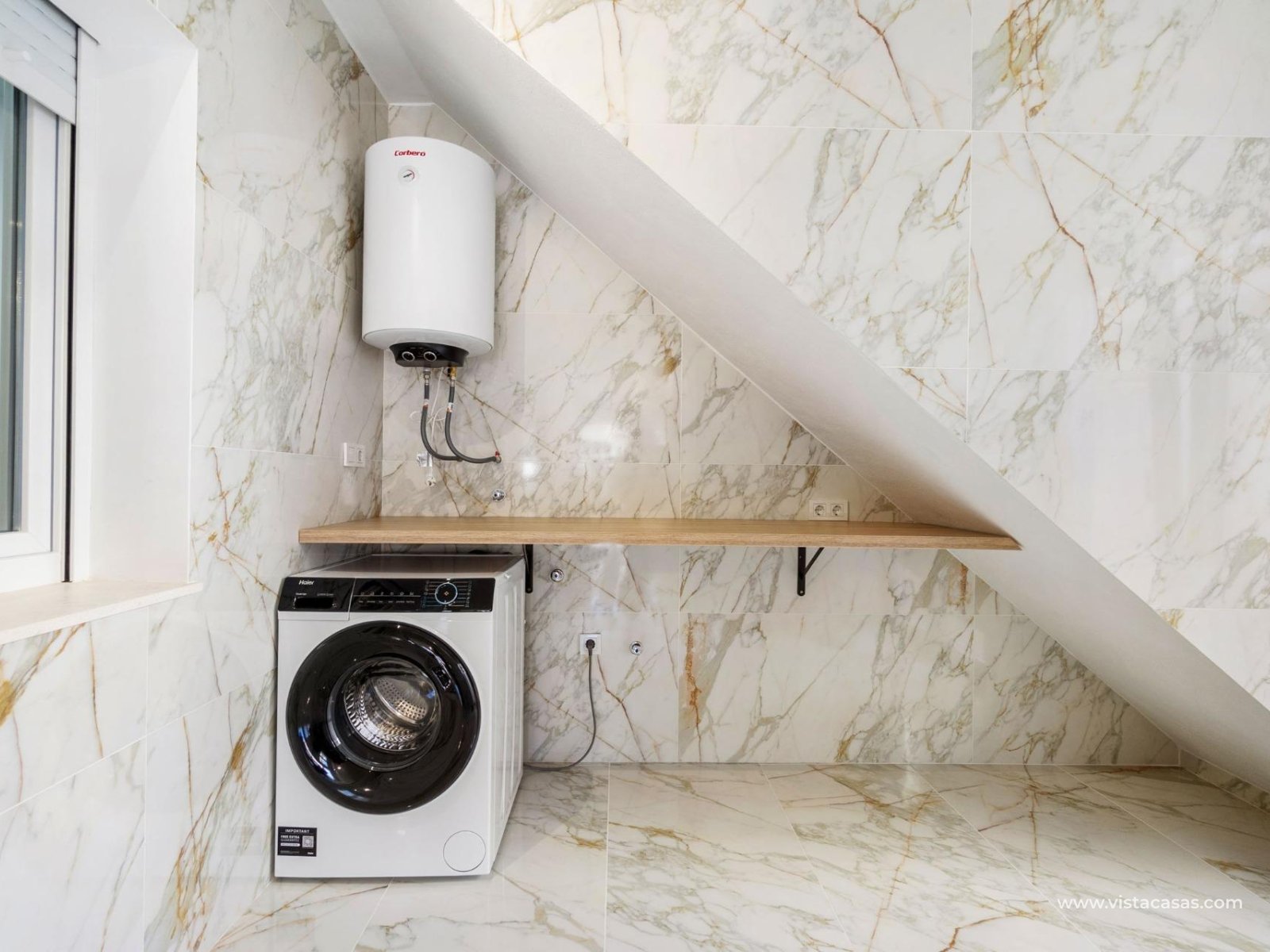 Newly renovated semi-detached villa in El Chaparra, located within a short drive of shops, bars, restaurants, supermarkets and the city of Torrevieja. It is separated into two houses with independent access. On the ground floor we have a house of 54m2 of area, consisting of 2 bedrooms, a bathroom, living-dining room, open-plan kitchen. On the first floor an apartment with its independent entrance, of about 35m2, consisting of 1 double bedroom, living room, has its own kitchen and bathroom; with a large terrace with views of the surroundings. The comprehensive reform was recently carried out with quality materials and modern interior design. Underfloor heating in the bathrooms. Sold with brand new furniture and appliances. Parking space for the car on the plot.This villa offers a harmonious combination of comfort and style.