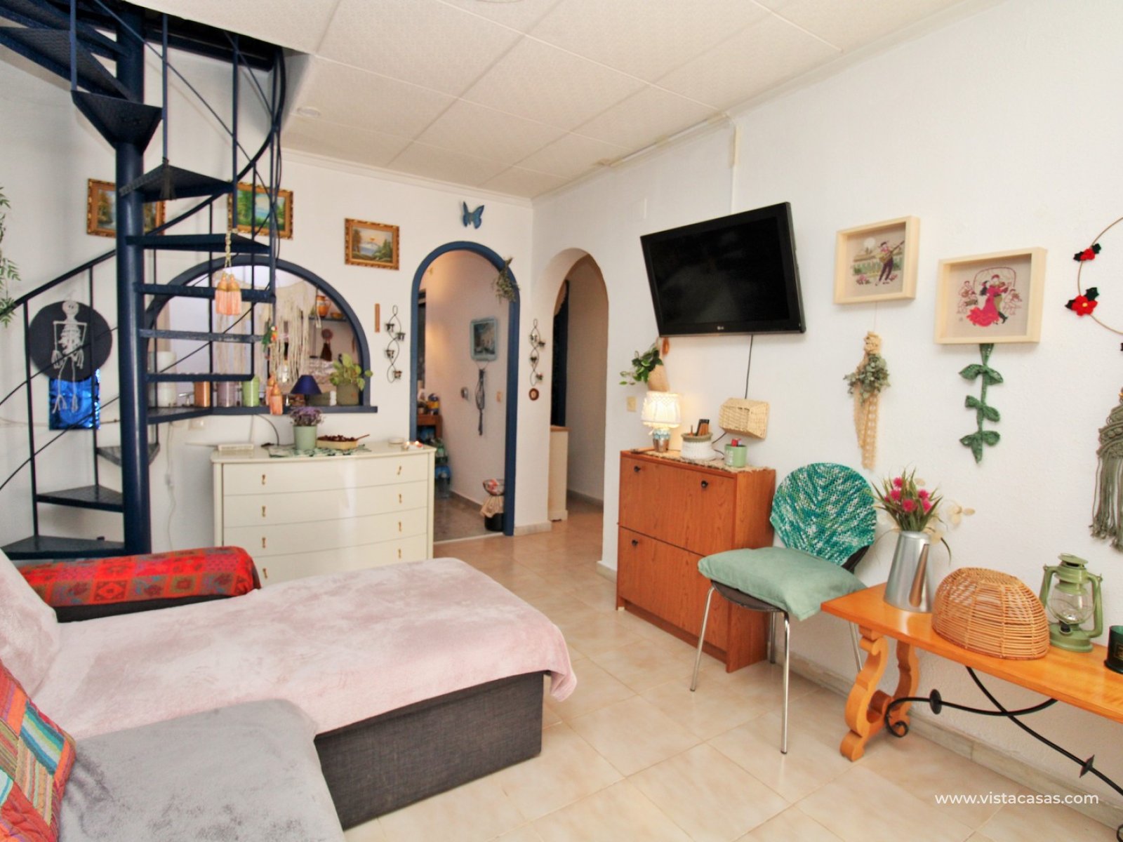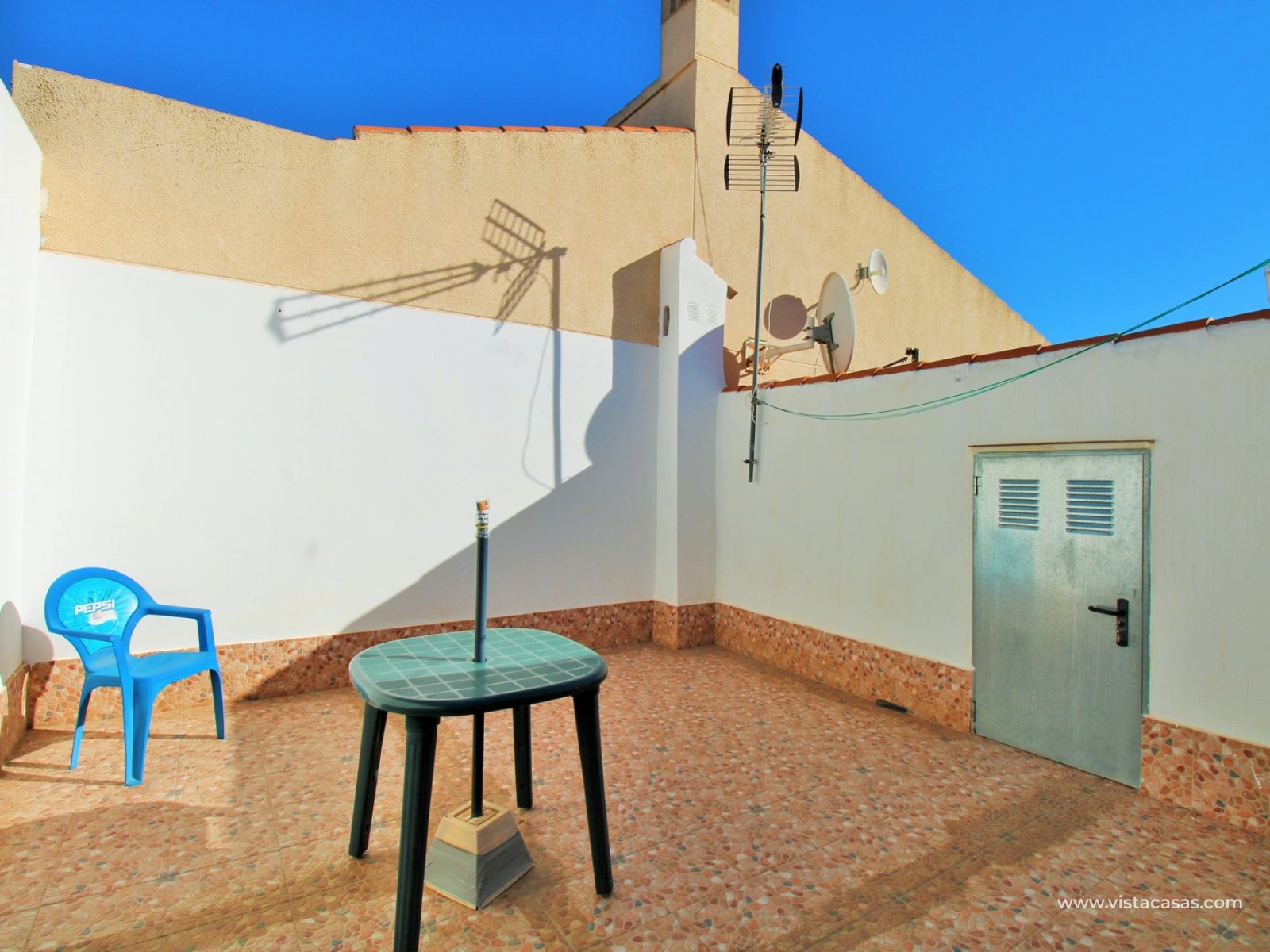 This South-East facing 2-bedroom bungalow is located in the popular La Siesta area of Torrevieja, set down a quiet communal alley that provides a peaceful and private setting. The property features a sunny front garden/terrace with an enclosed porch area — ideal for relaxing or outdoor dining.