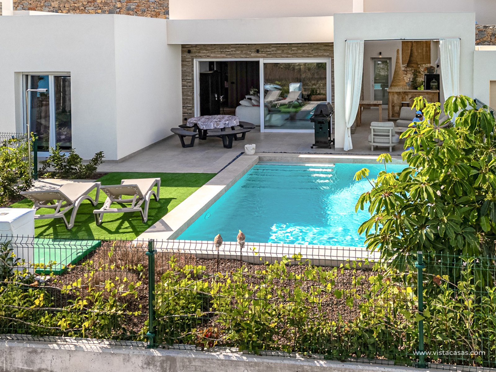 We are pleased to present this stunning luxury villa with panoramic views due to it´s elevated position at the 5 star La Finca Golf course. This impressive modern home is a perfect example of a resale of a new build without the wait and packed with luxury extras. The home offers a vast living/dining space, typically not seen in such homes, and offers the perfect area for leisure and entertainment, there is still ample space for a formal dining area or you can sit at the large island leading to the high end kitchen, which features floor to ceiling integrated cabinetry, ample work top space and top of the range white goods, plus leading out to a utility area and to the side patio terrace. The home offers 3 bedrooms, the master suite comprises a spacious double bedroom with patio doors to the garden and sun terrace, large walk in dressing room, with ample storage and floor to ceiling mirror, plus luxury shower room with his and hers sinks. The further 2 guest bedrooms both feature integrated wardrobes with ample storage space and share a further modern shower room. The whole home inside presents like a show room and has been made unique by the owners eye for detail and shows clearly their passion for interior design. Each piece and all decor has been lovingly chosen to integrate sympathetically with the wood and stone design, yet brings a touch of class to each room. The villa is set on a low maintenance plot of over 400m2 with sun terrace to the front offering some shade from the Spanish sun and is the perfect space for al fresco dining, likewise a sunny corner along with an summer kitchen/bar area offers the ideal spot for entertaining. The villa of course offers private swimming pool to cool off in the height of summer and the remainder of the plot is low maintenance with high quality tiles, gravel and artificial grass, a easy to access driveway offers secure gated parking, although there is ample quiet street parking outside the villa. Boasting stunning unobstructed mountain and country side views due to it´s elevated position this home offers everything a discerning buyer could wish for. This stunning villa will be sold part furnished although inventory can be discussed dependent on offers and is sold with many extras including integrated white goods, air conditioning, remote controlled blinds and gates, plus much more. Located a mere 200m to the La Finca Golf hotel Spa and club house , ideal for golf lovers for those extended holidays or ideal for permanent living as under 3km to both the traditional village of Algorfa which offers Spanish charm,local restaurants, bars, local shops and the traditional village square and the commercial area at La Finca also noted for some quality restaurants, cocktail bars and much more. Around 17km to the beaches of Guardmar del Segura , La Mata and Torrevieja, meaning you are never far from the coast. This home must be seen to be appreciated and is even more stunning in real life. Contact us today for your viewing