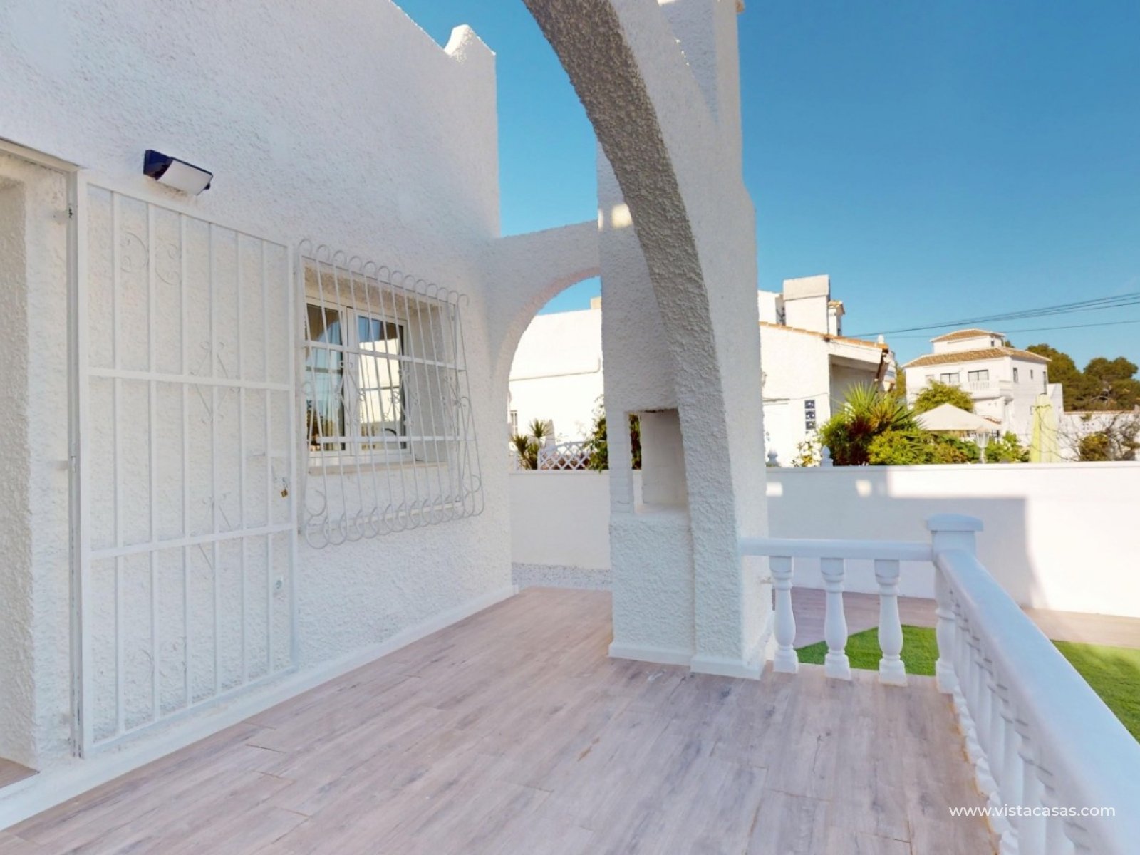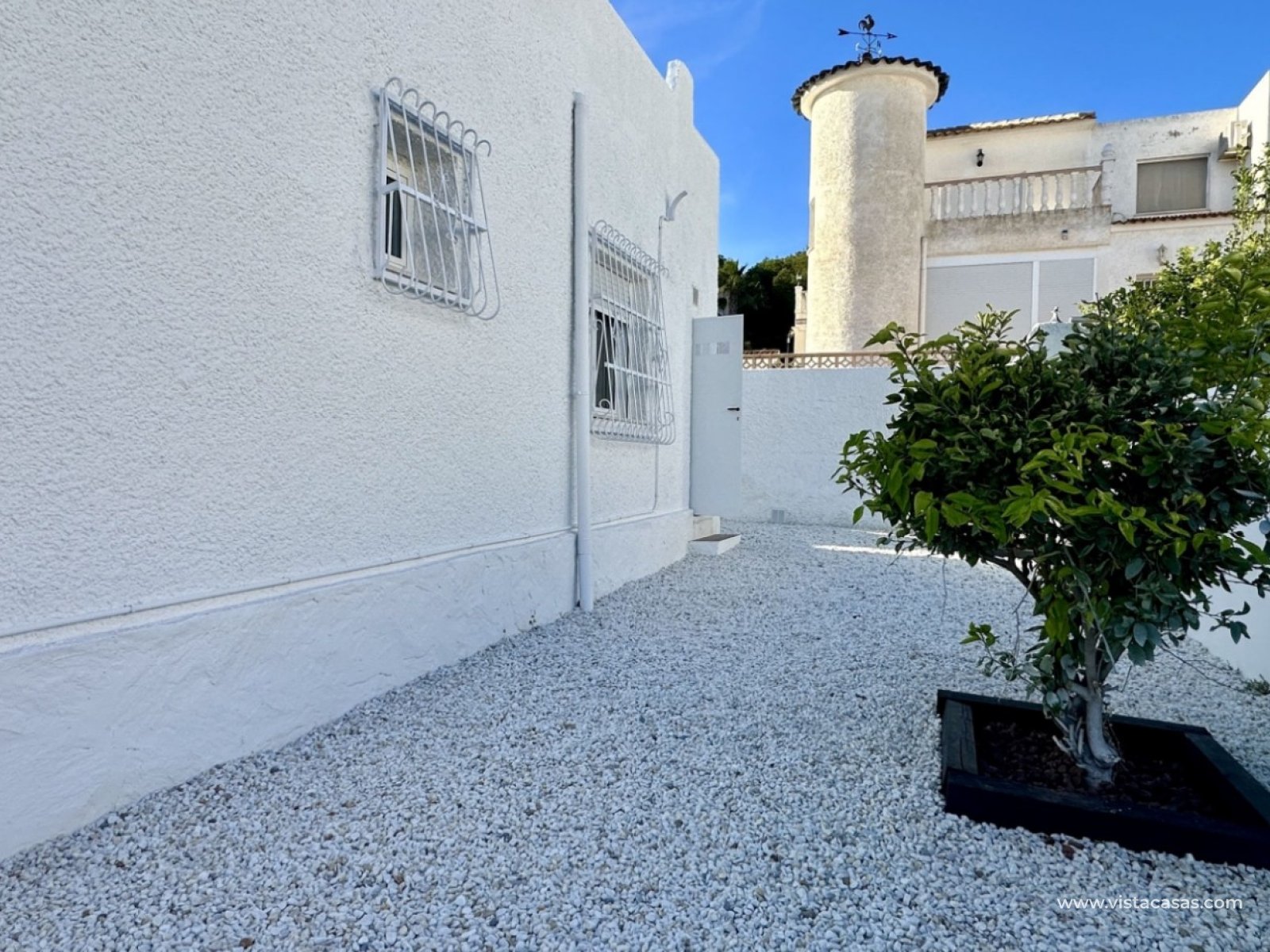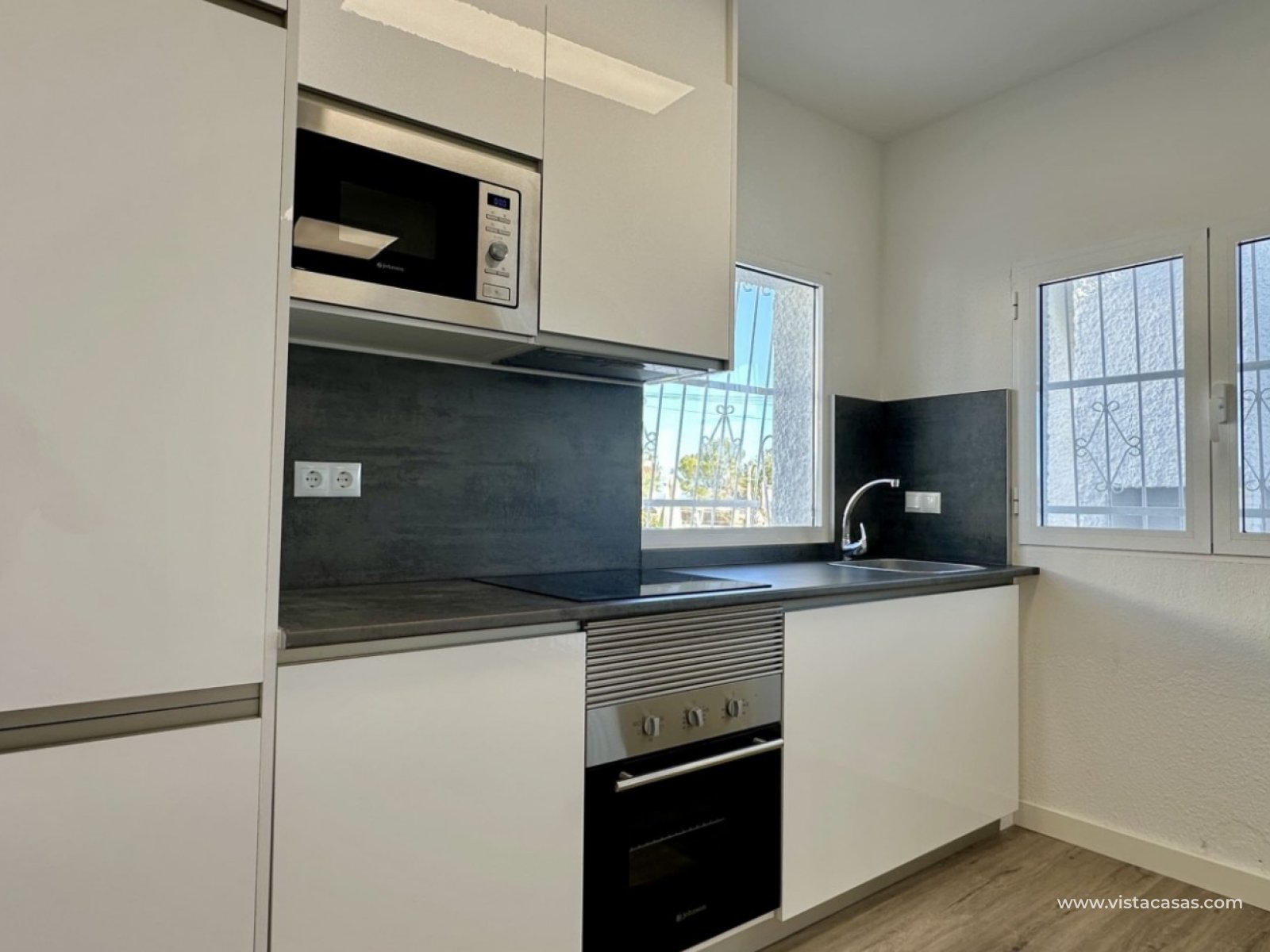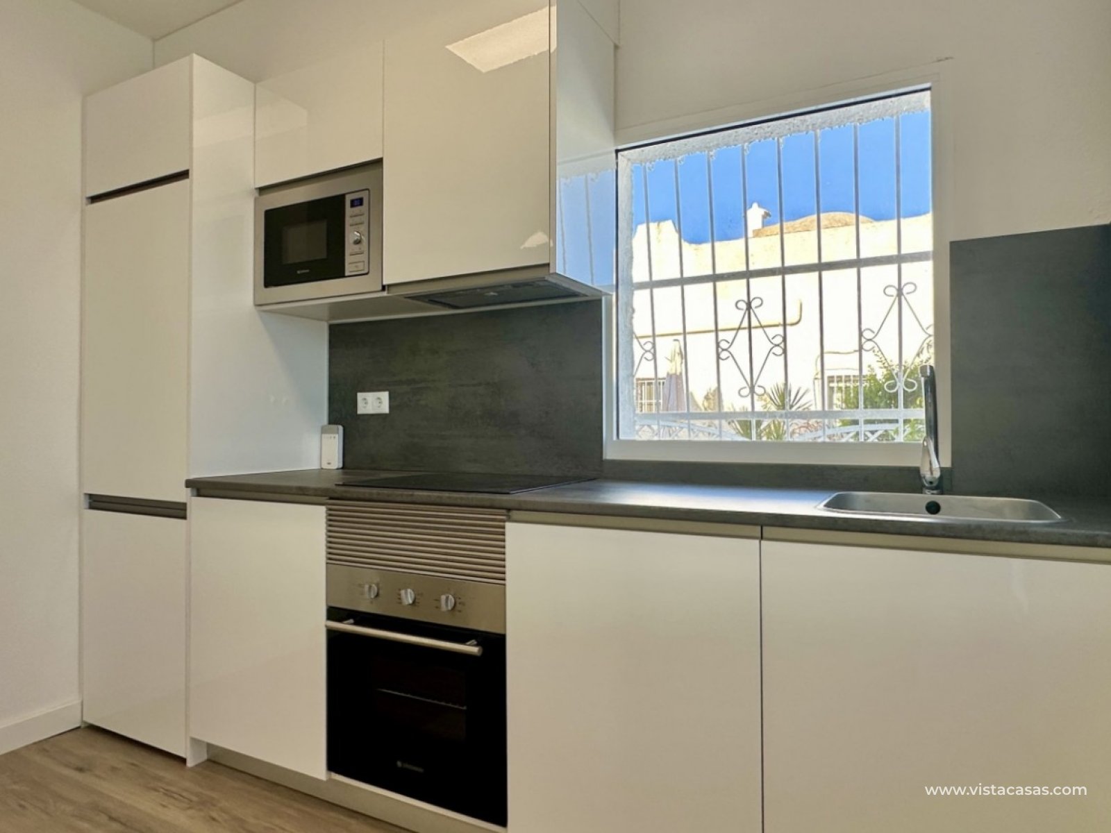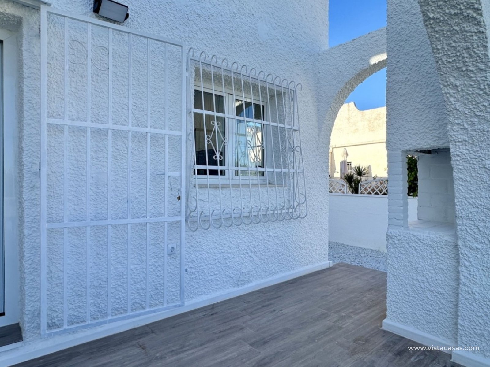 A beautifully renovated, brand-new bungalow now available on the market. Located on a 202 m² plot with 147 m² of private garden, this home offers modern finishes, spacious outdoor areas, and a sunny 48 m² solarium perfect for year-round living. Key Features Home size: 58 m² + 48 m² solariumPlot: 202 m²Storage room includedOption to add a private poolIBI: €144 / yearCommunity fees: approx. €199 / year Renovation Highlights Brand-new wood-effect laminate flooring2 bedrooms1 modern bathroom with walk-in shower and screenFully equipped kitchen with washing machine and dishwasherSolarium with artificial grass and side enclosure Prime Location – Blue Lagoon (Calle Jumilla) 4-minute walk to El Limonar SchoolClose to two golf coursesNear Villamartín Shopping Centre5-minute walk to Marimba Blue Pool & Lounge Bar4-minute walk to Greenlands Blue Lagoon