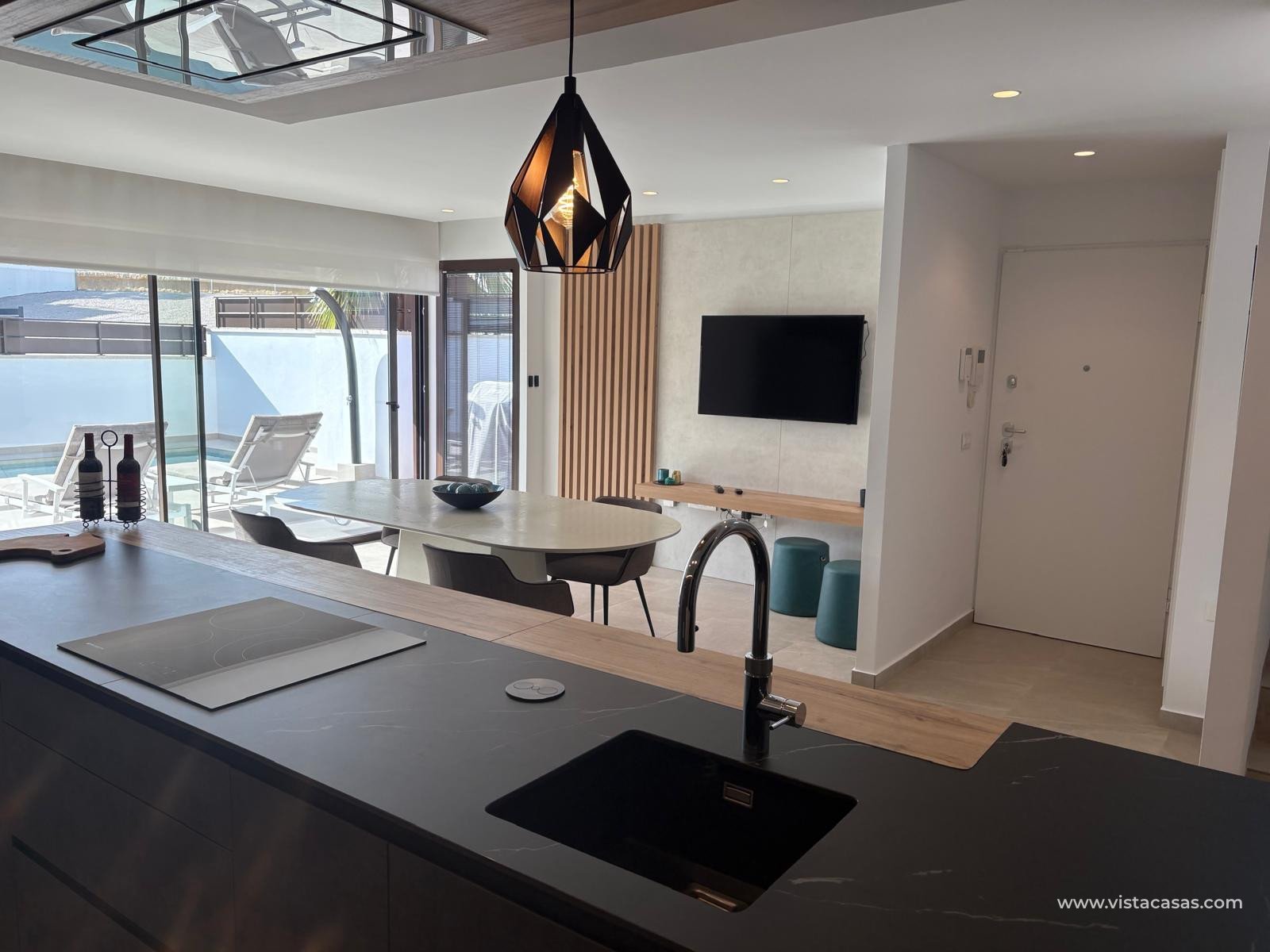 This beautiful villa is now available. Located on the prestigious La Finca Golf resort and walking to fantastic amenities. The villa has an internal space that flows effortlessly, and is flooded with light due to its sunny south facing orientation. The lounge overlooks the pool and low maintenance garden.. the luxury, designer kitchen is very impressive with built in appliances included. There are 3 double bedrooms and 2 bathrooms in the main accomodation and the added bonus of a very large underbuild space accessed via steps down from the lounge. This space could be used as a guest accomodation and has a kitchenette and bathroom. The various terraces and roof garden are perfect for entertaining, dining or relaxing. This property is immaculately presented and would make an ideal full time residence or holiday home. Contact us today to arrange a viewing!