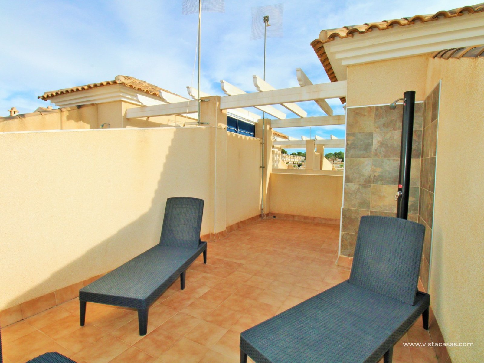 The roof solarium offers a generous outdoor space with sun throughout the day and includes a shower area, making it perfect for relaxing and enjoying the Mediterranean climate.