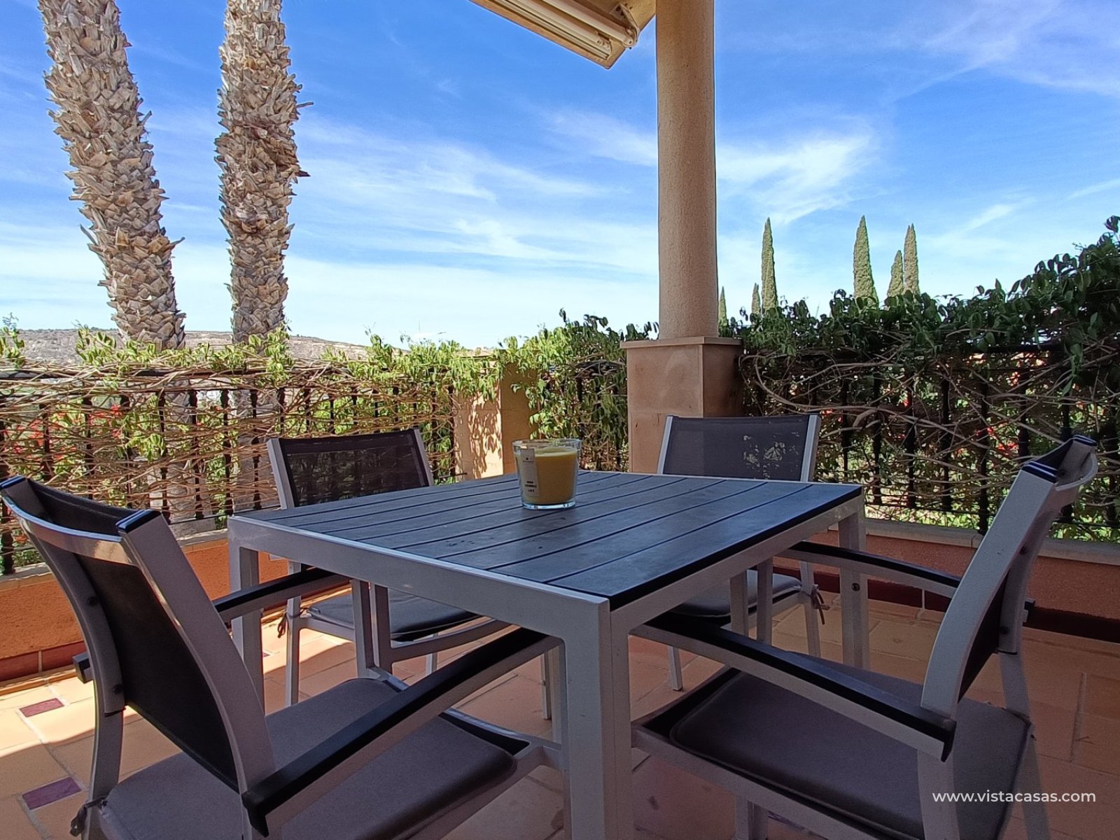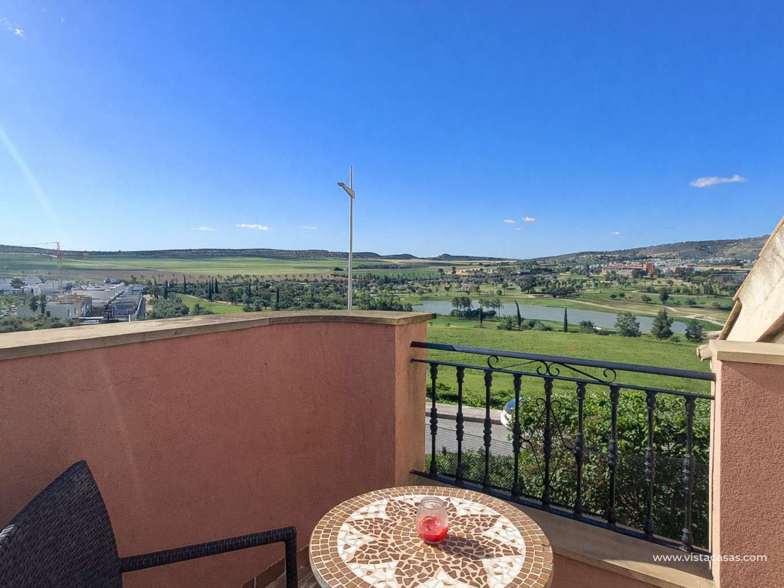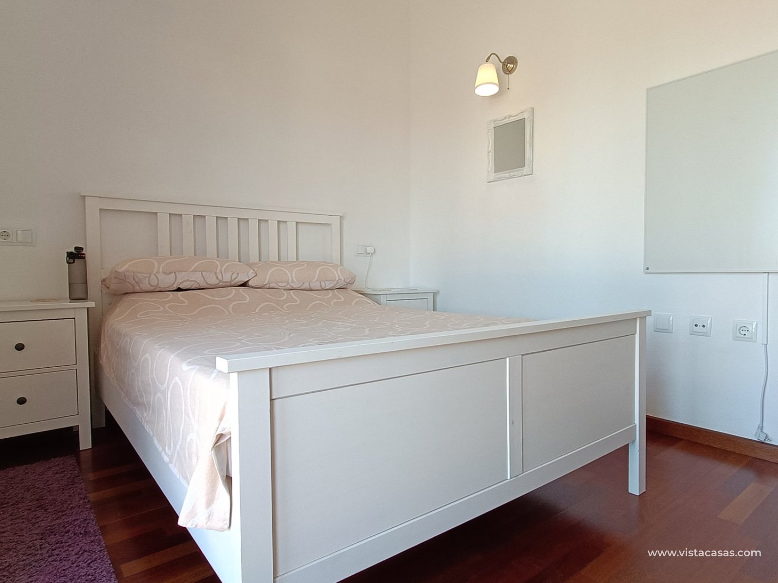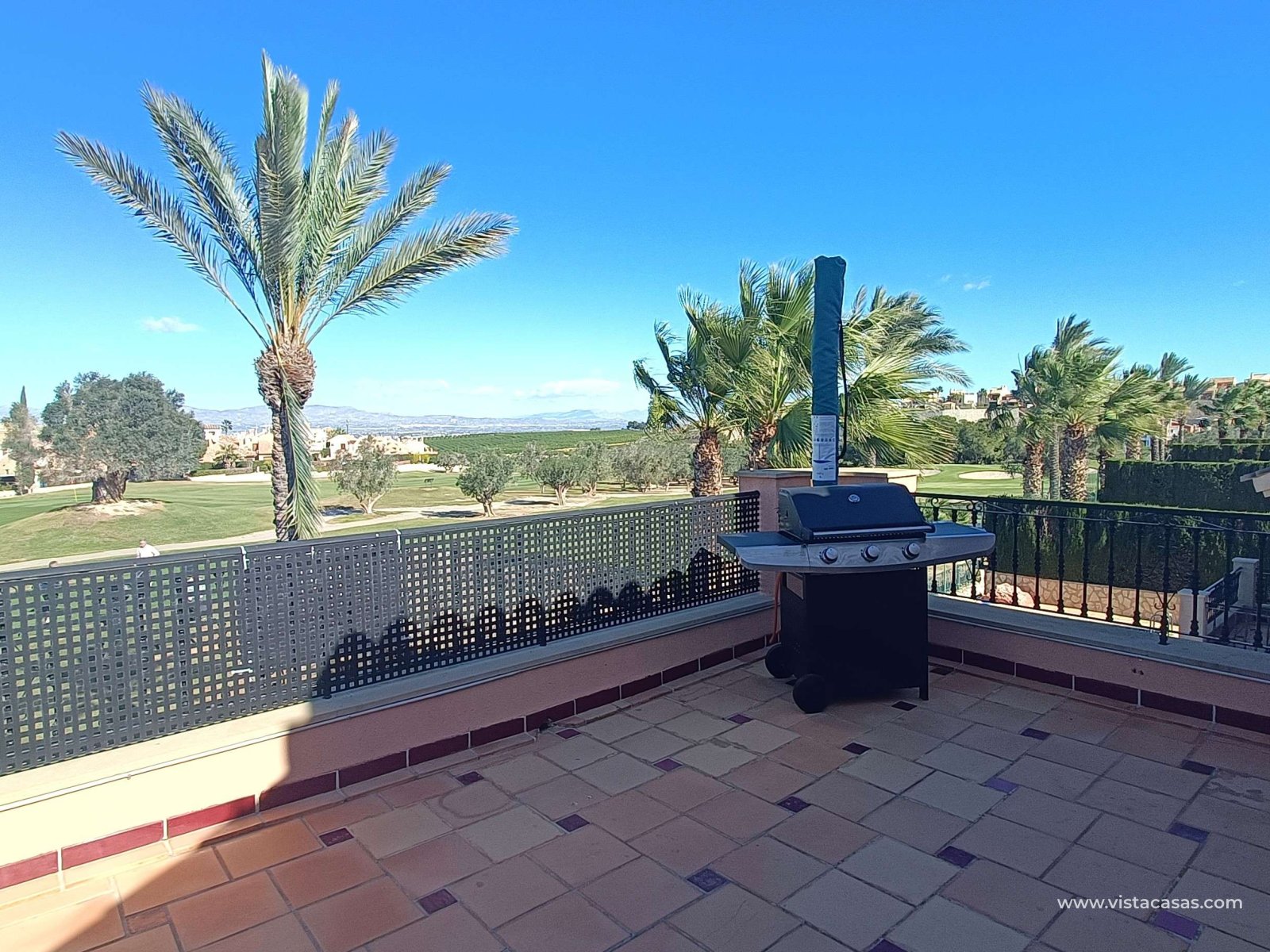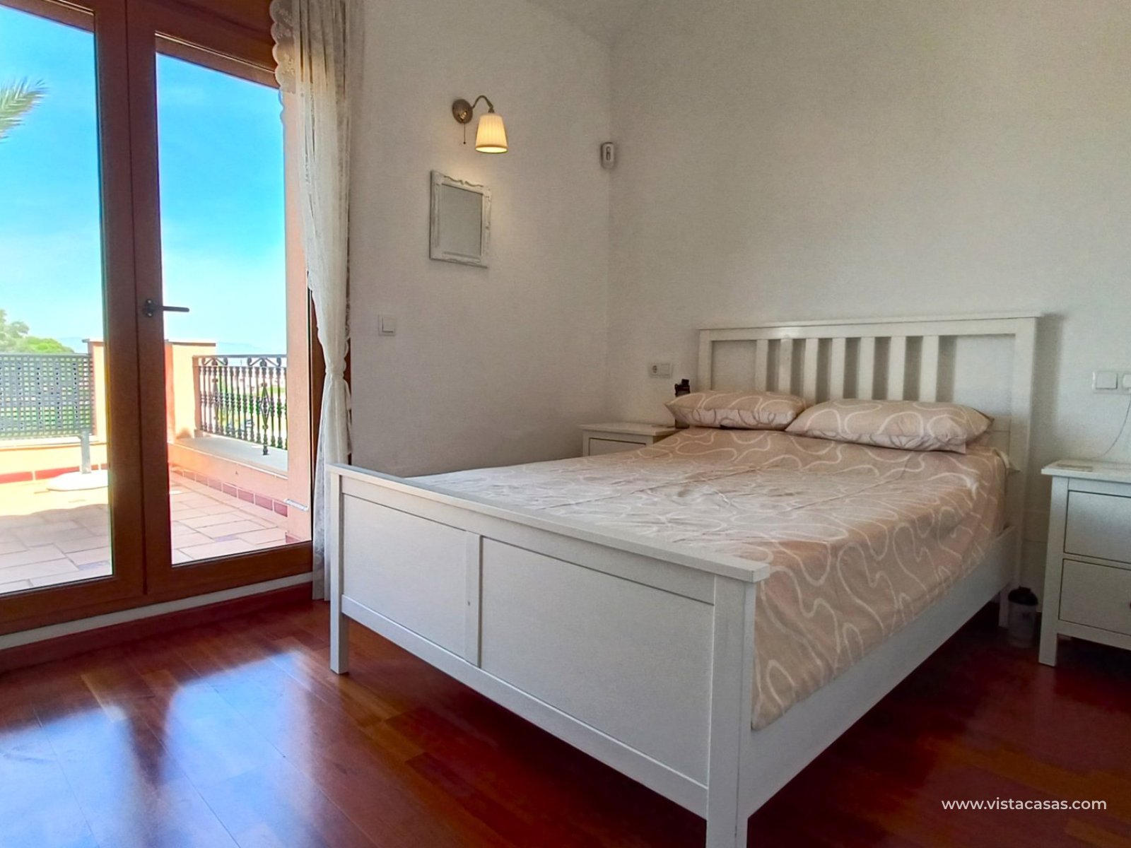 As you move back inside the villa and walk towards the lounge there is an archway that provides access to the first guest bedroom to your left, which has a double bed and fitted wardrobes, next to this is a storeroom, which is ideal for your suitcases or golf clubs. This is followed by a family bathroom and finally on this level you have the second guest bedroom which has a double bed and fitted wardrobes. There is a stairway that takes you up to the first-floor landing, to your left you have a storeroom, this is then followed by a shower room. Then you have the master bedroom which a double bed and doors out to a solarium. This is where this property comes into its own as there are views across the golf course down to the valley beyond which are different to the lower terrace views.