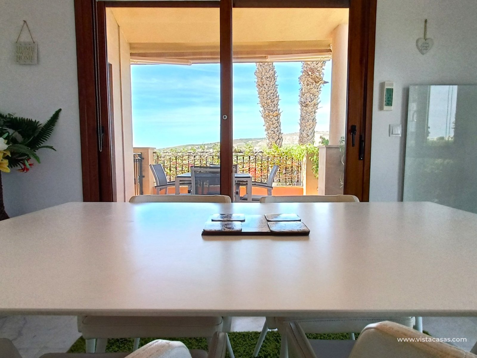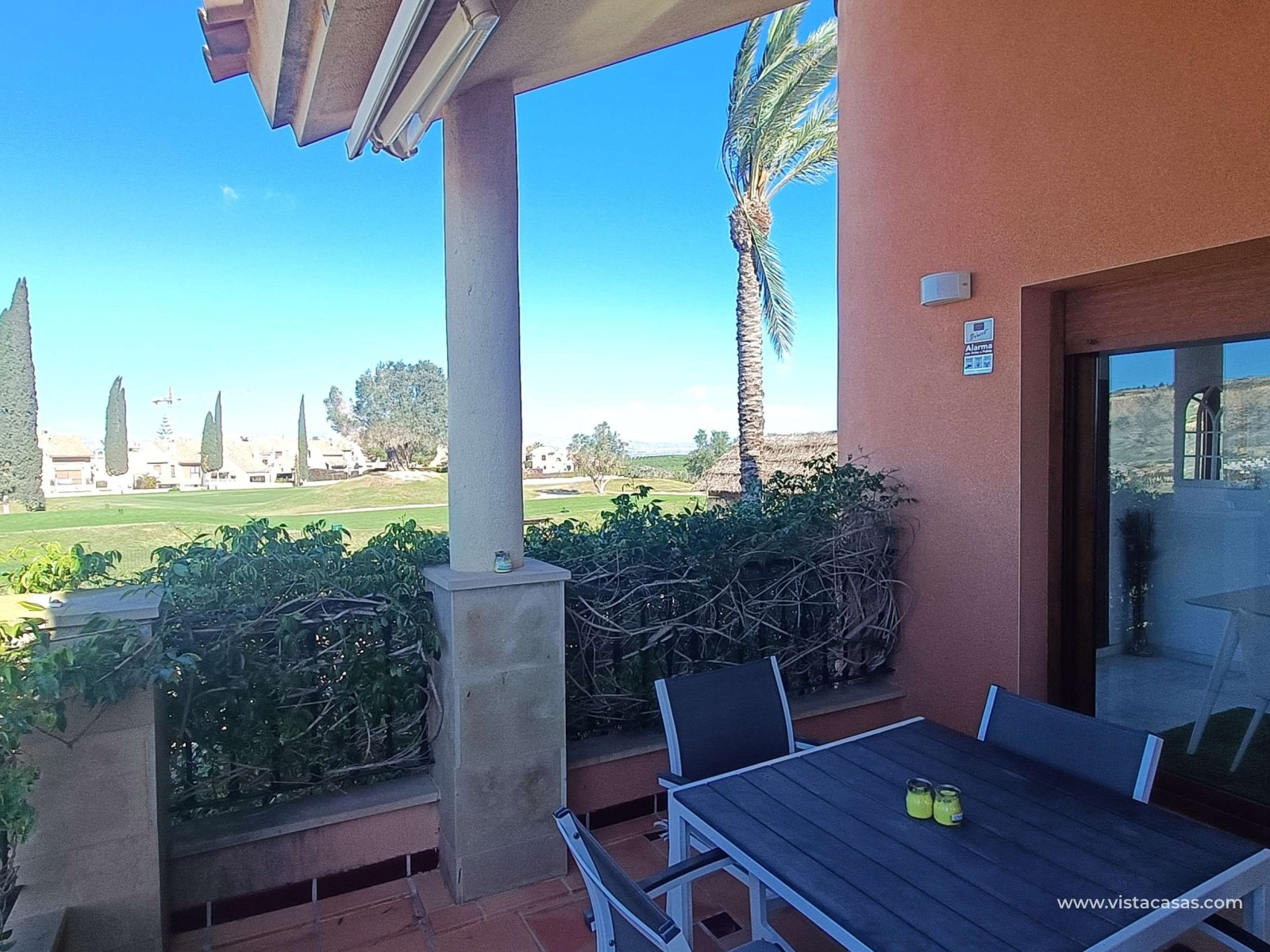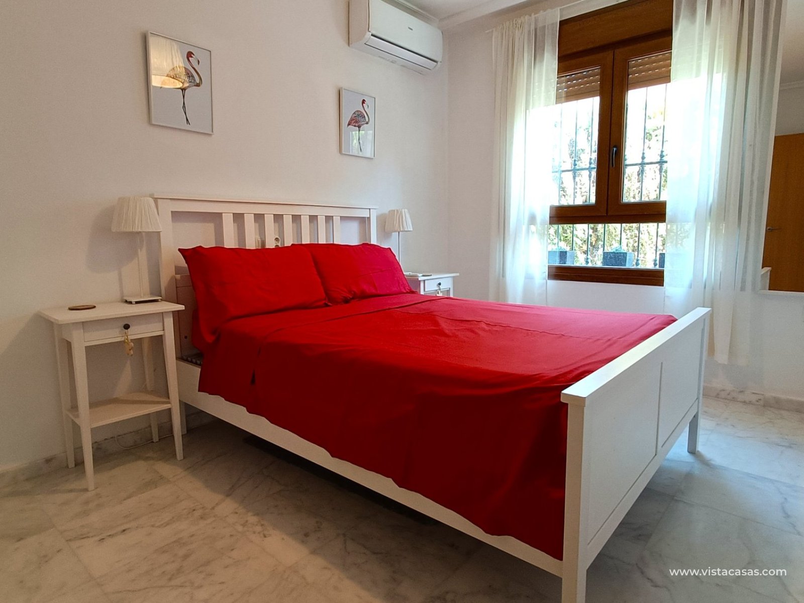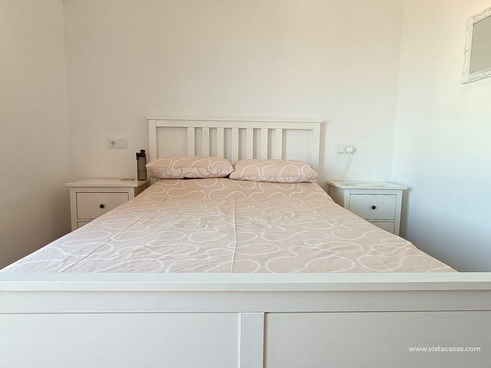 As you move back inside the villa and walk towards the lounge there is an archway that provides access to the first guest bedroom to your left, which has a double bed and fitted wardrobes, next to this is a storeroom, which is ideal for your suitcases or golf clubs. This is followed by a family bathroom and finally on this level you have the second guest bedroom which has a double bed and fitted wardrobes. There is a stairway that takes you up to the first-floor landing, to your left you have a storeroom, this is then followed by a shower room. Then you have the master bedroom which a double bed and doors out to a solarium. This is where this property comes into its own as there are views across the golf course down to the valley beyond which are different to the lower terrace views.