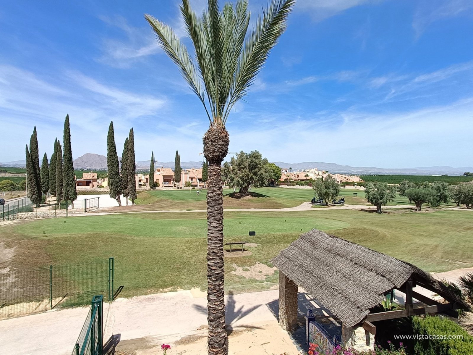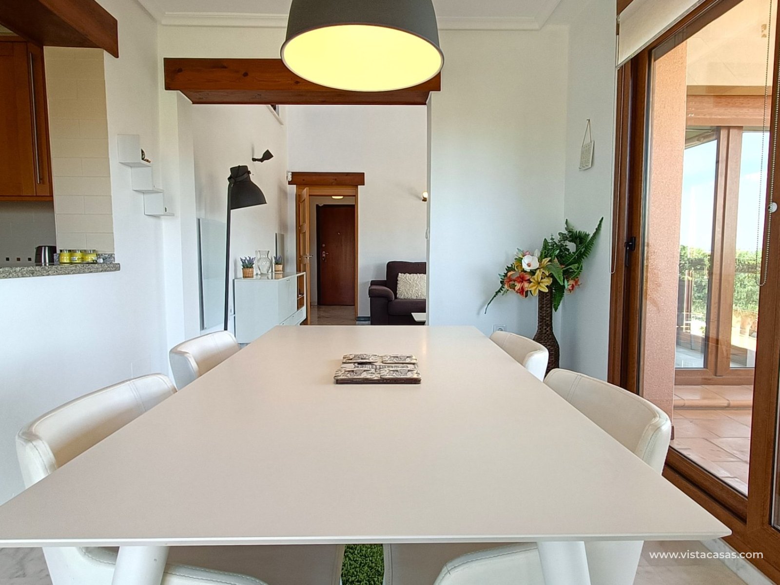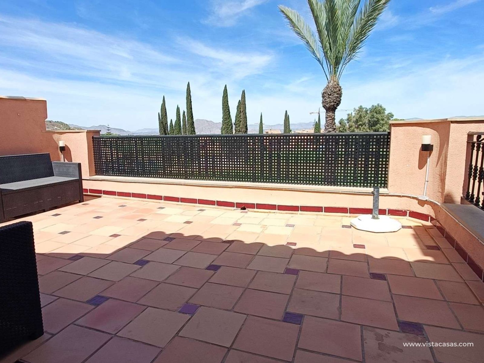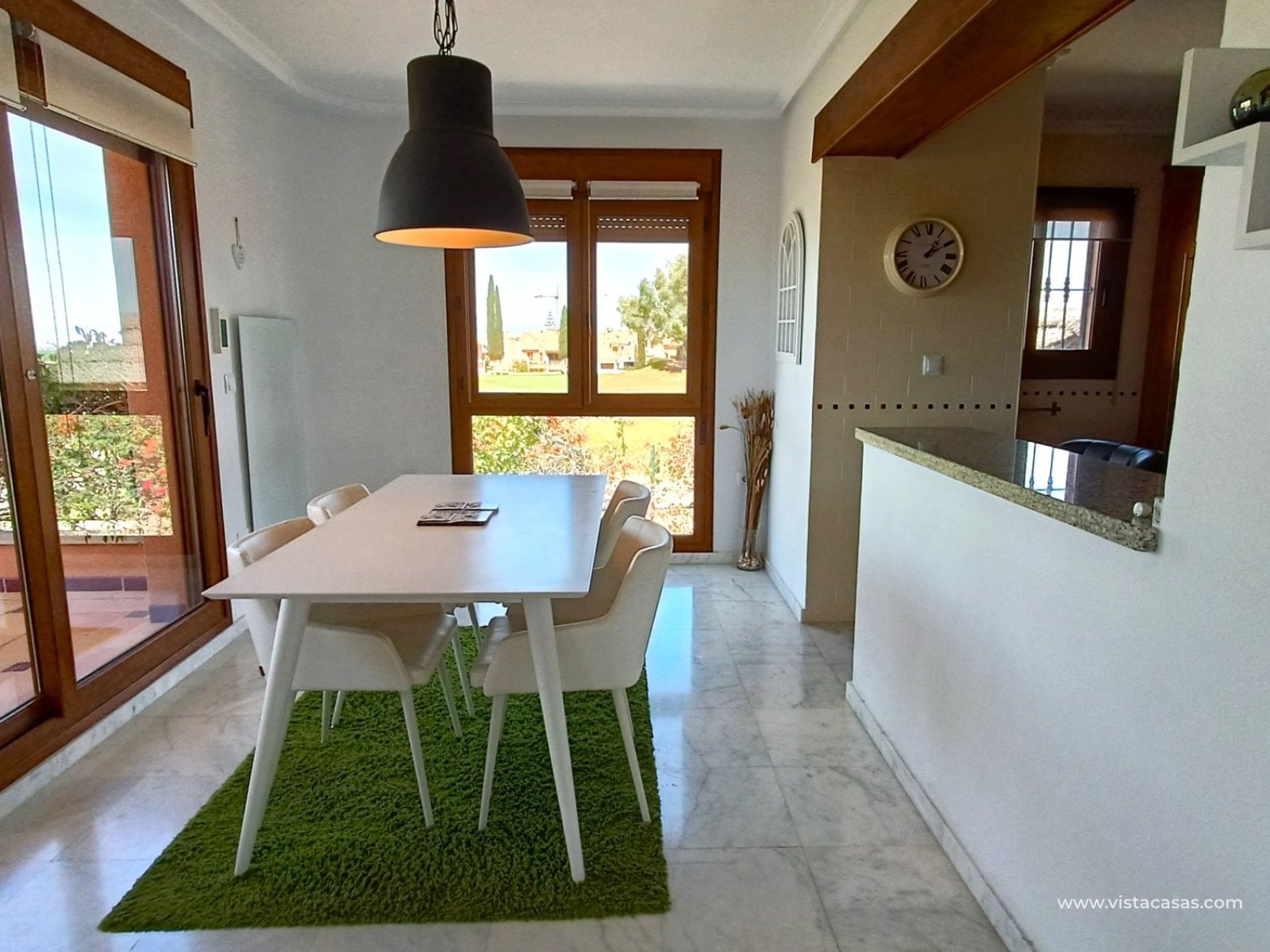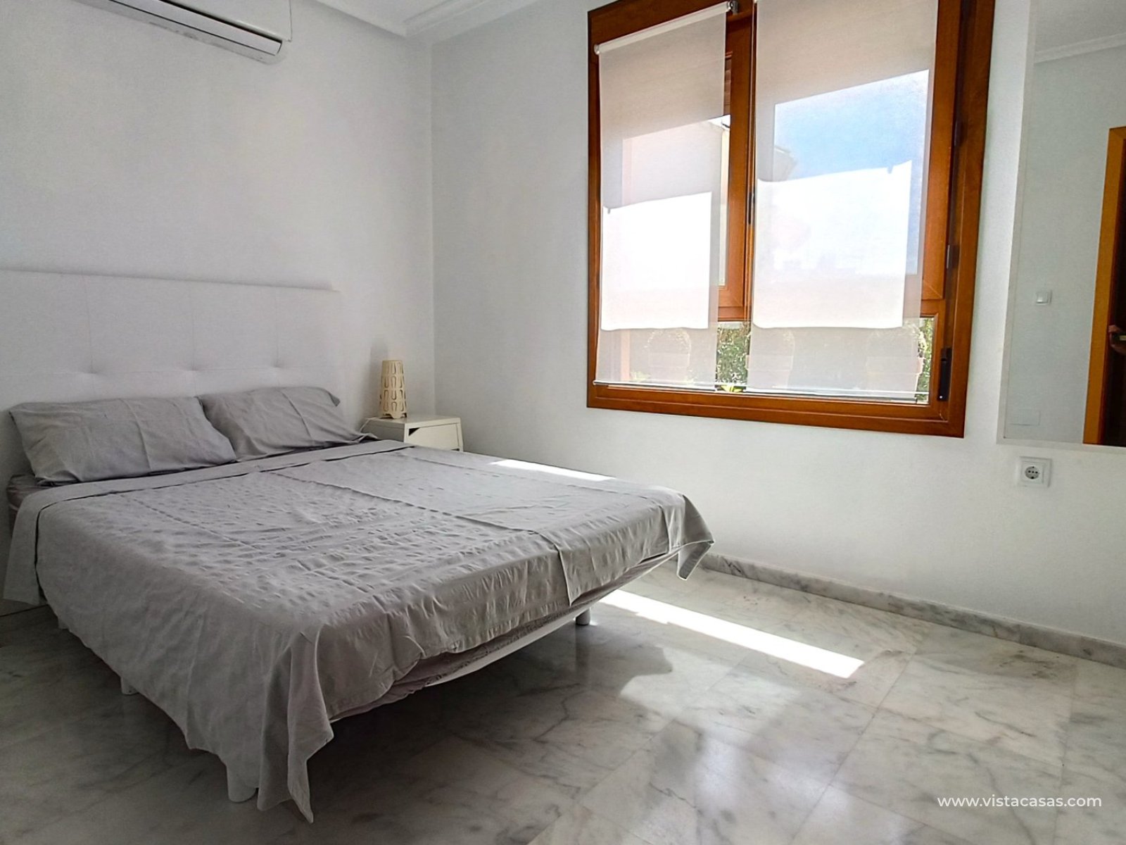 As you move back inside the villa and walk towards the lounge there is an archway that provides access to the first guest bedroom to your left, which has a double bed and fitted wardrobes, next to this is a storeroom, which is ideal for your suitcases or golf clubs. This is followed by a family bathroom and finally on this level you have the second guest bedroom which has a double bed and fitted wardrobes. There is a stairway that takes you up to the first-floor landing, to your left you have a storeroom, this is then followed by a shower room. Then you have the master bedroom which a double bed and doors out to a solarium. This is where this property comes into its own as there are views across the golf course down to the valley beyond which are different to the lower terrace views.