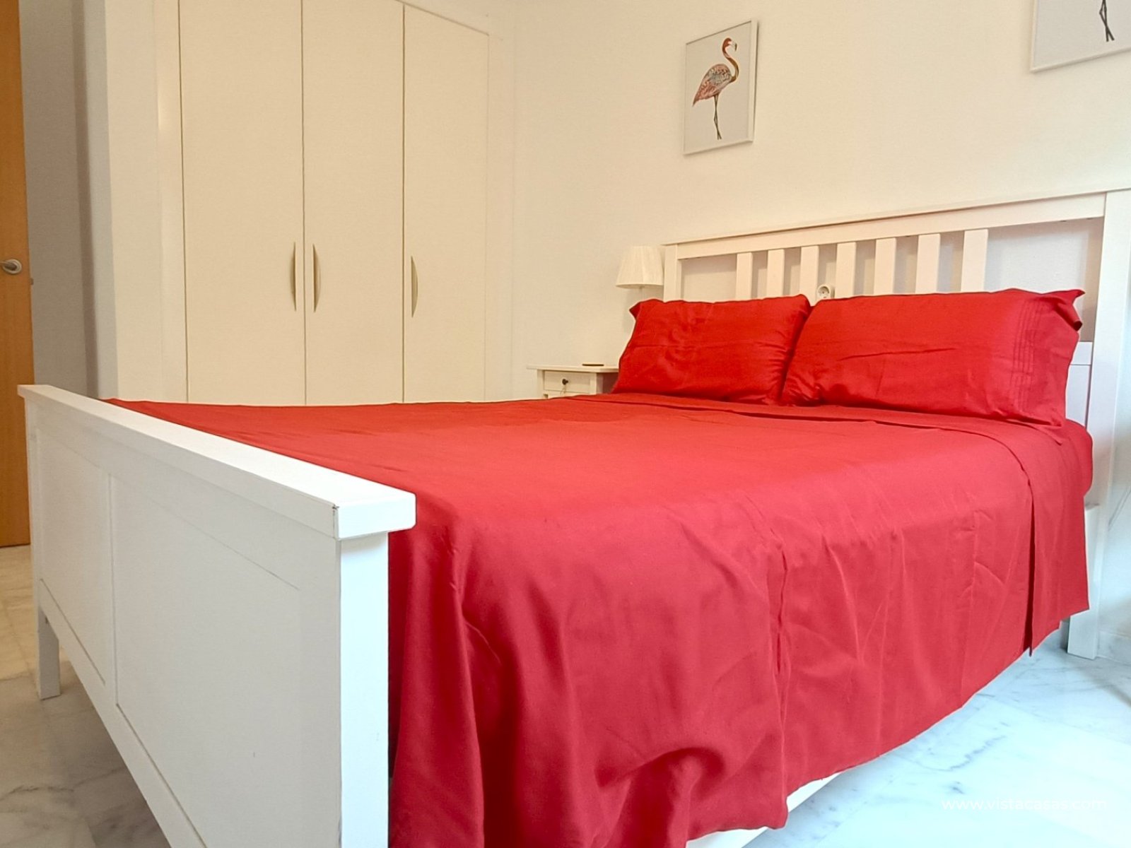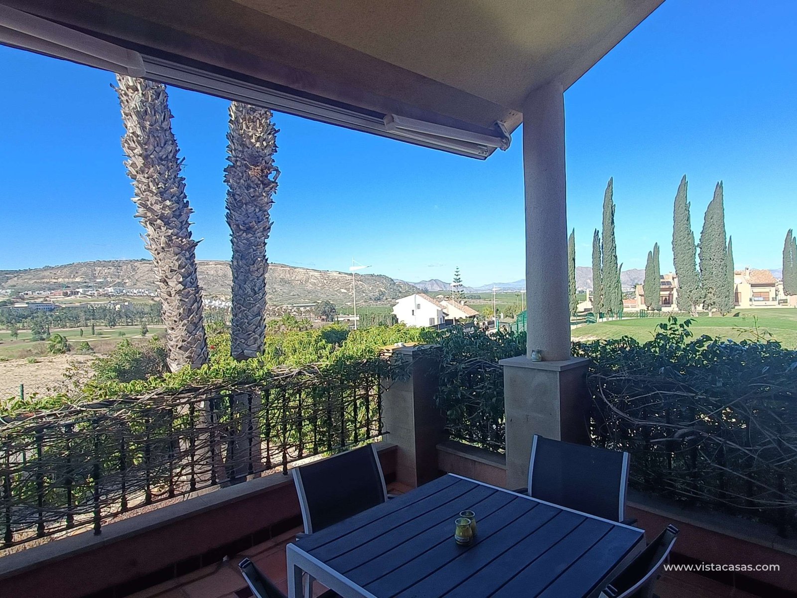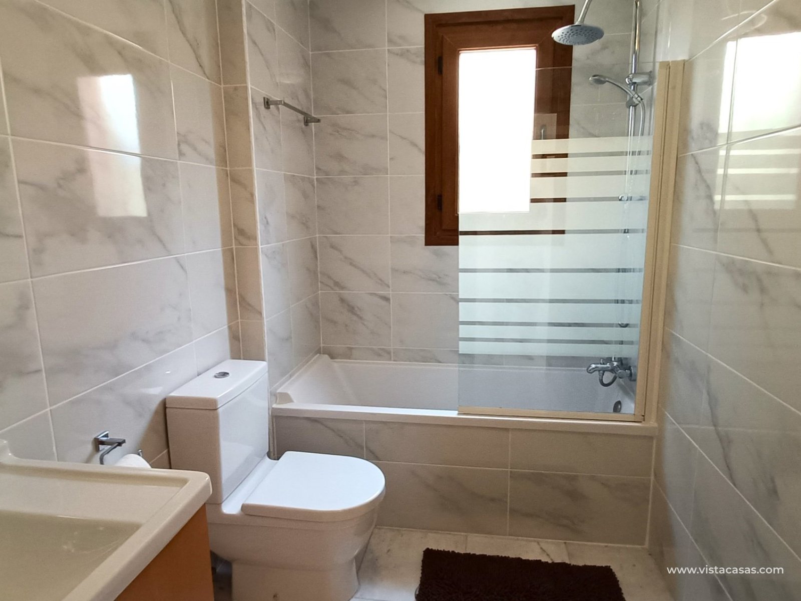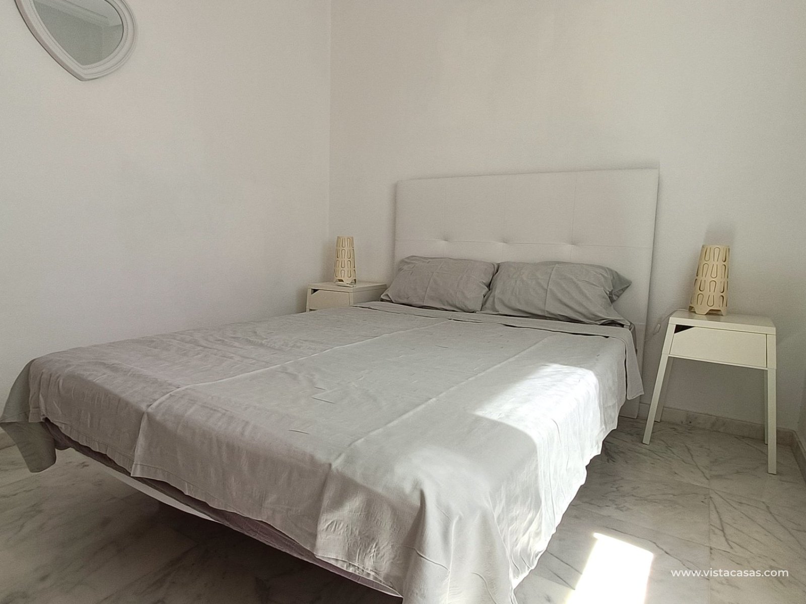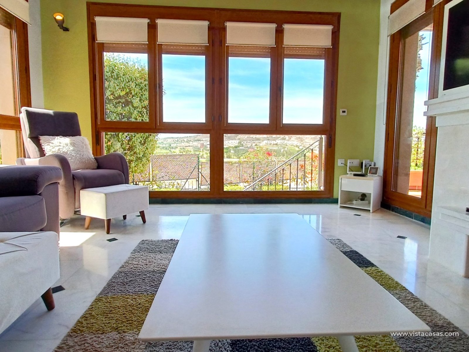 As you move back inside the villa and walk towards the lounge there is an archway that provides access to the first guest bedroom to your left, which has a double bed and fitted wardrobes, next to this is a storeroom, which is ideal for your suitcases or golf clubs. This is followed by a family bathroom and finally on this level you have the second guest bedroom which has a double bed and fitted wardrobes. There is a stairway that takes you up to the first-floor landing, to your left you have a storeroom, this is then followed by a shower room. Then you have the master bedroom which a double bed and doors out to a solarium. This is where this property comes into its own as there are views across the golf course down to the valley beyond which are different to the lower terrace views.