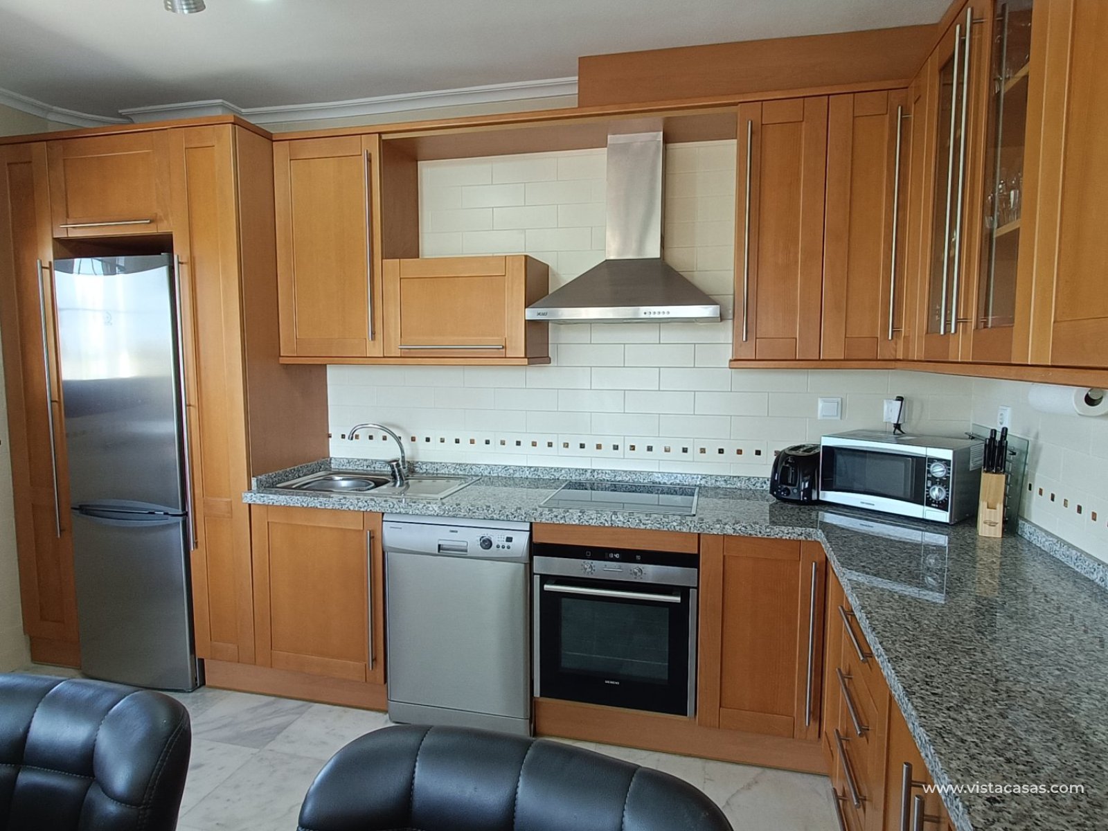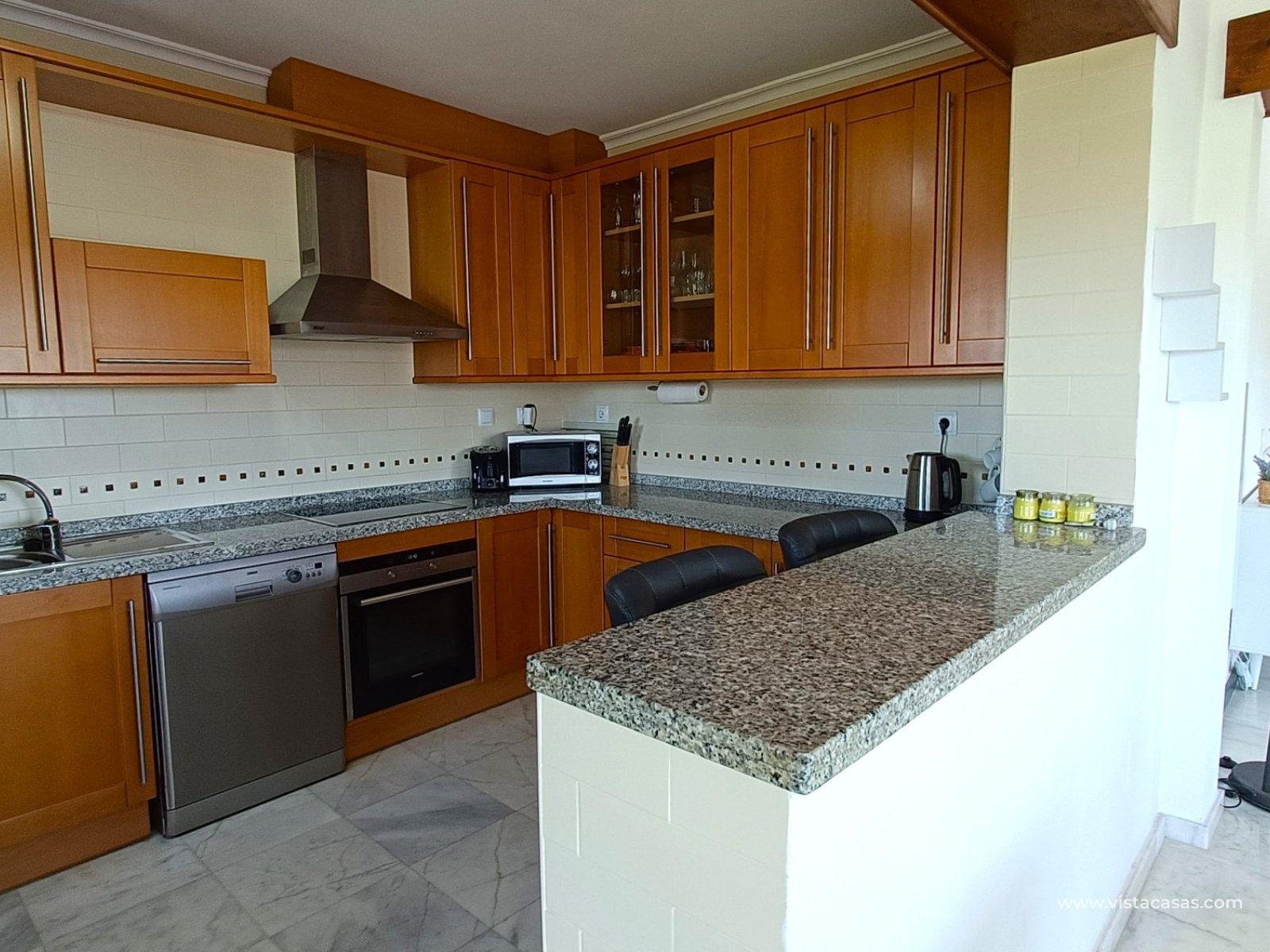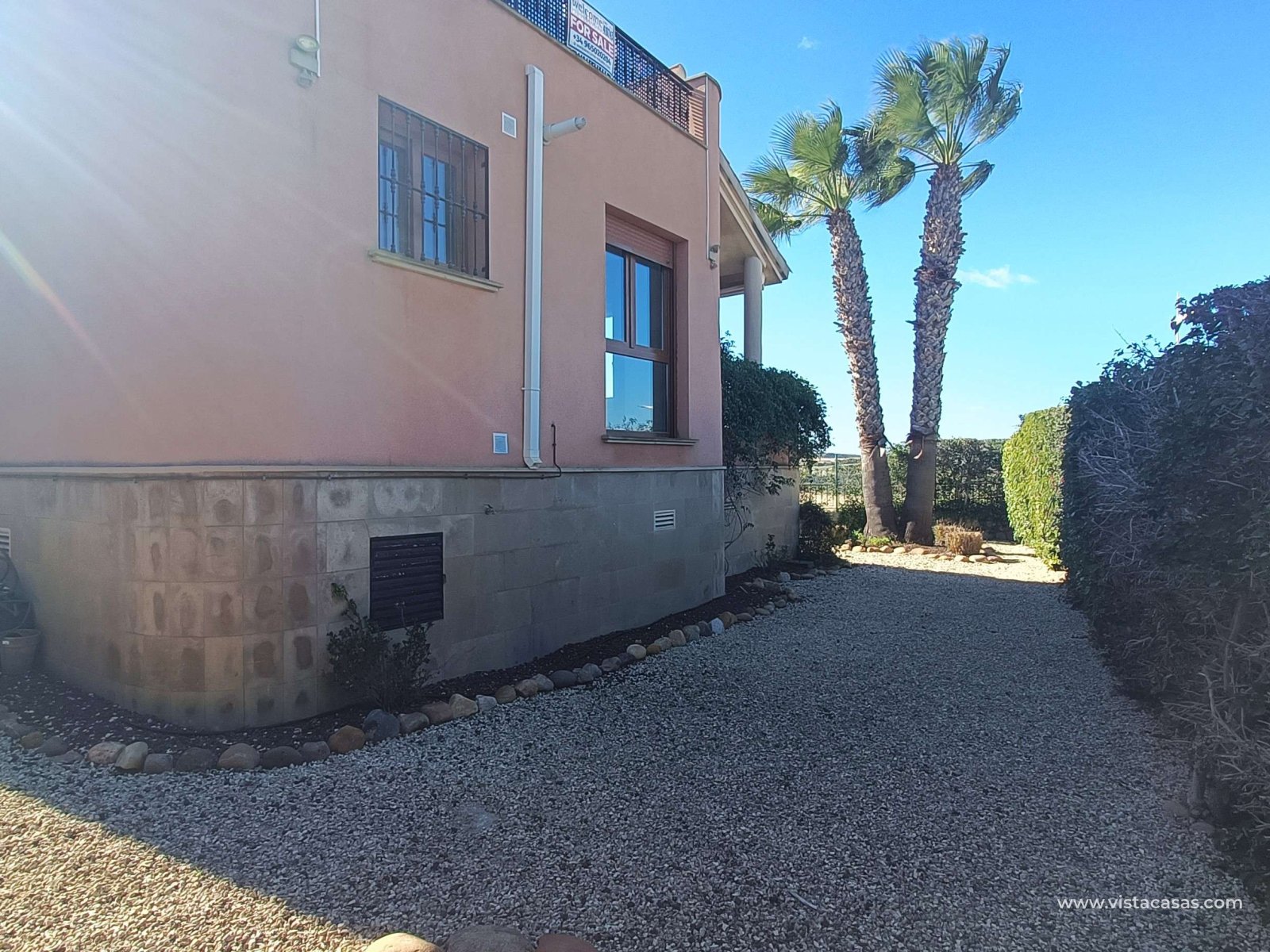 The property sits on a corner plot with dual aspect views, and offers off road car parking on your own private drive. As you walk into this large villa, you have a cloakroom to your left, as you continue to walk forward you enter a large lounge living area, which is a great space to relax, with a feature fireplace. As you continue to walk on, you come into the dining area, which is large enough for entertaining when your friends round for dinner, to the right of this you have a well laid out kitchen with all the appliances you would expect in a property like this. Moving back to the dining area there are glass sliding doors that take you out to a covered terrace, which is ideal for alfresco dining while taking in the stunning views and watching the sunset, this also benefits by having an awning if you need some extra shade. There are steps down to the garden area, which is laid with gravel for easy maintenance, plus there is planting, which adds colour throughout the year.