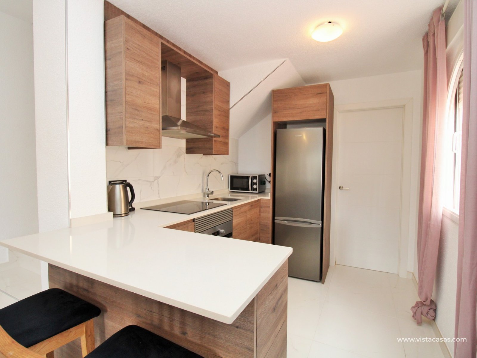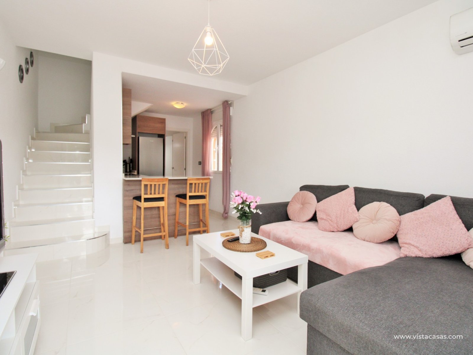 The property welcomes you with a sunny front terrace, perfect for enjoying the Mediterranean climate. Inside you will find a bright and airy lounge with an open modern kitchen, offering a practical and inviting living space.