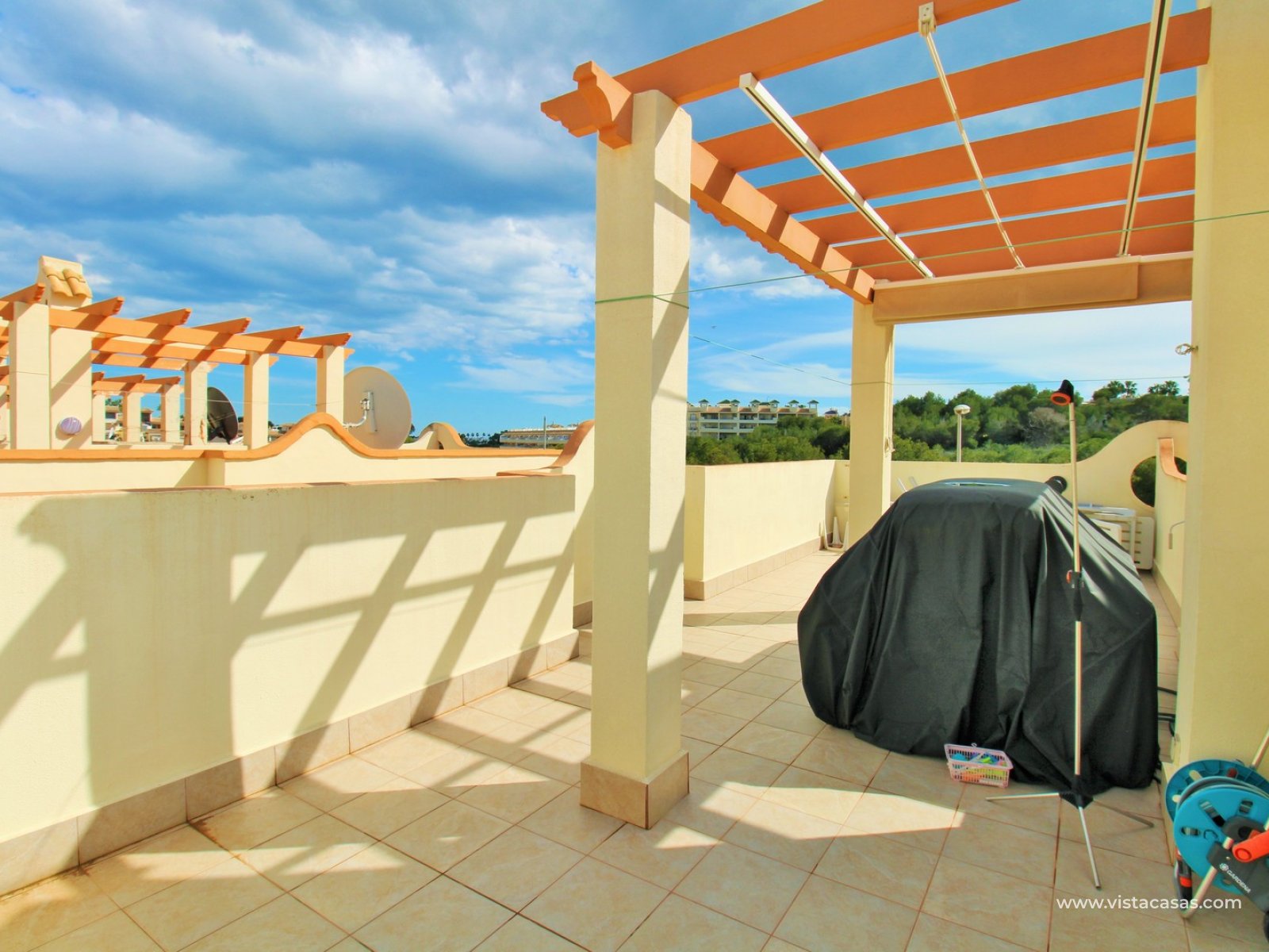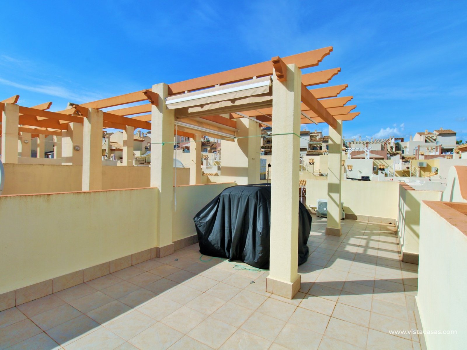 The private roof solarium has views of the communal swimming pool area and includes a retractable awning (toldo), ideal for relaxing or entertaining.