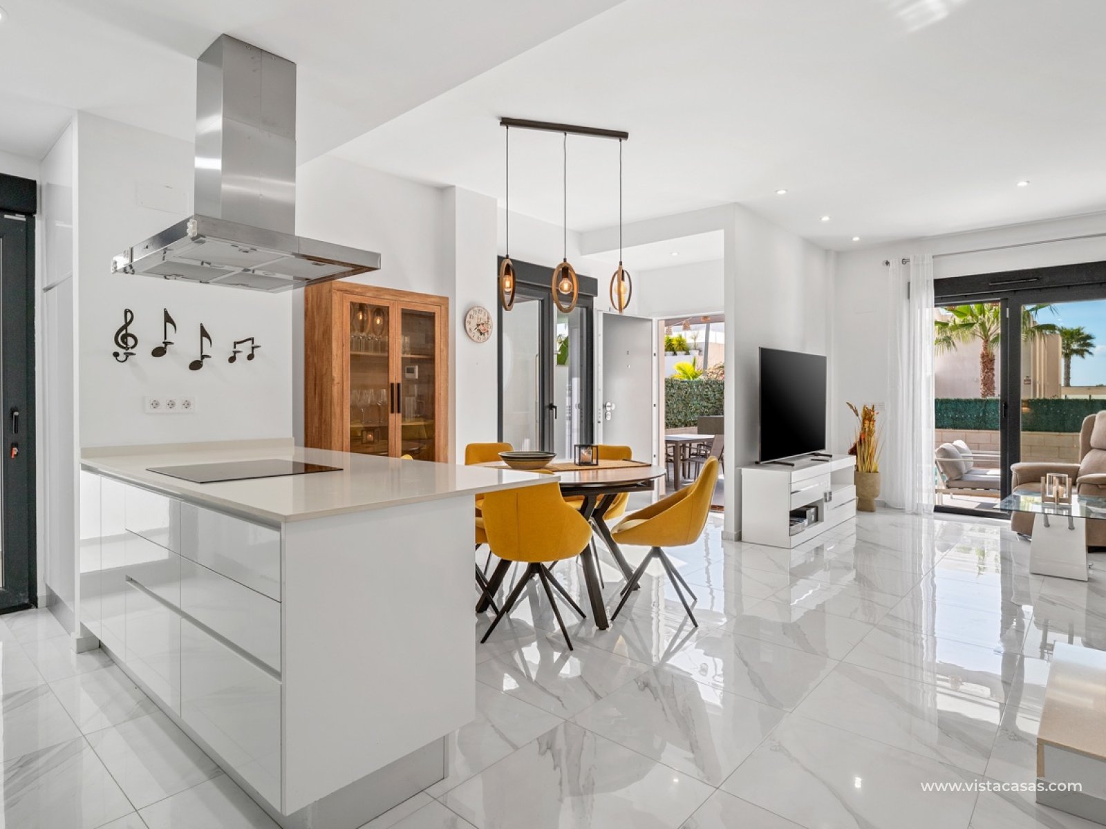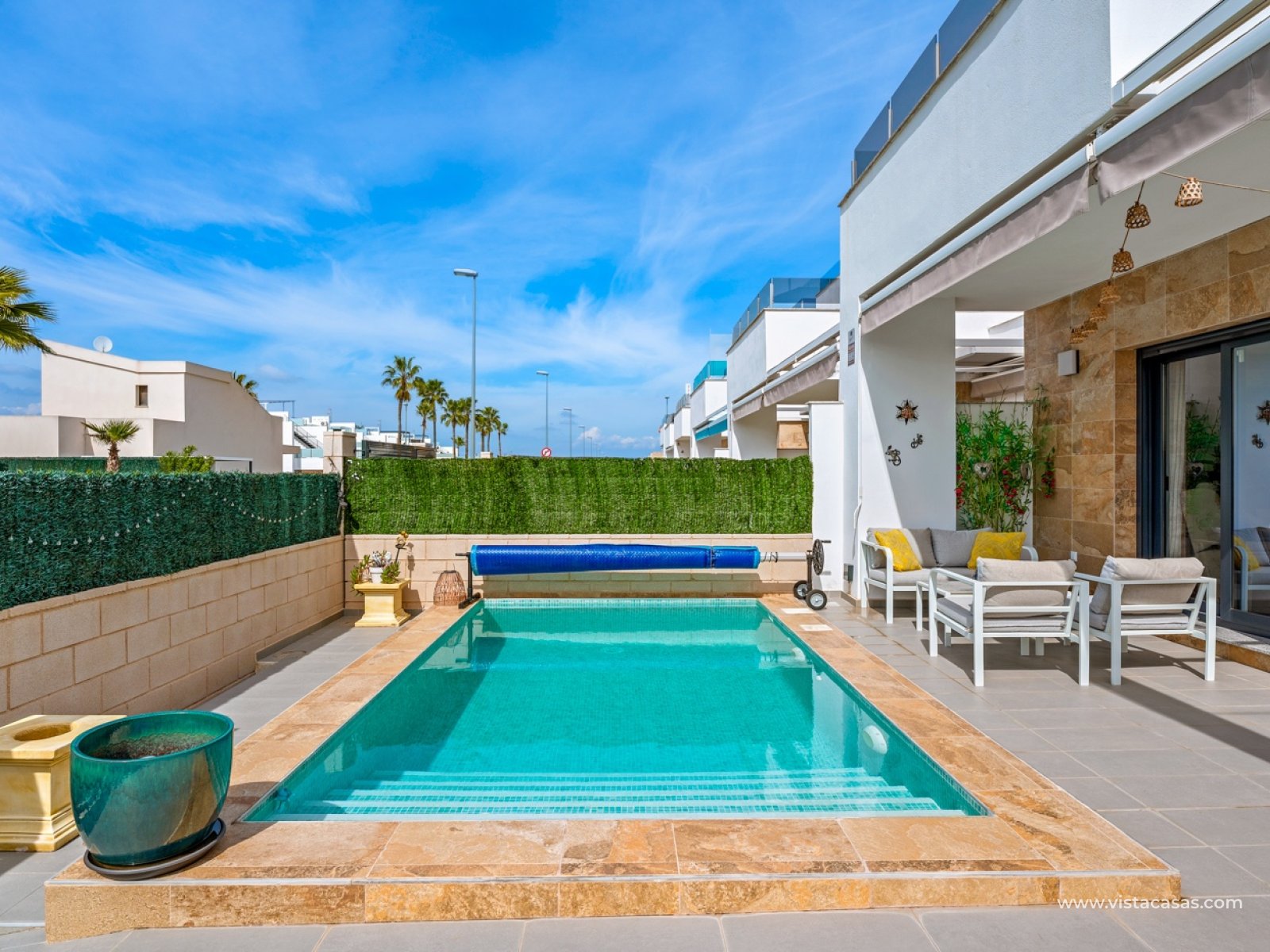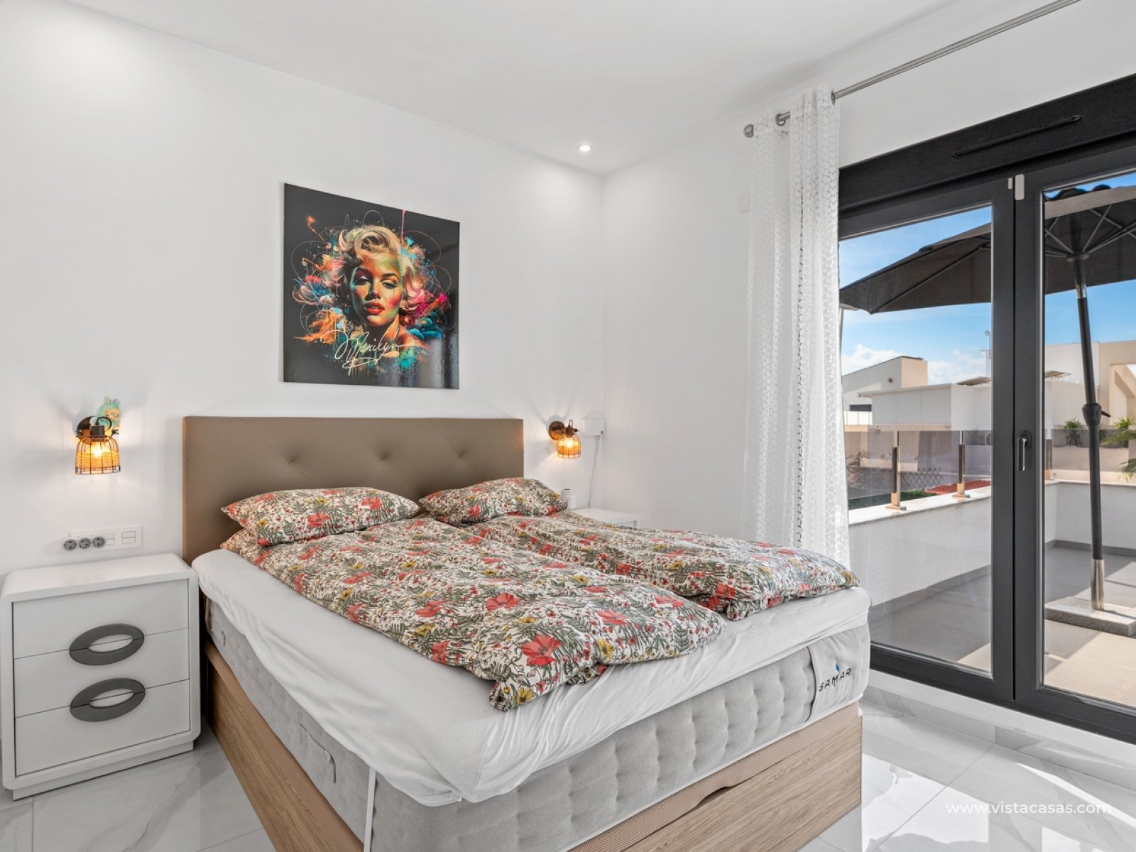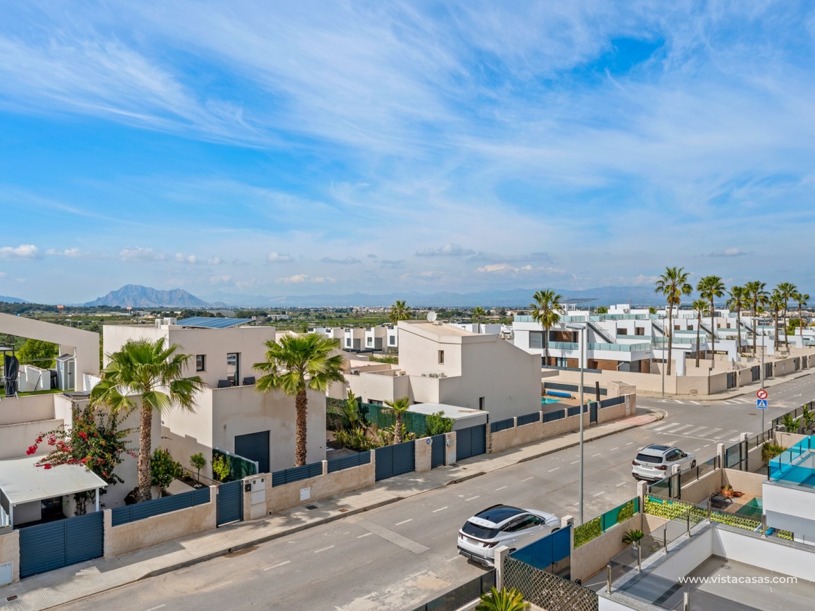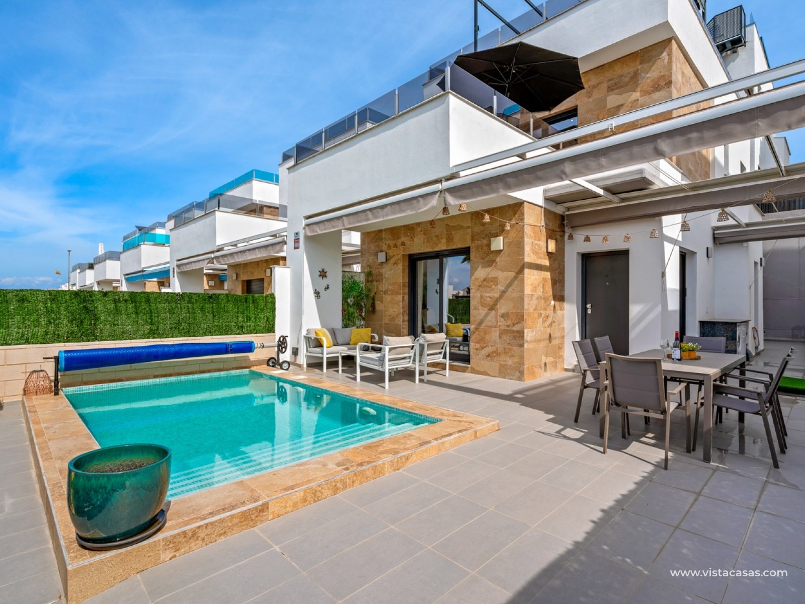 This modern 3-bedroom villa in Benijófar was built in 2023 and offers a stylish design, private heated pool, and excellent outdoor spaces. The property has a total built area of 111 m² distributed over two floors and consists of 3 double bedrooms and 3 bathrooms. On the main floor, you will find one double bedroom, a bathroom, and a bright open-plan kitchen, dining area and living room. Large sliding doors from the living room provide direct access to the garden and pool area, creating a seamless indoor-outdoor living experience. On the first floor, there are two spacious double bedrooms, both with en-suite bathrooms. The master bedroom has access to a private terrace, and from this level you also have access to the large roof terrace. The villa was completed in 2023 and is equipped with several modern features, including: Central air conditioning (hot and cold)Underfloor heating in the living room and all bathroomsOsmosis water filtration system in the kitchenFitted wardrobes in all bedroomsSolar panels for both hot water and electricity Outdoor AreaThe property sits on a west-facing plot with a beautifully designed outdoor space. The garden features a private heated swimming pool, outdoor seating and dining areas, and private parking on the plot with an automatic gate. There is also a utility area with workbench and an additional storage area. Several awnings have been installed to provide shade during the warmer summer months. In addition to the garden, the villa offers a terrace on the first floor and a spacious roof terrace with mountain views. This area provides plenty of space for relaxing and entertaining, with both tiled and artificial grass areas as well as a large awning for shade. LocationThe villa is located within walking distance of the main street in Benijófar, where you will find a wide range of amenities including restaurants, cafés, shops and services.