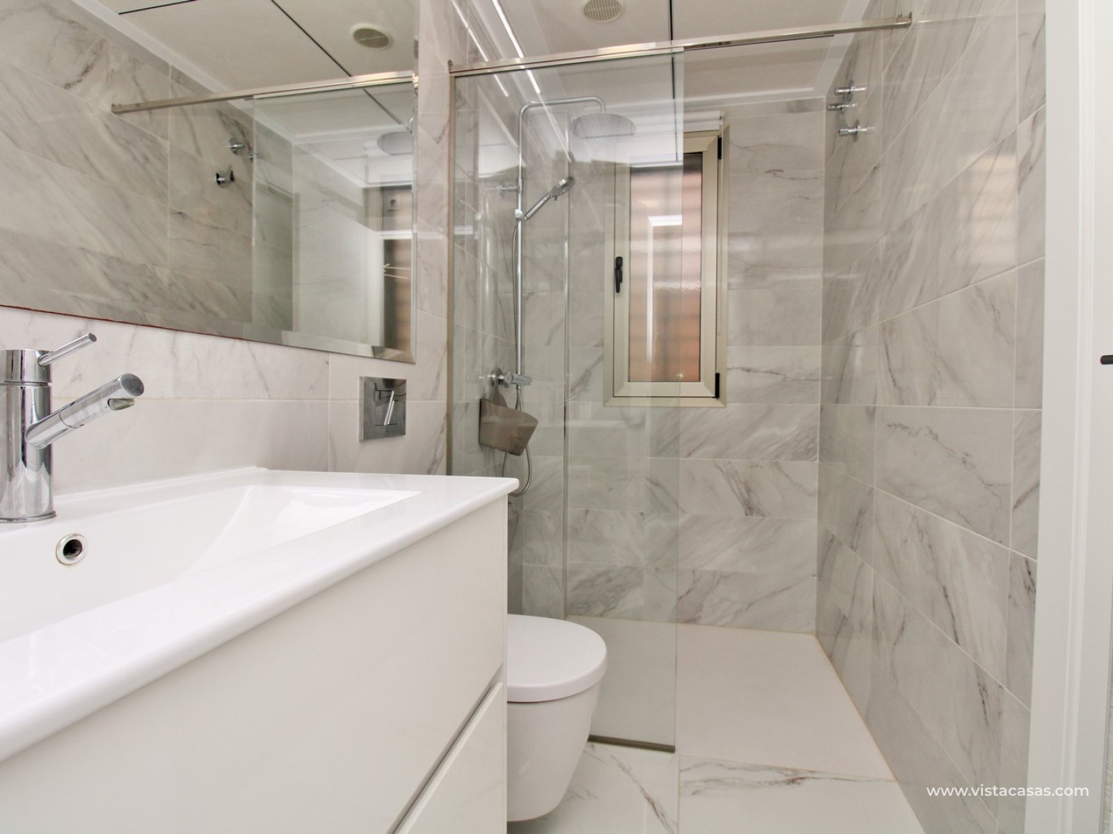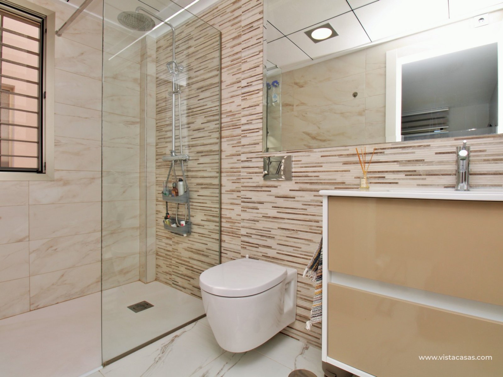 Upstairs, you’ll find two further double bedrooms, both with fitted wardrobes and en-suite bathrooms. Each bedroom also has direct access to a sunny terrace, offering a perfect spot to start the day or unwind in the evening.