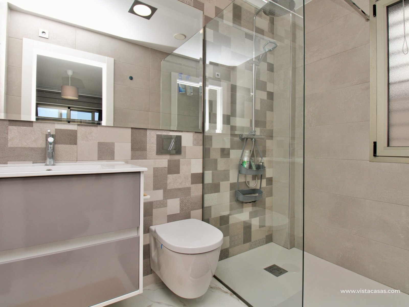 Inside, the villa has a bright and contemporary feel throughout. The open-plan living and dining area flows naturally into a sleek modern kitchen, creating a sociable and practical living space. On this level, there is also a double bedroom with fitted wardrobes and access to a Jack and Jill bathroom, ideal for guests or ground-floor living.