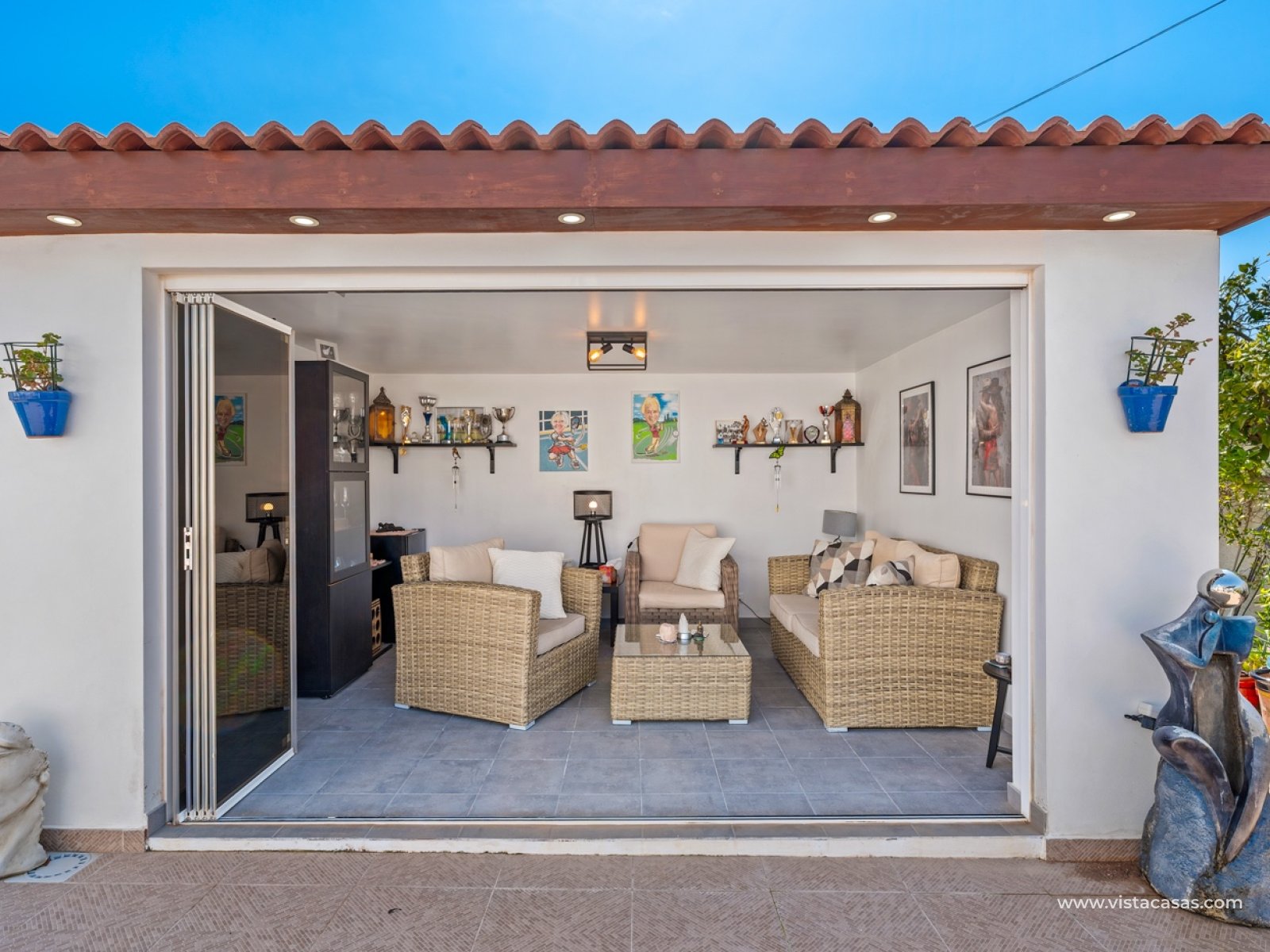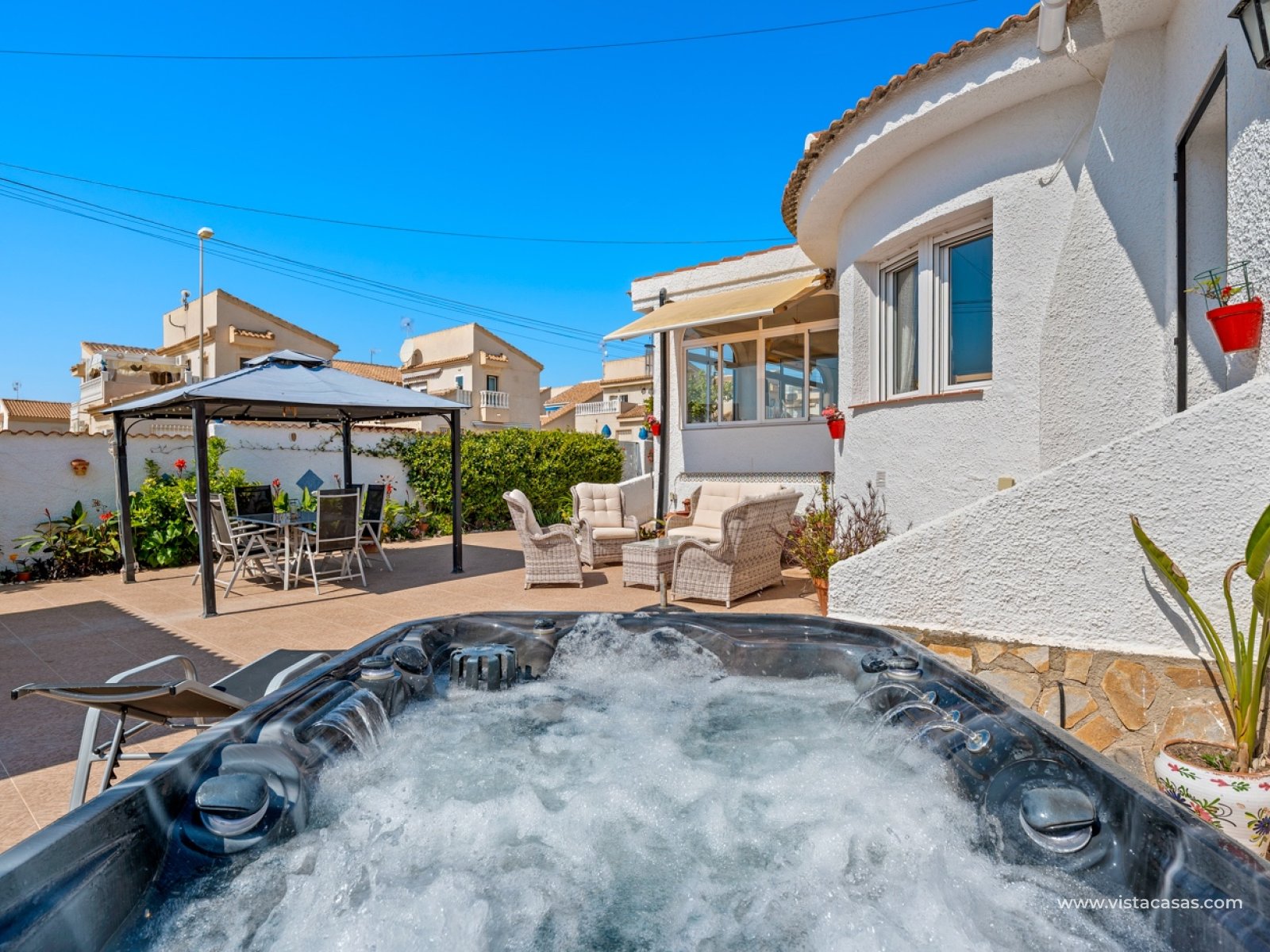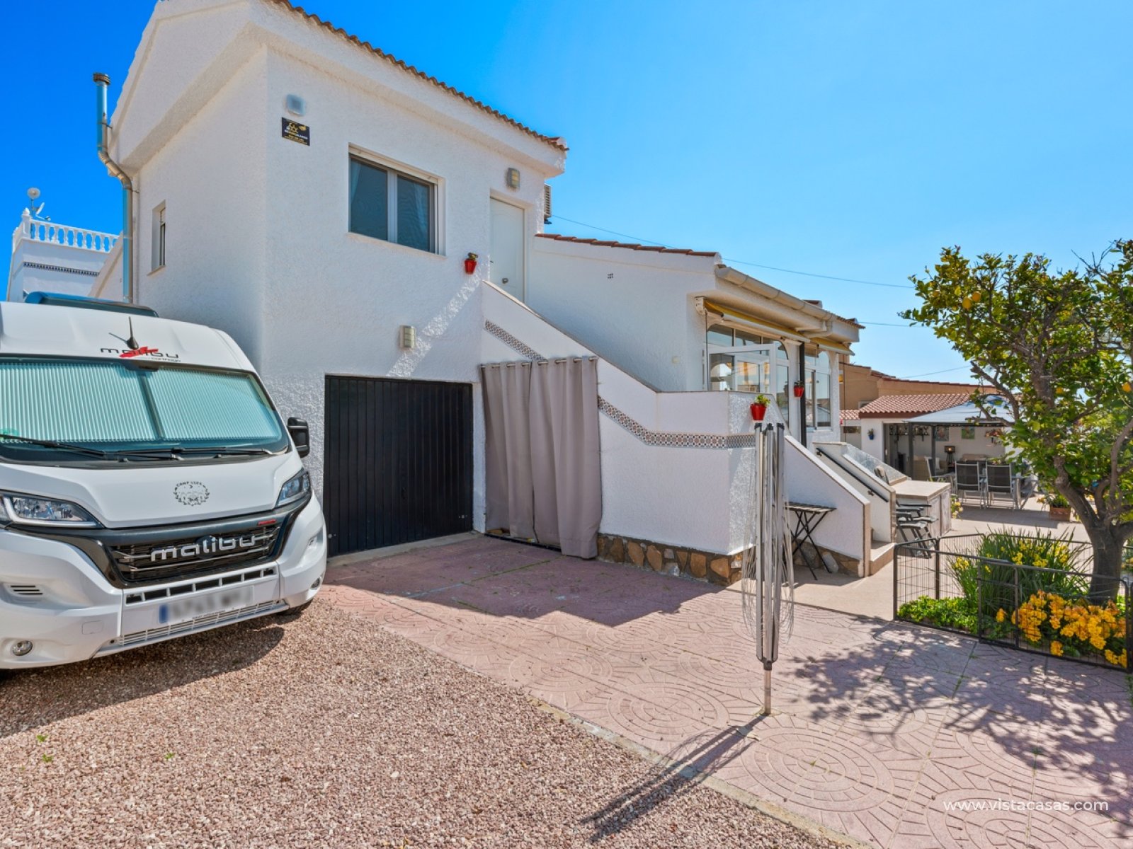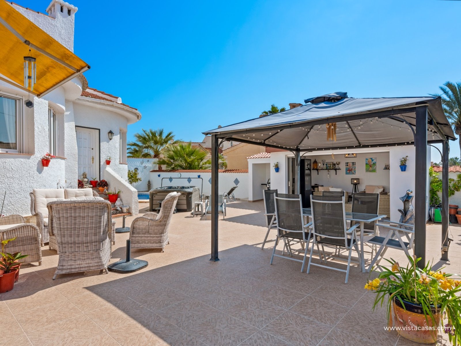 This charming home sits on a spacious 500 m² plot, offering an ideal setting for tranquility and comfort. The main house, with 104 m² of living space, is designed to make the most of every inch, combining functionality and style. It features two cozy bedrooms and two full bathrooms, one of which is en-suite in the master bedroom, providing added privacy and convenience. The house boasts a large, modern kitchen, seamlessly integrated with a spacious dining room, creating an ideal atmosphere for gatherings with friends and family. Just beyond the dining room is a bright living room, perfect for relaxing and enjoying everyday life. The property also includes a conservatory, adding extra living space filled with natural light. Above the main house is a practical guest apartment with independent access from the outside. This open-plan space includes a bedroom and kitchen area in a single room, as well as a full bathroom with a shower, making it a perfect option for guests or even for independent use. The property features a beautiful garden, a summer house, a barbecue area, a lovely swimming pool, and a jacuzzi—ideal for enjoying the pleasant climate year-round. It also includes a closed garage and additional space within the plot for parking several vehicles. As for the amenities, the main house is equipped with oil-fired central heating, radiators throughout, and air conditioning in various rooms, ensuring comfort all year round. It also features a wheelchair-accessible ramp at the main entrance.This is a very well-maintained property, ready to move into and enjoy from day one.