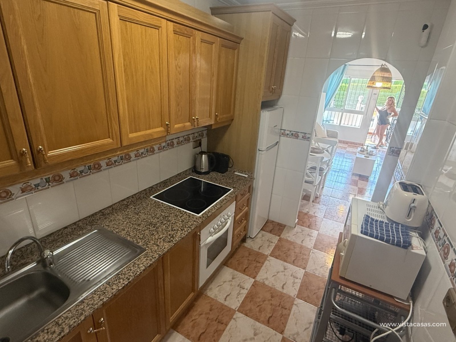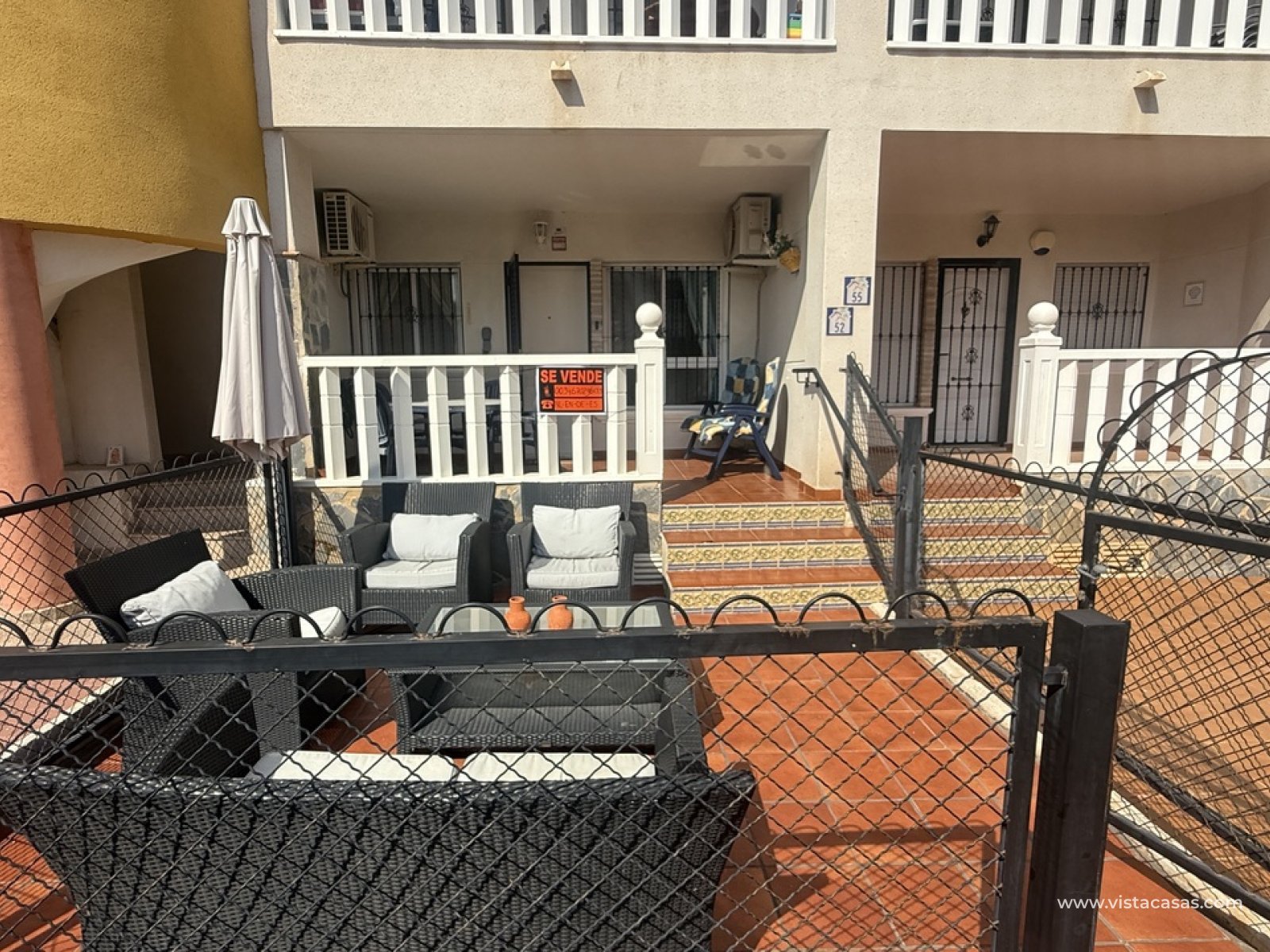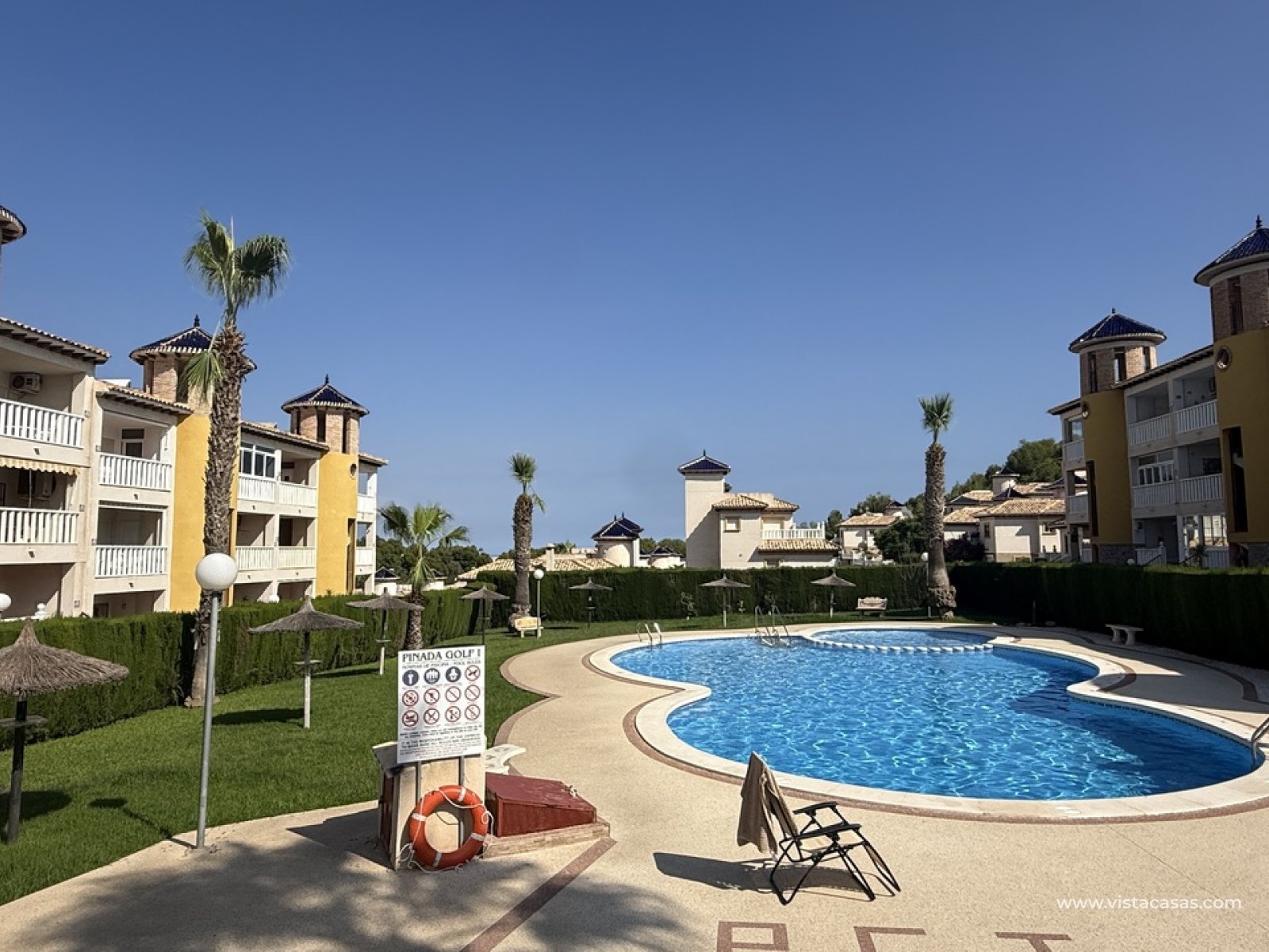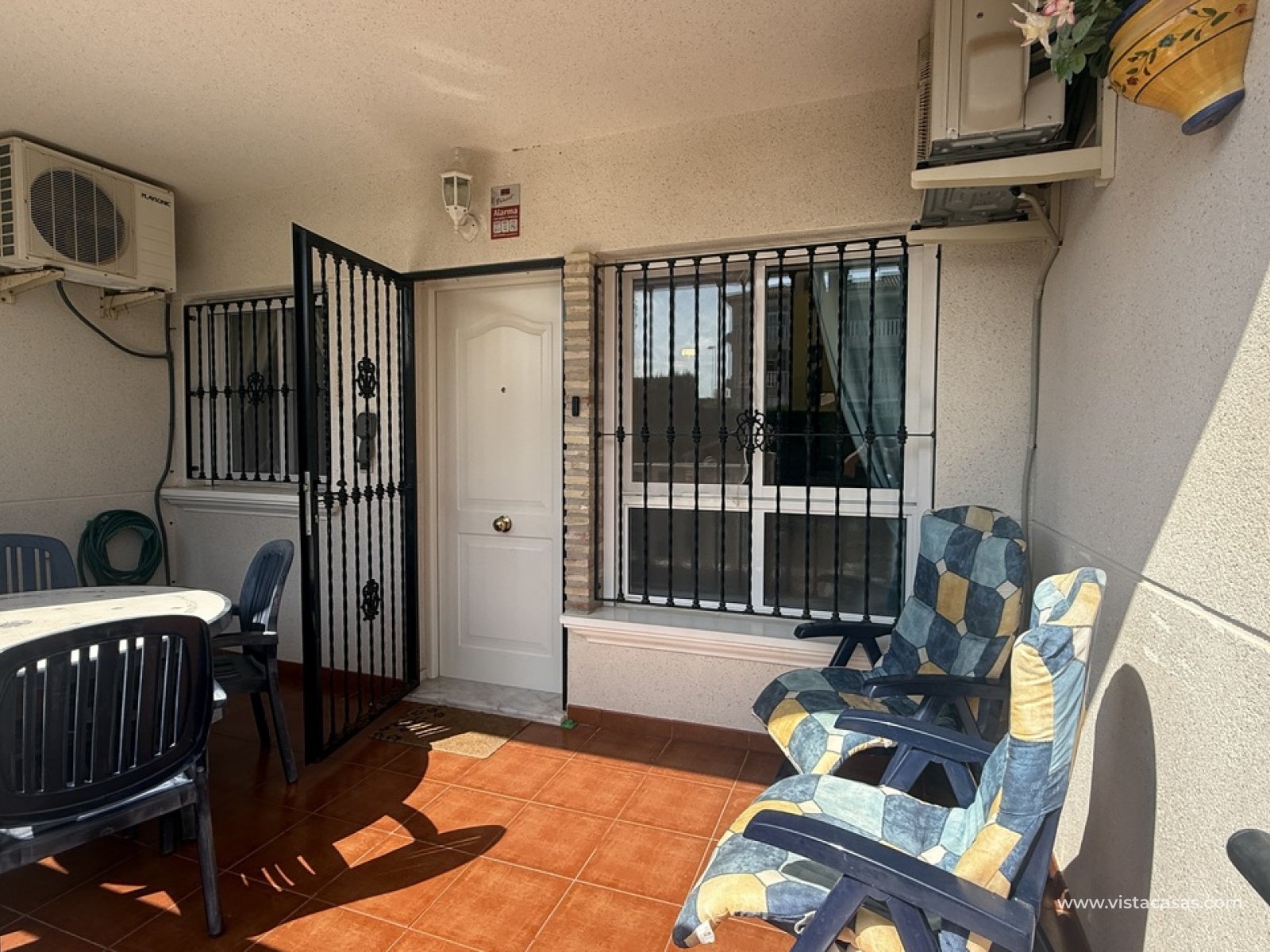 South facing ground floor apartment with two bedrooms in Villamartin (Orihuela Costa) Alicante. This beautiful property will be sold fully furnished with recent updates, such as a bright living/dining room (renovated in 2023), a separate kitchen with back patio, two Ibiza-style bedrooms, two en-suite bathrooms, air conditioning, a south facing front terrace with veranda. Located in a quiet urbanisation with a communal garden with swimming pool behind a green hedge (open year-round). Ideal for golf, beach lifestyle, or as a second home/investment.